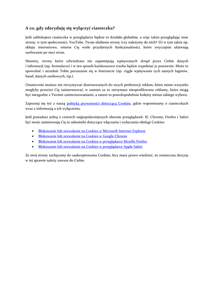 A co, gdy zdecyduję się wyłączyć ciasteczka? Jeśli zablokujesz ciasteczka w przeglądarce będzie to działało globalnie, a więc także przeglądając inne strony, w tym społeczności, YouTube, Twoje ulubione strony (czy należymy do nich? ) w tym także np. sklepy internetowe, ominie Cię wiele przydatnych funkcjonalności, które zwyczajnie ułatwiają surfowanie po sieci stron. Niestety, strony które odwiedzasz nie zapamiętają wpisywanych dotąd przez Ciebie danych i informacji (np. formularze) i w ten sposób każdorazowo trzeba będzie wypełniać je ponownie. Może to spowolnić i utrudnić Tobie poruszanie się w Internecie (np. ciągłe wpisywanie tych samych loginów, haseł, danych osobowych, itp.). Ostatecznie możesz nie otrzymywać dostosowanych do swych preferencji reklam, które mimo wszystko mogłyby przecież Cię zainteresować, w zamian za to otrzymasz niesprofilowane reklamy, które mogą być niezgodne z Twoimi zainteresowaniami, a zatem to prawdopodobnie kolejny minus takiego wyboru. Zapoznaj się też z naszą polityką prywatności dotyczącą Cookies, gdzie wspominamy o ciasteczkach wraz z informacją o ich wyłączeniu. Jeśli posiadasz jedną z czterech najpopularniejszych obecnie przeglądarek: IE, Chrome, Firefox i Safari być może zainteresują Cię te odnośniki dotyczące włączania i wyłaczania obsługi Cookies: Blokowanie lub zezwalanie na Cookies w Microsoft Internet Explorer Blokowanie lub zezwalanie na Cookies w Google Chrome Blokowanie lub zezwalanie na Cookies w przeglądarce Mozilla Firefox Blokowanie lub zezwalanie na Cookies w przeglądarce Apple Safari Ze swej strony zachęcamy do zaakceptowania Cookies, lecz masz prawo wiedzieć, że ostateczna decyzja w tej sprawie należy zawsze do Ciebie.
