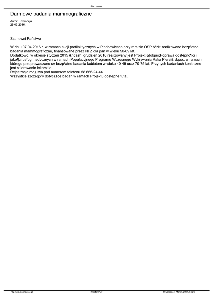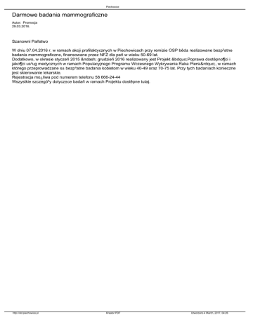 Piechowice Darmowe badania mammograficzne Autor: Promocja 29.03.2016. Szanowni Pañstwo W dniu 07.04.2016 r. w ramach akcji profilaktycznych w Piechowicach przy remizie OSP bêd± realizowane bezp³atne badania mammograficzne, finansowane przez NFZ dla pañ w wieku 50-69 lat. Dodatkowo, w okresie styczeñ 2015 – grudzieñ 2016 realizowany jest Projekt „Poprawa dostêpno¶ci i jako¶ci us³ug medycznych w ramach Populacyjnego Programu Wczesnego Wykrywania Raka Piersi”, w ramach którego przeprowadzane s± bezp³atne badania kobietom w wieku 40-49 oraz 70-75 lat. Przy tych badaniach konieczne jest skierowanie lekarskie. Rejestracja mo¿liwa pod numerem telefonu 58 666-24-44 Wszystkie szczegó³y dotycz±ce badañ w ramach Projektu dostêpne tutaj. http://old.piechowice.pl Kreator PDF Utworzono 4 March, 2017, 04:26