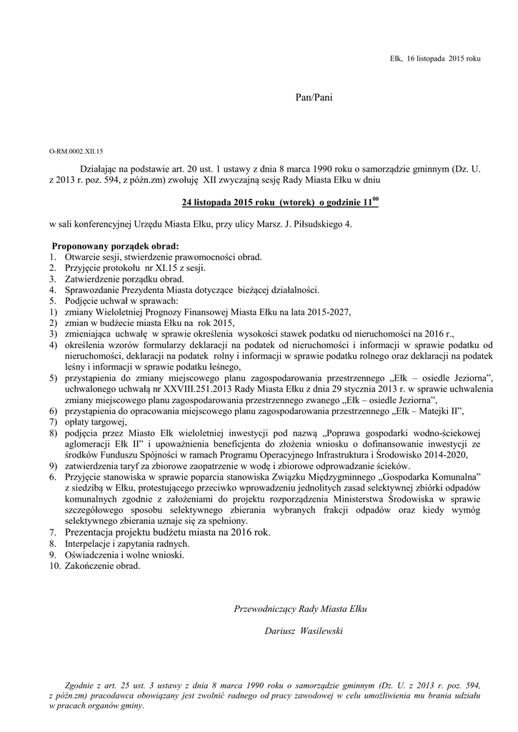Ełk, 16 listopada 2015 roku Pan/Pani O-RM.0002.XII.15 Działając na podstawie art. 20 ust. 1 ustawy z dnia 8 marca 1990 roku o samorządzie gminnym (Dz. U. z 2013 r. poz. 594, z późn.zm) zwołuję XII zwyczajną sesję Rady Miasta Ełku w dniu 24 listopada 2015 roku (wtorek) o godzinie 1100 w sali konferencyjnej Urzędu Miasta Ełku, przy ulicy Marsz. J. Piłsudskiego 4. Proponowany porządek obrad: 1. Otwarcie sesji, stwierdzenie prawomocności obrad. 2. Przyjęcie protokołu nr XI.15 z sesji. 3. Zatwierdzenie porządku obrad. 4. Sprawozdanie Prezydenta Miasta dotyczące bieżącej działalności. 5. Podjęcie uchwał w sprawach: 1) zmiany Wieloletniej Prognozy Finansowej Miasta Ełku na lata 2015-2027, 2) zmian w budżecie miasta Ełku na rok 2015, 3) zmieniająca uchwałę w sprawie określenia wysokości stawek podatku od nieruchomości na 2016 r., 4) określenia wzorów formularzy deklaracji na podatek od nieruchomości i informacji w sprawie podatku od nieruchomości, deklaracji na podatek rolny i informacji w sprawie podatku rolnego oraz deklaracji na podatek leśny i informacji w sprawie podatku leśnego, 5) przystąpienia do zmiany miejscowego planu zagospodarowania przestrzennego „Ełk – osiedle Jeziorna”, uchwalonego uchwałą nr XXVIII.251.2013 Rady Miasta Ełku z dnia 29 stycznia 2013 r. w sprawie uchwalenia zmiany miejscowego planu zagospodarowania przestrzennego zwanego „Ełk – osiedle Jeziorna”, 6) przystąpienia do opracowania miejscowego planu zagospodarowania przestrzennego „Ełk – Matejki II”, 7) opłaty targowej, 8) podjęcia przez Miasto Ełk wieloletniej inwestycji pod nazwą „Poprawa gospodarki wodno-ściekowej aglomeracji Ełk II” i upoważnienia beneficjenta do złożenia wniosku o dofinansowanie inwestycji ze środków Funduszu Spójności w ramach Programu Operacyjnego Infrastruktura i Środowisko 2014-2020, 9) zatwierdzenia taryf za zbiorowe zaopatrzenie w wodę i zbiorowe odprowadzanie ścieków. 6. Przyjęcie stanowiska w sprawie poparcia stanowiska Związku Międzygminnego „Gospodarka Komunalna” z siedzibą w Ełku, protestującego przeciwko wprowadzeniu jednolitych zasad selektywnej zbiórki odpadów komunalnych zgodnie z założeniami do projektu rozporządzenia Ministerstwa Środowiska w sprawie szczegółowego sposobu selektywnego zbierania wybranych frakcji odpadów oraz kiedy wymóg selektywnego zbierania uznaje się za spełniony. 7. Prezentacja projektu budżetu miasta na 2016 rok. 8. Interpelacje i zapytania radnych. 9. Oświadczenia i wolne wnioski. 10. Zakończenie obrad. Przewodniczący Rady Miasta Ełku Dariusz Wasilewski Zgodnie z art. 25 ust. 3 ustawy z dnia 8 marca 1990 roku o samorządzie gminnym (Dz. U. z 2013 r. poz. 594, z późn.zm) pracodawca obowiązany jest zwolnić radnego od pracy zawodowej w celu umożliwienia mu brania udziału w pracach organów gminy.