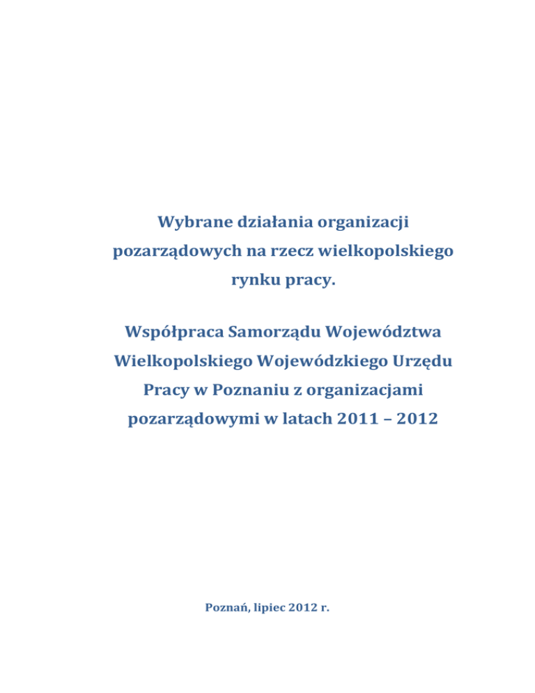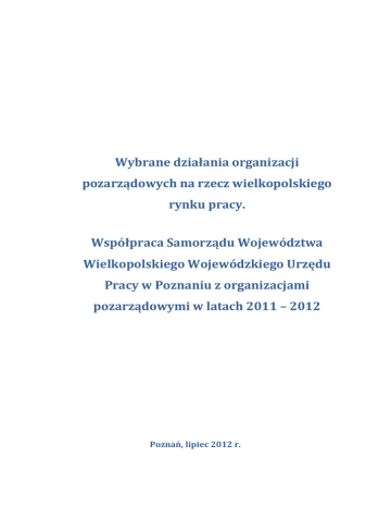 Wybrane działania organizacji pozarządowych na rzecz wielkopolskiego rynku pracy. Współpraca Samorządu Województwa Wielkopolskiego Wojewódzkiego Urzędu Pracy w Poznaniu z organizacjami pozarządowymi w latach 2011 – 2012 Poznań, lipiec 2012 r. I. Co to są organizacje pozarządowe? Organizacje pozarządowe (NGO - non-governmental organization) to wszystkie podmioty, które nie są organami lub jednostkami podległymi administracji publicznej (rządowej i samorządowej) oraz których działalność nie jest nastawiona na osiąganie zysku. Organizacje pozarządowe należą do tzw. „trzeciego sektora”, jest to nazwa stosowana wobec ogółu organizacji pozarządowych. Określenie to, przeniesione z języka angielskiego (third sector), nawiązuje do koncepcji podziału dzielącego aktywność społeczno-gospodarczą nowoczesnych państw demokratycznych na trzy sektory, tj.: publiczny, przedsiębiorstw oraz właśnie organizacje nie nastawione na zysk (non-profit)1. Organizacje pozarządowe charakteryzują się: istnieniem struktury organizacyjnej oraz formalną rejestracją, strukturalną niezależnością od władz publicznych, niezarobkowym charakterem, suwerennością i samorządnością, dobrowolnością przynależności. Jakie podmioty są organizacjami pozarządowymi? Są to: − nie będące jednostkami sektora finansów publicznych, w rozumieniu przepisów o finansach publicznych i niedziałające w celu osiągnięcia zysku, osoby prawne lub jednostki nie posiadające osobowości prawnej utworzone na podstawie przepisów ustaw, w tym fundacje i stowarzyszenia z zastrzeżeniem art. 3 ust. 4 ustawy o działalności pożytku publicznego i o wolontariacie, − osoby prawne i jednostki organizacyjne działające na podstawie przepisów o stosunku Państwa do Kościoła Katolickiego w Rzeczpospolitej Polskiej, o stosunku Państwa do innych kościołów i związków wyznaniowych oraz o gwarancjach wolności sumienia i wyznania, jeżeli ich cele statutowe obejmują prowadzenie działalności pożytku publicznego, − stowarzyszenia jednostek samorządu terytorialnego, − spółdzielnie socjalne, 1 www.ngo.pl 2 − spółki akcyjne i spółki z ograniczoną odpowiedzialnością oraz kluby sportowe będące spółkami działającymi na podstawie przepisów ustawy z dnia 25 czerwca 2010 r. o sporcie (Dz. U. Nr 127, poz. 857, z późn. zm.2), które nie działają w celu osiągnięcia zysku oraz przeznaczają całość dochodu na realizację celów statutowych oraz nie przeznaczają zysku do podziału między swoich udziałowców, akcjonariuszy i pracowników2. II. Podstawa prawna Działalność organizacji pozarządowych reguluje ustawa z dnia 24 kwietnia 2003 r. o działalności pożytku publicznego i o wolontariacie (Dz. U. z 2010 r. Nr 234, poz. 1536 z późn. zm.). III. NGO w Wielkopolsce W celu wspierania wielkopolskich NGO, został utworzony Zespół Konsultacyjno – Opiniujący ds. współpracy z organizacjami pozarządowymi. W skład Zespołu, powołanego Zarządzeniem Marszałka Województwa Wielkopolskiego, wchodzą przedstawiciele Departamentów Urzędu Marszałkowskiego Województwa Wielkopolskiego oraz podległych jednostek organizacyjnych. Do zadań Zespołu należą: o ujednolicanie procedur postępowań konkursowych, o konsultowanie treści ogłoszeń konkursowych na realizację zadań publicznych, o współdziałanie przy tworzeniu rocznego programu współpracy z organizacjami pozarządowymi, o wymiana doświadczeń w ramach współpracy poszczególnych departamentów z organizacjami pozarządowymi, o inicjowanie form współpracy z organizacjami pozarządowymi, o promowanie współpracy Samorządu Województwa Wielkopolskiego z organizacjami pozarządowymi, o uczestnictwo w szkoleniach, spotkaniach, seminariach, konferencjach i innych przedsięwzięciach realizowanych przez organizacje pozarządowe oraz ich organizacja lub współorganizacja, 2 Art.3 ustawy z dnia 24 kwietnia 2003 r. o działalności pożytku publicznego i o wolontariacie (Dz. U. z 2010 r. Nr 234, poz. 1536 z późn. zm.). 3 o wypracowanie praktyki współpracy z wolontariuszami przy realizacji zadań, o koordynowanie współpracy z departamentami. Ponadto, w ramach wspierania działalności NGO w regionie, utworzony został w siedzibie Urzędu Marszałkowskiego Województwa Wielkopolskiego Punkt Konsultacyjny UMWW dla Organizacji Pozarządowych. Punkt mieści się w Poznaniu przy Al. Niepodległości 16/18, budynek „B”. Organizacje pozarządowe działające na terenie Wielkopolski mogą w nim bezpłatnie uzyskać informacje i porady w zakresie zagadnień prawnych oraz finansowo-księgowych. Pomoc udzielana jest bezpośrednio podczas indywidualnej wizyty na miejscu, jak również drogą elektroniczną, telefoniczną lub za pośrednictwem faxu. IV. Współpraca Samorządu Województwa Wielkopolskiego z organizacjami pozarządowymi Dokumentem określającym podstawy tej współpracy, jest tworzony corocznie Program współpracy Samorządu Województwa Wielkopolskiego z organizacjami pozarządowymi oraz innymi podmiotami działającymi w sferze działalności pożytku publicznego. Program określa następujące cele: a) główne: rozwijanie potencjału społeczności lokalnej, włączenie organizacji pozarządowych w realizację zadań publicznych, zrównoważony rozwój, b) szczegółowe: umacnianie podmiotowości obywateli i zwiększenie wpływu sektora obywatelskiego na kreowanie polityki społecznej, kulturalnej, gospodarczej w Województwie, wykorzystanie potencjału społeczeństwa obywatelskiego w poszerzaniu oferty świadczonych usług oraz lepsze dostosowanie ich do potrzeb mieszkańców Województwa, budowanie spójnych i funkcjonalnych społeczności poprzez umocnienie lokalnych działań, stworzenie warunków dla powstania inicjatyw i struktur funkcjonujących na rzecz społeczności lokalnych, 4 poprawa funkcjonowania organizacji pozarządowych poprzez pobudzanie organizacji poza