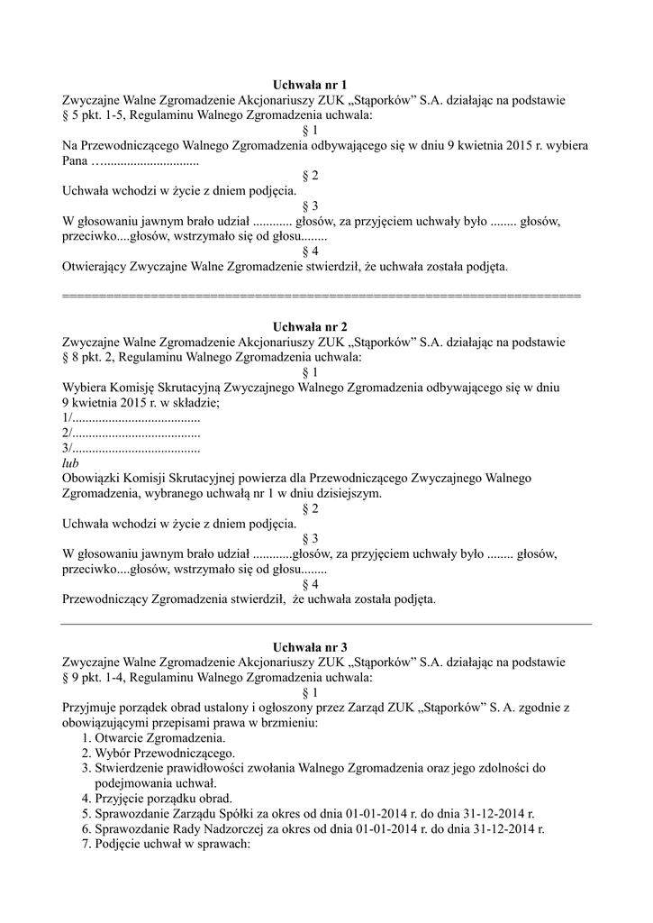 Uchwała nr 1 Zwyczajne Walne Zgromadzenie Akcjonariuszy ZUK „Stąporków” S.A. działając na podstawie § 5 pkt. 1-5, Regulaminu Walnego Zgromadzenia uchwala: §1 Na Przewodniczącego Walnego Zgromadzenia odbywającego się w dniu 9 kwietnia 2015 r. wybiera Pana …............................. §2 Uchwała wchodzi w życie z dniem podjęcia. §3 W głosowaniu jawnym brało udział ............ głosów, za przyjęciem uchwały było ........ głosów, przeciwko....głosów, wstrzymało się od głosu........ §4 Otwierający Zwyczajne Walne Zgromadzenie stwierdził, że uchwała została podjęta. ====================================================================== Uchwała nr 2 Zwyczajne Walne Zgromadzenie Akcjonariuszy ZUK „Stąporków” S.A. działając na podstawie § 8 pkt. 2, Regulaminu Walnego Zgromadzenia uchwala: §1 Wybiera Komisję Skrutacyjną Zwyczajnego Walnego Zgromadzenia odbywającego się w dniu 9 kwietnia 2015 r. w składzie; 1/....................................... 2/....................................... 3/....................................... lub Obowiązki Komisji Skrutacyjnej powierza dla Przewodniczącego Zwyczajnego Walnego Zgromadzenia, wybranego uchwałą nr 1 w dniu dzisiejszym. §2 Uchwała wchodzi w życie z dniem podjęcia. §3 W głosowaniu jawnym brało udział ............głosów, za przyjęciem uchwały było ........ głosów, przeciwko....głosów, wstrzymało się od głosu........ §4 Przewodniczący Zgromadzenia stwierdził, że uchwała została podjęta. Uchwała nr 3 Zwyczajne Walne Zgromadzenie Akcjonariuszy ZUK „Stąporków” S.A. działając na podstawie § 9 pkt. 1-4, Regulaminu Walnego Zgromadzenia uchwala: §1 Przyjmuje porządek obrad ustalony i ogłoszony przez Zarząd ZUK „Stąporków” S. A. zgodnie z obowiązującymi przepisami prawa w brzmieniu: 1. Otwarcie Zgromadzenia. 2. Wybór Przewodniczącego. 3. Stwierdzenie prawidłowości zwołania Walnego Zgromadzenia oraz jego zdolności do podejmowania uchwał. 4. Przyjęcie porządku obrad. 5. Sprawozdanie Zarządu Spółki za okres od dnia 01-01-2014 r. do dnia 31-12-2014 r. 6. Sprawozdanie Rady Nadzorczej za okres od dnia 01-01-2014 r. do dnia 31-12-2014 r. 7. Podjęcie uchwał w sprawach: 1/ zatwierdzenia sprawozdania Zarządu za okres od 01-01-2014 r. do dnia 31-12-2014 r. 2/ zatwierdzenia sprawozdania finansowego za rok obrotowy 2014, 3/ podziału zysku za rok obrotowy 2014. 4/ zatwierdzenia sprawozdania Rady Nadzorczej za rok obrotowy 2014, 5/ udzielenia absolutorium członkom Zarządu za rok obrotowy 2014, 6/ udzielenia absolutorium członkom Rady Nadzorczej za rok obrotowy 2014, 7/ ustalenie zasad wynagradzania członków Rady Nadzorczej 8. Zakończenie i zamknięcie obrad Walnego Zgromadzenia. §2 Uchwała wchodzi w życie z dniem podjęcia. §3 W głosowaniu jawnym brało udział …....głosów, za przyjęciem uchwały było ....głosów, przeciwko ….....głosów, wstrzymało się od głosu........ §4 Przewodniczący stwierdził, że uchwała została podjęta. ======================================================================= Uchwała nr 4 Zwyczajne Walne Zgromadzenie Akcjonariuszy ZUK „Stąporków” S.A. działając na podstawie art. 393 pkt. 1 i art. 395 § 2 pkt. 1 Kodeksu spółek handlowych oraz § 18 pkt. 1 statutu Spółki uchwala: §1 Zatwierdza sprawozdanie z działalności za okres od dnia 01-01-2014 r. do dnia 31-12-2014 r. §2 Uchwała wchodzi w życie z dniem podjęcia. §3 W głosowaniu jawnym brało udział ............głosów, za przyjęciem uchwały było ........ głosów, przeciwko....głosów, wstrzymało się od głosu......... §4 Przewodniczący Zgromadzenia stwierdził, że uchwała została podjęta. Uchwała nr 5 Zwyczajne Walne Zgromadzenie Akcjonariuszy ZUK „Stąporków” S.A. działając na podstawie art. 393 pkt. 1 i art. 395 § 2 pkt. 1 Kodeksu spółek handlowych oraz § 18 pkt. 1 statutu Spółki uchwala: §1 Zatwierdza sprawozdanie finansowe Spółki za rok obrotowy 2014, na które składają się: 1) wprowadzenie do sprawozdania finansowego; 2) bilans sporządzony na dzień 31.12.2014 r., który po stronie aktywów i pasywów zamyka się sumą …............. zł 3) rachunek zysków i strat za rok obrotowy od 01.01.2014 r. do 31.12.2014 r. wykazujący zysk netto w wysokości …............... zł 4) zestawienie zmian w kapitale własnym za rok obrotowy od 01.01.2014 r. do 31.12.2014 r. wykazujące zwiększenie kapitału własnego o kwotę …....zł 5) rachunek przepływów pieniężnych za rok obrotowy od 01.01.2014 r. do 31.12.2014 r. wykazujący zwiększenie stanu środków pieniężnych o kwotę ….............. zł 6) dodatkowe informacje i objaśnienia. §2 Uchwała wchodzi w życie z dniem podjęcia. §3 W głosowaniu jawnym brało udział .........głosów, za przyjęciem uchwały było ......... głosów, przeciwko ........ głosów, wstrzymało się od głosu....... §4 Przewodniczący Zgromadzenia stwierdził, że uchwała została podjęta. ======================================================================= Uchwała nr 6 Zwyczajne Walne Zgromadzenie Akcjonariuszy ZUK „Stąporków” S.A. działając na podstawie art. 393 pkt. 1 i art. 395 § 2 pkt. 2 Kodeksu spółek handlowych oraz § 18 pkt. 3 statutu Spółki uchwala: §1 Zysk netto w kwocie …...... zł (…....................) przeznaczyć w całości na podwyższenie kapitału zapasowego. §2 Uchwała wchodzi w życie z dniem podjęcia. §3 W głosowaniu jawnym brało udział.......głosów, za przyjęciem uchwały było........głosów, przeciwko ..........głosów, wstrzymało się od głosu....... §4 Przewodniczący Zgromadzenia stwierdził, że uchwała została podjęta. Uchwała nr 7 Zwyczajne Walne Zgromadzenie Akcjonariuszy ZUK „Stąporków” S.A. działając na podstawie art. 393 pkt. 1 i art. 395 § 2 pkt. 1 Kodeksu spółek handlowych oraz § 18 pkt. 1 statutu Spółki uchwala: §1 Zatwierdza sprawozdanie Rady
