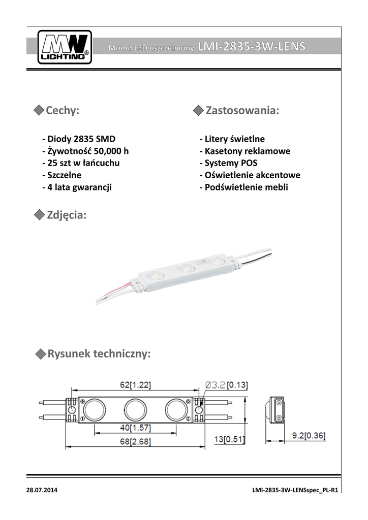 Moduł LED uszczelniony Cechy: - Diody 2835 SMD - Żywotność 50,000 h - 25 szt w łańcuchu - Szczelne - 4 lata gwarancji LMI-2835-3W-LENS Zastosowania: - Litery świetlne - Kasetony reklamowe - Systemy POS - Oświetlenie akcentowe - Podświetlenie mebli Zdjęcia: Rysunek techniczny: 28.07.2014 LMI-2835-3W-LENSspec_PL-R1 Moduł LED uszczelniony Zasilanie LMI-2835-3W-LENS Napięcie znamionowe 12Vdc +/- 5% Pobór mocy 0,72W Pobór prądu jednego modułu 0,06A Wymiary diod 2835 (3szt) W-biały (70lm) Barwa Światła (jasność) Diody Temperatura barwowa / długość fali. Podłączenie Przewody Właściwości Wymiary Montaż Inne 28.07.2014 R-czerwony (20lm) W-biały (7000K) R-czerwony (619-635 nm) Kąt świecenia 160° Żywotność 50 tys godzin Lutowanie Tak Zaciski Śrubowe i sprężynowe Tak Długość przewodu 120 mm Oznaczenie przewodów Szary (+) Biały (-) Stopień ochrony IP65 Temperatura pracy -25°C ... +60°C Wysokość, szerokość, długość 9.2*13.0*68.0 mm Przyklejanie Tak Przykręcanie Tak Rozmiar otworów M3 Rozstaw otworów 62.0 mm Rozmieszczenie otworów Na końcach modułu Materiał obudowy ABS Waga jednego modułu/łańcucha 10,2 g Ilość modułów na 1mb 5szt Długość łańcucha 5m LMI-2835-3W-LENSspec_PL-R1