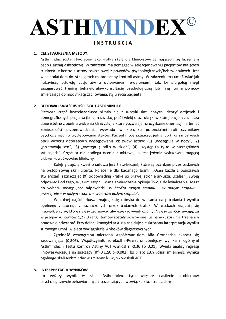 ASTHMINDEX © INSTRUKCJA 1. CEL STWORZENIA METODY: Asthmindex został stworzony jako krótka skala dla klinicystów zajmujących się leczeniem osób z astmą oskrzelową. W założeniu ma pomagać w selekcjonowaniu pacjentów mających trudności z kontrolą astmy oskrzelowej z powodów psychologicznych/behawioralnych. Jest więc dodatkiem do istniejących metod oceny kontroli astmy. W założeniu ma umożliwiać jak najszybszą selekcję pacjentów z opisywanymi problemami, tak, by alergolog mógł zasugerować trening behawioralny/konsultację psychologiczną lub inną formę pomocy zmierzającą do modyfikacji zachowania/stylu życia pacjenta. 2. BUDOWA I WŁAŚCIWOŚCI SKALI ASTHMINDEX Pierwsza część kwestionariusza składa się z rubryki dot. danych identyfikacyjnych i demograficznych pacjenta (imię, nazwisko, płeć i wiek) oraz rubryki w której pacjent zaznacza dane istotne z punktu widzenia klinicysty, a które pozwalają na uzyskanie orientacji na temat konieczności przeprowadzenia wywiadu w kierunku potencjalnej roli czynników psychogennych w występowaniu ataków. Pacjent może zaznaczyć jedną lub kilka z możliwych opcji wyboru dotyczących występowania objawów astmy: (1) „występują w nocy”, (2) „przerywają sen”, (3) „występują tylko w dzień”, (4) „występują tylko w szczególnych sytuacjach”. Część ta nie podlega ocenie punktowej, a jest jedynie wskazówką mogącą ukierunkować wywiad kliniczny. Kolejną częścią kwestionariusza jest 8 stwierdzeń, które są oceniane przez badanych na 5-stopniowej skali Likerta. Polecenie dla badanego brzmi: „Oceń każde z poniższych stwierdzeń, zaznaczając (X) odpowiednią kratkę po prawej stronie arkusza. Uzależnij swoją odpowiedź od tego, w jakim stopniu dane stwierdzenie opisuje Twoje doświadczenia. Masz do wyboru następujące odpowiedzi: w bardzo małym stopniu – w małym stopniu – przeciętnie – w dużym stopniu – w bardzo dużym stopniu”. W dolnej części arkusza znajduje się rubryka do wpisania daty badania i wyniku ogólnego zliczonego z zaznaczonych przez badanych kratek. W kratkach znajdują się niewielkie cyfry, które należy zsumować aby uzyskać wynik ogólny. Należy zwrócić uwagę, że w przypadku itemów 1,2 i 8 rangi itemów zostały odwrócone już na arkuszu i nie trzeba ich ponownie odwracać. Przy dolnej krawędzi arkusza znajduje się skrócona interpretacja wyniku surowego umożliwiająca wyciągnięcie wniosków diagnostycznych. Zgodność wewnętrzna mierzona współczynnikiem Alfa Cronbacha okazała się zadowalająca (0,807). Współczynnik korelacji r-Pearsona pomiędzy wynikami ogólnymi Asthmindex i Testu Kontroli Astmy ACT wyniósł r=-0,36 (p=0.01). Wyniki analizy regresji liniowej wskazują na znaczący (R2=0,129; p=0,002), bo blisko 13% udział zmienności wyniku ogólnego skali Asthmindex w zmienności wyników skali ACT. 3. INTERPRETACJA WYNIKÓW Im wyższy wynik w skali Asthmindex, tym większe nasilenie psychologicznych/behawioralnych, pozostających w związku z kontrolą astmy. problemów ASTHMINDEX © Badania nad psychologiczną charakterystyką osób uzyskujących określone wyniki w Asthmindex (poprzez korelacje wyników skali z wynikami innych testów psychologicznych), wskazują, że osoby uzyskujące wyższe wyniki w Asthmindex charakteryzują się bierną postawą wobec sytuacji trudnych związanych z chorobą, mniej aktywnie radzą sobie z trudnościami, w mniejszym stopniu kontrolują chorobę i przejawiają mniej nadziei w konfrontacji z nią. Mogą też za to stosować strategię pozytywnego przewartościowania objawów choroby, co znaczy, że paradoksalnie objawy choroby mają potencjał odgrywania ważnej roli w ich przystosowaniu do aktualnych warunków życia. Osoby uzyskujące niskie wyniki aktywnie radzą sobie z trudnościami, lepiej kontrolują astmę i charakteryzują się wyższym poziomem nadziei. Do interpretacji poszczególnych wyników liczbowych służą poniższe normy, jak również notka u dołu arkusza testowego. Tabela 1. Normy (N=100) skali Asthmindex – wyniki w stenach i ich interpretacja Wynik surowy Sten 8-11 pkt. 1 12-14 pkt. 2 15-19 pkt. 3 20 4 21-23 pkt. 5 24-26 pkt. 6 27-28 pkt. 7 29-31 pkt. 8 32-34 pkt. 9 35-40 pkt. 10 Interpretacja Wyniki niskie Wyniki przeciętne Wyniki podwyższone Wyniki wysokie 4. Ograniczenia skali Asthmindex jest obecnie metodą w fazie badań i potrzebuje określenia czułości i swoistości i w rozróżnianiu osób niekontrolujących astmę z powodów behawioralnych od tych, u których takich powodów nie da się udowodnić. Wyniki Asthmindex powinny być interpretowane z należytą ostrożnością, właściwą dla tej fazy badań. Dokumentacja badawcza metody www.asthmindex.com będzie aktualizowana w dziale ‘Dokumentacja’ na stronie