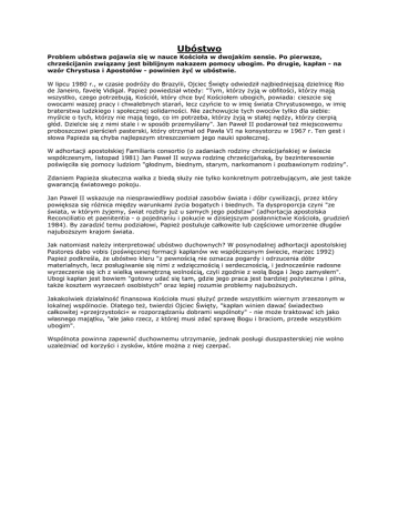 Ubóstwo Problem ubóstwa pojawia się w nauce Kościoła w dwojakim sensie. Po pierwsze, chrześcijanin związany jest biblijnym nakazem pomocy ubogim. Po drugie, kapłan - na wzór Chrystusa i Apostołów - powinien Ŝyć w ubóstwie. W lipcu 1980 r., w czasie podróŜy do Brazylii, Ojciec Święty odwiedził najbiedniejszą dzielnicę Rio de Janeiro, favelę Vidigal. PapieŜ powiedział wtedy: "Tym, którzy Ŝyją w obfitości, którzy mają wszystko, czego potrzebują, Kościół, który chce być Kościołem ubogich, powiada: cieszcie się owocami waszej pracy i chwalebnych starań, lecz czyńcie to w imię świata Chrystusowego, w imię braterstwa ludzkiego i społecznej solidarności. Nie zachowujcie tych owoców tylko dla siebie: myślcie o tych, którzy nie mają tego, co im potrzeba, którzy Ŝyją w stałej nędzy, którzy cierpią głód. Dzielcie się z nimi stale i w sposób przemyślany". Jan Paweł II podarował teŜ miejscowemu proboszczowi pierścień pasterski, który otrzymał od Pawła VI na konsystorzu w 1967 r. Ten gest i słowa PapieŜa są chyba najlepszym streszczeniem jego nauki społecznej. W adhortacji apostolskiej Familiaris consortio (o zadaniach rodziny chrześcijańskiej w świecie współczesnym, listopad 1981) Jan Paweł II wzywa rodzinę chrześcijańską, by bezinteresownie poświęciła się pomocy ludziom "głodnym, biednym, starym, narkomanom i pozbawionym rodziny". Zdaniem PapieŜa skuteczna walka z biedą słuŜy nie tylko konkretnym potrzebującym, ale jest takŜe gwarancją światowego pokoju. Jan Paweł II wskazuje na niesprawiedliwy podział zasobów świata i dóbr cywilizacji, przez który powiększa się róŜnica między warunkami Ŝycia bogatych i biednych. Ta dysproporcja czyni "ze świata, w którym Ŝyjemy, świat rozbity juŜ u samych jego podstaw" (adhortacja apostolska Reconciliatio et paenitentia - o pojednaniu i pokucie w dzisiejszym posłannictwie Kościoła, grudzień 1984). By zaradzić temu podziałowi, PapieŜ postuluje całkowite lub częściowe umorzenie długów najuboŜszym krajom świata. Jak natomiast naleŜy interpretować ubóstwo duchownych? W posynodalnej adhortacji apostolskiej Pastores dabo vobis (poświęconej formacji kapłanów we współczesnym świecie, marzec 1992) PapieŜ podkreśla, Ŝe ubóstwo kleru "z pewnością nie oznacza pogardy i odrzucenia dóbr materialnych, lecz posługiwanie się nimi z wdzięcznością i serdecznością, i jednocześnie radosne wyrzeczenie się ich z wielką wewnętrzną wolnością, czyli zgodnie z wolą Boga i Jego zamysłem". Ubogi kapłan jest bowiem "gotowy udać się tam, gdzie jego praca jest bardziej poŜyteczna i pilna, takŜe kosztem wyrzeczeń osobistych" oraz lepiej rozumie problemy najuboŜszych. Jakakolwiek działalność finansowa Kościoła musi słuŜyć przede wszystkim wiernym zrzeszonym w lokalnej wspólnocie. Dlatego teŜ, twierdzi Ojciec Święty, "kapłan winien dawać świadectwo całkowitej »przejrzystości« w rozporządzaniu dobrami wspólnoty" - nie moŜe traktować ich jako własnego majątku, "ale jako rzecz, z której musi zdać sprawę Bogu i braciom, przede wszystkim ubogim". Wspólnota powinna zapewnić duchownemu utrzymanie, jednak posługi duszpasterskiej nie wolno uzaleŜniać od korzyści i zysków, które moŜna z niej czerpać.