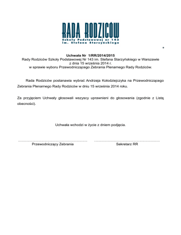 Uchwała Nr 1/RR/2014/2015 Rady Rodziców Szkoły Podstawowej Nr 143 im. Stefana Starzyńskiego w Warszawie z dnia 15 września 2014 r. w sprawie wyboru Przewodniczącego Zebrania Plenarnego Rady Rodziców. Rada Rodziców postanawia wybrać Andrzeja Kołodziejczyka na Przewodniczącego Zebrania Plenarnego Rady Rodziców w dniu 15 września 2014 roku. Za przyjęciem Uchwały głosowali wszyscy uprawnieni do głosowania (zgodnie z Listą obecności). Uchwała wchodzi w życie z dniem podjęcia. ………………………………………………… Przewodniczący Zebrania ……………………………………………… Sekretarz RR Uchwała Nr 2/RR/2014/2015 Rady Rodziców Szkoły Podstawowej Nr 143 im. Stefana Starzyńskiego w Warszawie z dnia 15 września 2014 r. w sprawie przyjęcia Porządku obrad. Rada Rodziców postanawia jednogłośnie przyjąć przedstawiony w Zawiadomieniu o Zebraniu Plenarnym Porządek obrad. Za przyjęciem Uchwały głosowali wszyscy uprawnieni do głosowania (zgodnie z Listą obecności). Uchwała wchodzi w życie z dniem podjęcia. ………………………………………………… Przewodniczący Zebrania ……………………………………………… Sekretarz RR Uchwała Nr 3/RR/2014/2015 Rady Rodziców Szkoły Podstawowej Nr 143 im. Stefana Starzyńskiego w Warszawie z dnia 15 września 2014 r. w sprawie zatwierdzenia Protokołu z poprzedniego Zebrania Plenarnego. Rada Rodziców postanawia zatwierdzić bez uwag Protokół z Zebrania Plenarnego Rady Rodziców Szkoły Podstawowej Nr 143 im. Stefana Starzyńskiego w Warszawie, które odbyło się w dniu 27 maja 2014 roku. Za przyjęciem Uchwały głosowali wszyscy uprawnieni do głosowania (zgodnie z Listą obecności). Uchwała wchodzi w życie z dniem podjęcia. ………………………………………………… Przewodniczący Zebrania ……………………………………………… Protokolant Uchwała Nr 4/RR/2014/2015 Rady Rodziców Szkoły Podstawowej Nr 143 im. Stefana Starzyńskiego w Warszawie z dnia 15 września 2014 r. w sprawie przyjęcia sprawozdania z działalności oraz udzielenia absolutorium Prezydium Rady Rodziców za rok szkolny 2013/2014 Rada rodziców przyjmuje bez uwag sprawozdanie z działalności oraz udziela absolutorium Prezydium Rady Rodziców za rok szkolny 2013/2014 Za przyjęciem Uchwały głosowali wszyscy uprawnieni do głosowania (zgodnie z Listą obecności). Uchwała wchodzi w życie z dniem podjęcia. ………………………………………………… Przewodnicząca Zebrania ………………………………………………… Protokolant Uchwała Nr 5/RR/2014/2015 Rady Rodziców Szkoły Podstawowej Nr 143 im. Stefana Starzyńskiego w Warszawie z dnia 15 września 2014 r. w sprawie wyboru Komisji Wyborczej Rada Rodziców w drodze głosowania wybrała Komisję Wyborczą Zebrania Plenarnego sprawozdawczo - wyborczego w składzie: - Marzena Potocka-Łojek - Mikołaj Cześnik Za przyjęciem Uchwały głosowali wszyscy uprawnieni do głosowania (zgodnie z Listą obecności). Uchwała wchodzi w życie z dniem podjęcia. ………………………………………………… Przewodnicząca Zebrania ………………………………………………… Protokolant Uchwała Nr 6a/RR/2014/2015 Rady Rodziców Szkoły Podstawowej Nr 143 im. Stefana Starzyńskiego w Warszawie z dnia 15 września 2014 r. w sprawie wyboru Andrzeja Kołodziejczyka do Prezydium Rady Rodziców w roku szkolnym 2014/2015 Rada Rodziców w trakcie przewidzianych regulaminem wyborów wybrała Andrzeja Kołodziejczyka do Prezydium Rady Rodziców w roku szkolnym 2014/2015 Za przyjęciem Uchwały głosowało 22 przedstawicieli uprawnionych do głosowania (zgodnie z Listą obecności). Uchwała wchodzi w życie z dniem podjęcia ………………………………………………… Przewodniczący Zebrania ………………………………………………… Sekretarz RR Uchwała Nr 6b/RR/2014/2015 Rady Rodziców Szkoły Podstawowej Nr 143 im. Stefana Starzyńskiego w Warszawie z dnia 15 września 2014 r. w sprawie wyboru Michała Gorzędowskiego do Prezydium Rady Rodziców w roku szkolnym 2014/2015 Rada Rodziców w trakcie przewidzianych regulaminem wyborów wybrała Michała Gorzędowskiego do Prezydium Rady Rodziców w roku szkolnym 2014/2015 Za przyjęciem Uchwały głosowało 21 przedstawicieli uprawnionych do głosowania, jeden przedstawiciel wstrzymał się od głosu. (zgodnie z Listą obecności). Uchwała wchodzi w życie z dniem podjęcia ………………………………………………… Przewodniczący Zebrania ………………………………………………… Sekretarz RR Uchwała Nr 6c/RR/2014/2015 Rady Rodziców Szkoły Podstawowej Nr 143 im. Stefana Starzyńskiego w Warszawie z dnia 15 września 2014 r. w sprawie wyboru Natalii Dziekan do Prezydium Rady Rodziców w roku szkolnym 2014/2015 Rada Rodziców w trakcie przewidzianych regulaminem wyborów wybrała Natalię Dziekan do Prezydium Rady Rodziców w roku szkolnym 2014/2015 Za przyjęciem Uchwały głosowało 22 przedstawicieli uprawnionych do głosowania (zgodnie z Listą obecności). Uchwała wchodzi w życie z dniem podjęcia ………………………………………………… Przewodniczący Zebrania ………………………………………………… Sekretarz RR Uchwała Nr 6d/RR/2014/2015 Rady Rodziców Szkoły Podstawowej Nr 143 im. Stefana Starzyńskiego w Warszawie z dnia 15 września 2014 r. w sprawie wyboru Agnieszki Biesiadzińskiej do Prezydium Rady Rodziców w roku szkolnym 2014/2015 Rada Rodziców w trakcie przewidzianych regulaminem wyborów wybrała Agnieszkę Biesiadzińską do Prezydium Rady Rodziców w roku szkolnym 2014/2015 Za przyjęciem Uchwały głosowało 22 przedstawicieli uprawnionych do głosowania (zgodnie z Listą obecności). Uchwała wchodzi w życie z dniem podjęcia ……………………………………………