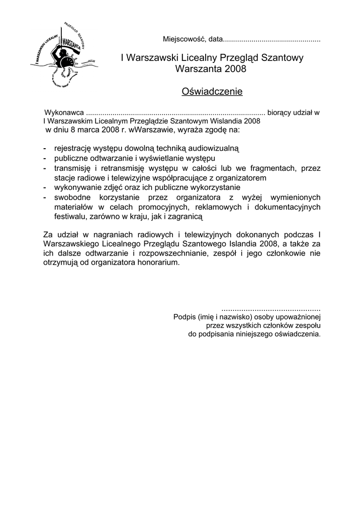Miejscowość, data................................................ I Warszawski Licealny Przegląd Szantowy Warszanta 2008 Oświadczenie Wykonawca ........................................................................................ biorący udział w I Warszawskim Licealnym Przeglądzie Szantowym Wislandia 2008 w dniu 8 marca 2008 r. wWarszawie, wyraża zgodę na: - rejestrację występu dowolną techniką audiowizualną publiczne odtwarzanie i wyświetlanie występu transmisję i retransmisję występu w całości lub we fragmentach, przez stacje radiowe i telewizyjne współpracujące z organizatorem wykonywanie zdjęć oraz ich publiczne wykorzystanie swobodne korzystanie przez organizatora z wyżej wymienionych materiałów w celach promocyjnych, reklamowych i dokumentacyjnych festiwalu, zarówno w kraju, jak i zagranicą Za udział w nagraniach radiowych i telewizyjnych dokonanych podczas I Warszawskiego Licealnego Przeglądu Szantowego Islandia 2008, a także za ich dalsze odtwarzanie i rozpowszechnianie, zespół i jego członkowie nie otrzymują od organizatora honorarium. ............................................. Podpis (imię i nazwisko) osoby upoważnionej przez wszystkich członków zespołu do podpisania niniejszego oświadczenia.