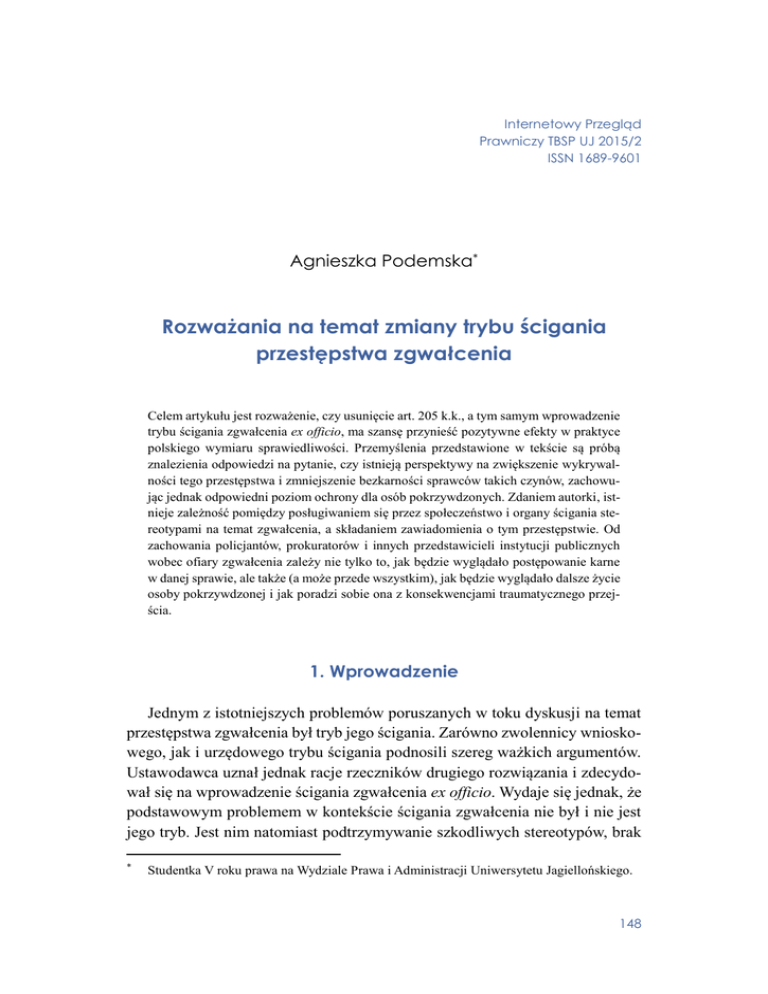 Internetowy Przegląd Prawniczy TBSP UJ 2015/2 ISSN 1689-9601 Agnieszka Podemska* Rozważania na temat zmiany trybu ścigania przestępstwa zgwałcenia Celem artykułu jest rozważenie, czy usunięcie art. 205 k.k., a tym samym wprowadzenie trybu ścigania zgwałcenia ex officio, ma szansę przynieść pozytywne efekty w praktyce polskiego wymiaru sprawiedliwości. Przemyślenia przedstawione w tekście są próbą znalezienia odpowiedzi na pytanie, czy istnieją perspektywy na zwiększenie wykrywalności tego przestępstwa i zmniejszenie bezkarności sprawców takich czynów, zachowując jednak odpowiedni poziom ochrony dla osób pokrzywdzonych. Zdaniem autorki, istnieje zależność pomiędzy posługiwaniem się przez społeczeństwo i organy ścigania stereotypami na temat zgwałcenia, a składaniem zawiadomienia o tym przestępstwie. Od zachowania policjantów, prokuratorów i innych przedstawicieli instytucji publicznych wobec ofiary zgwałcenia zależy nie tylko to, jak będzie wyglądało postępowanie karne w danej sprawie, ale także (a może przede wszystkim), jak będzie wyglądało dalsze życie osoby pokrzywdzonej i jak poradzi sobie ona z konsekwencjami traumatycznego przejścia. 1. Wprowadzenie Jednym z istotniejszych problemów poruszanych w toku dyskusji na temat przestępstwa zgwałcenia był tryb jego ścigania. Zarówno zwolennicy wnioskowego, jak i urzędowego trybu ścigania podnosili szereg ważkich argumentów. Ustawodawca uznał jednak racje rzeczników drugiego rozwiązania i zdecydował się na wprowadzenie ścigania zgwałcenia ex officio. Wydaje się jednak, że podstawowym problemem w kontekście ścigania zgwałcenia nie był i nie jest jego tryb. Jest nim natomiast podtrzymywanie szkodliwych stereotypów, brak * Studentka V roku prawa na Wydziale Prawa i Administracji Uniwersytetu Jagiellońskiego. 148 Internetowy Przegląd Prawniczy TBSP UJ 2015/2 „Nowelizacja postępowania karnego”, red. S. Pawelec edukacji społecznej i zmian w świadomości na temat przestępstwa z art. 197 k.k., jego sprawców i przede wszystkim ofiar. Bez zmiany mentalności społeczeństwa, żadne (nawet w swych założeniach słuszne) rozwiązanie legislacyjne nie przyniesie oczekiwanego rezultatu. Pokrzywdzony, który nie będzie odczuwał społecznego wsparcia i zrozumienia jego krzywdy, może nie mieć życzenia, by postępowanie karne w sprawie jego zgwałcenia w ogóle się toczyło. Także w trybie ścigania z urzędu ma on wiele możliwości (zarówno legalnych, jak i nielegalnych) unicestwienia szansy na ukaranie rzeczywistego sprawcy przestępstwa. 2. Tryb ścigania w polskim prawie karnym Polski system prawnokarny przewiduje dwa tryby ścigania: publicznoskargowy (w ramach którego wyróżnia się tryb ścigania z urzędu oraz na wniosek) i z oskarżenia prywatnego. To ustawa każdorazowo wskazuje, w jakim trybie ścigane jest dane przestępstwo. Tryb ścigania z urzędu obowiązuje w odniesieniu do znakomitej większości przestępstw. Zasada wyrażona w art. 9 § 1 k.p.k. zakłada, że organy zobowiązane są z urzędu podejmować wszelkie czynności mające na celu ściganie sprawców przestępstw i ich karanie. Wszczęcie postępowania, a także jego prowadzenie, mogą się wówczas toczyć niezależnie od woli osoby pokrzywdzonej. W polskim prawie karnym obowiązuje zasada legalizmu ścigania wynikająca z w art. 10 § 1 k.p.k., zgodnie z którą organ powołany do ścigania przestępstw ma obowiązek wszcząć i przeprowadzić postępowanie przygotowawcze w sprawie o przestępstwo ścigane z oskarżenia publicznego zawsze, gdy tylko poweźmie uprawdopodobnioną wiadomość o jego popełnieniu. Nie stanowi wyjątku od zasady legalizmu ściganie przestępstwa na wniosek. Organy ścigania, by wszcząć i prowadzić postępowanie w sprawie przestępstwa wnioskowego, zobligowane są w każdym przypadku uzyskać wniosek od osoby uprawnionej, którą w większości przypadków jest pokrzywdzony. Zgodnie z art. 17 § 2 k.p.k. do chwili otrzymania wniosku lub zezwolenia władzy, od których ustawa uzależnia ściganie, organy procesowe dokonują tylko czynności niecierpiących zwłoki w celu zabezpieczenia śladów i dowodów, a także czynności zmierzających do wyjaśnienia, czy wniosek będzie złożony lub zezwolenie będzie wydane. Od 11 lipca 1932 r. do 26 stycznia 2014 r. przestępstwo zgwałcenia należało do kategorii przestępstw bezwzględnie wnioskowych. Nieuzyskanie wniosku od osoby uprawnionej na etapie postępowania przygotowawczego skutkowało niemożnością wszczęcia postępowa- 149 Internetowy Przegląd Prawniczy TBSP UJ 2015/2 „Nowelizacja postępowania karnego”, red. S. Pawelec nia in rem. Brak wniosku na etapie postępowania sądowego stanowił bezwzględną przyczynę odwoławczą (art. 439 § 1 pkt 9 w zw. z art. 17 § 1 pkt 10 k.p.k). Należy w tym miejscu podkreślić, że raz złożonego wniosku o ściganie zgwałcenia nie można było cofnąć (regulacja ta stanowiła wyjątek od ogólnej zasady). Co do czynów popełnionych od dnia 27 stycznia 2014 r. zgwałcenie jest ścigane z urzędu i nie jest potrzebna żadna decyzja pokrzywdzonego w tym zakresie. Zgodnie z art. 3 ustawy nowelizującej z dnia 13 czerwca 2013 r.1 do czynów popełnionych przed dniem wejścia w życie tej ustawy (tj. przed 27 stycznia 2014 r.) art. 205 k.k. oraz art. 12 § 3 k.p.k. stosuje się w brzmieniu dotychczasowym2. Zmiana trybu ścigania wciąż jest bardzo kontrowersyjnym tematem, nie tylko dla opinii społecznej, ale także samego środowiska prawniczego. Już pod koniec 2013 roku (w kilka miesięcy po uchwaleniu ustawy) Komisja Kodyfikacyjna przedstawiła propozycje powrotu do wnioskowego trybu ścigania, ale Minister Sprawiedliwości z nich nie skorzystał. Należy więc zadać pytanie, jakie argumenty przemawiają za ściganiem zgwałcenia w trybie wnioskowym, a jakie za działaniem z urzędu. Czy rzeczywiście konieczne było dokonanie zmiany trybu ś