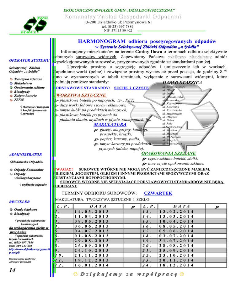 EKOLOGICZNY ZWIĄZEK GMIN „DZIAŁDOWSZCZYZNA” Komunalny Zakład Gospodarki Odpadami K KZ ZG GO O 13-200 Działdowo ul: Przemysłowa 61 tel. (0-23) 697 7886 NIP 571 15 80 402 O OS SA AD DU US S HARMONOGRAM odbioru posegregowanych odpadów w Systemie Selektywnej Zbiórki Odpadów „u źródła” Informujemy mieszkańców na terenie Gminy Iłowo o terminach odbioru selektywnie zebranych surowców wtórnych. Zapewniamy Państwu cykliczny nieodpłatny odbiór OPERATOR SYSTEMU wyselekcjonowanych surowców, przygotowanych zgodnie ze standardami poniżej. Uprzejmie prosimy o segregację odpadów i umieszczenie ich w workach. Selektywnej Zbiórki Odpadów „u źródła” Zapełnione worki (pełne) i zawiązane prosimy wystawiać przed posesją, do godziny 8 00 rano w wyznaczonych w tabeli terminach, wyłącznie z surowcami wtórnymi, które ☺ Tworzywa sztuczne spełniają poniższe standardy: IŁOWO STASZICA ☺ Makulatura ☺ Opakowania szklane ☺ Bioodpady ☺ Zużyte baterie ☺ ZSEiE √ zbieranie i transport √ konfekcjonowanie √ sprzedaż PODSTAWOWE STANDARDY: SUCHE i CZYSTE TWORZYWA SZTUCZNE √ √ √ √ - plastikowe butelki po napojach, tzw. PET, - duże worki foliowe i torby reklamowe, - umyte kubki po produktach mlecznych, - plastikowe butelki po płynach do płukania tkanin, mydłach w płynie, szamponach, itp. MAKULATURA √ - gazety, magazyny, katalogi, prospekty, książki, √ - papier, kartony, pudła, √ - umyte kartony po produktach płynnych (mleko, napoje). OPAKOWANIA SZKLANE ADMINISTRATOR √ - czyste szklane butelki, słoiki, √ - inne czyste opakowania szklane. Składowiska Odpadów ☺ Odpady Komunalne ☺ Odpady wielkogabarytowe √ utylizacja odpadów UWAGA!!! SUROWCE WTÓRNE NIE MOGĄ BYĆ ZANIECZYSZCZONE MASŁEM, MLEKIEM, JOGURTEM, OLEJEM I INNYMI PRODUKTAMI SPOŻYWCZYMI ORAZ SUBSTANCJAMI ROPOPOCHODNYMI. SUROWCE WTÓRNE NIE SPEŁNIAJĄCE PODSTAWOWYCH STANDARDÓW NIE BĘDĄ ODBIERANE TERMINY ODBIORU SUROWCÓW: RECYKLER ☺ Osady ściekowe ☺ Bioodpady √ produkcja substratów humusowych do wzbogacania gleby w próchnicę √ sprzedaż substratów luzem i w workach tel. (023) 697 7886 kom. 501 131 088 http://www.dzialdowszczyzna.bi p.net.pl/ Opracowanie graficzne Jarosław Dwórznik 14 ul. Broniewskiego ul. Długa ul. Dolna ul. Działdowska ul. Janowska ul. Kosynierów ul. Kościelna ul. Kraszewska ul. Mickiewicza ul. Okrężna ul. Polna ul. Reja ul.Sienkiewicza ul. Staszica ul. Stelczyka ul. 19-Stycznia ul. Wiejska ul. Wyzwolenia CZWARTEK MAKULATURA, TWORZYWA SZTUCZNE I SZKŁO L.P. 1. 2. 3. 4. 5. 6. 7. 8. 9. 10. 11. 12. 1 1 0 0 0 0 2 2 2 2 1 1 4 1 9 6 4 1 9 6 4 1 9 6 . . . . . . . . . . . . 0 0 0 0 0 0 0 0 1 1 1 0 DATA 3.2013 4.2013 5.2013 6.2013 7.2013 8.2013 8.2013 9.2013 0.2013 1.2013 2.2013 1.2014 √ L. 13 14 15 16 17 18 19 20 21 22 23 24 P. DATA . 13.02.2014 . 13.03.2014 . 10.04.2014 . 08.05.2014 . 05.06.2014 . 03.07.2014 . 31.07.2014 . 28.08.2014 . 25.09.2014 . 23.10.2014 . 20.11.2014 . 18.12.2014 ☺Dziękujemy za współpracę☺ √