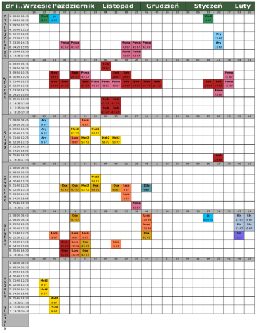 dr i...Wrzesień Październik 16 P o n i e d z i a ł e k 07 14 21 28 11 18 25 02 09 16 23 Styczeń 1. 08:00 08:45 Clwtl Js Clwtl 2. 08:50 09:35 30 06 13 9 67 9 67 9 67 20 Luty 27 03 10 28 04 11 29 05 12 06 13 3. 09:50 10:35 4. 10:40 11:25 5. 11:40 12:25 Ary 6. 12:30 13:15 33 67 7. 13:30 14:15 Psma Psma Psma Psma Psma 8. 14:20 15:05 43 67 43 67 43 67 9. 15:45 16:30 43 67 Ary 43 67 33 67 Psma Psma 10. 16:35 17:20 24 01 08 15 22 29 1. 08:00 08:45 05 12 43 67 43 67 19 26 03 10 17 24 31 07 14 21 Swb 2. 08:50 09:35 24 67 3. 09:50 10:35 Swb Swb Psma Swb Swb 4. 10:40 11:25 24 67 24 67 43 67 24 67 24 67 5. 11:40 12:25 Swb Swb Swb Psma Psma Psma Swb Swb Swb Swb Swb 6. 12:30 13:15 24 67 24 67 24 67 43 67 24 67 24 67 24 67 24 67 24 67 43 67 43 67 Psma 43 67 7. 13:30 14:15 Swb Psma 24 67 43 67 Psma 8. 14:20 15:05 43 67 9. 15:45 16:30 Swb 10. 16:35 17:20 Swb 43 67; 43 67; 11. 17:35 18:20 Swb 12. 18:25 19:10 Swb 43 67; 43 67; 18 Ś r o d a 04 Grudzień 30 17 W t o r e k Listopad 23 25 02 09 16 23 30 06 13 1. 08:00 08:45 Ary 2. 08:50 09:35 9 67 3. 09:50 10:35 Ary Met2 Met2 4. 10:40 11:25 9 67 S3 72 S3 72 5. 11:40 12:25 Ary Lscs Met2 Met2 Met2 6. 12:30 13:15 9 67 9 67 S3 72 S3 72 S3 72 20 27 04 11 18 25 01 08 15 22 Lscs 9 67 7. 13:30 14:15 8. 14:20 15:05 9. 15:45 16:30 Swb 10. 16:35 17:20 24 67 19 26 03 10 17 24 31 07 14 21 28 05 12 19 26 02 09 16 23 30 13 20 27 03 10 17 24 31 1. 08:00 08:45 C z w a r t e k 2. 08:50 09:35 3. 09:50 10:35 Met2 4. 10:40 11:25 S3 72 5. 11:40 12:25 Osa Osa Met2 Osa Osa Lscs Ztlo 6. 12:30 13:15 43 67 43 67 S3 72 43 67 43 67 9 67 9 67 7. 13:30 14:15 Lscs 8. 14:20 15:05 9 67 9. 15:45 16:30 Psma 10. 16:35 17:20 43 67 20 P i ą t e k 27 04 07 14 1. 08:00 08:45 Osa Lscs Js Ltc Ltc 2. 08:50 09:35 43 67 130 36 25 01 08 15 22 29 06 Sr35 63 33 67 9 67 Lscs Ltc Ltc 4. 10:40 11:25 130 36 33 67 9 67 5. 11:40 12:25 Lscs Lscs Lscs Osa Sd. 6. 12:30 13:15 9 67 9 67 9 67 43 67 3 67 Lscs Osa 7. 13:30 14:15 Swb 8. 14:20 15:05 43 67 130 36 43 67 9. 15:45 16:30 Swb 28 05 1. 08:00 08:45 2. 08:50 09:35 3. 09:50 10:35 4. 10:40 11:25 5. 11:40 12:25 Met2 6. 12:30 13:15 9 67 7. 13:30 14:15 Met2 8. 14:20 15:05 9 67 9. 15:45 16:30 Lscs Lscs 9 67 Osa 43 67 130 36 43 67 21 N i e d z i e 18 3. 09:50 10:35 10. 16:35 17:20 S o b o t a 11 Met2 10. 16:35 17:20 9 67 11. 17:35 18:20 Met2 12. 18:25 19:10 9 67 12 19 26 02 09 16 23 30 07 14 21 28 04 11 18 25 01 08 15 l a 22 29 06 1. 08:00 08:45 Met2 2. 08:50 09:35 9 67 13 20 27 03 10 17 24 01 08 15 Plan wygenerowany przez php. Autor: Kamil Ostaszewski - I7B1S1. Plan jest aktualny na dzień: 2017-03-04 22 29 05 12 19 26 02 09 16