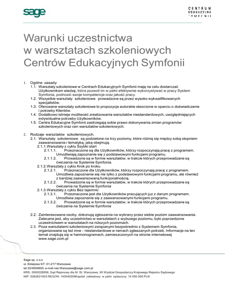 Warunki uczestnictwa w warsztatach szkoleniowych Centrów Edukacyjnych Symfonii 1. Ogólne zasady 1.1. Warsztaty szkoleniowe w Centrach Edukacyjnych Symfonii mają na celu dostarczać Użytkownikom wiedzę, która pozwoli im w pełni efektywnie wykorzystywać w pracy System Symfonia, podnosić swoje kompetencje oraz jakość pracy. 1.2. Wszystkie warsztaty szkoleniowe prowadzone są przez wysoko wykwalifikowanych specjalistów. 1.3. Oferowane warsztaty szkoleniowe to propozycje autorskie stworzone w oparciu o doświadczenie i potrzeby Klientów. 1.4. Dodatkowo istnieje możliwość zrealizowania warsztatów niestandardowych, uwzględniających indywidualne potrzeby Użytkowników. 1.5. Centra Edukacyjne Symfonii zastrzegają sobie prawo dokonywania zmian programów szkoleniowych oraz cen warsztatów szkoleniowych. 2. Rodzaje warsztatów szkoleniowych. 2.1. Warsztaty szkoleniowe są podzielone na trzy poziomy, które różnią się między sobą stopniem zaawansowania i tematyką, jaką obejmują. 2.1.1.Warsztaty z cyklu Szybki start 2.1.1.1. Przeznaczone są dla Użytkowników, którzy rozpoczynają pracę z programem. Umożliwiają zapoznanie się z podstawowymi funkcjami programu. 2.1.1.2. Prowadzone są w formie warsztatów, w trakcie których przeprowadzane są ćwiczenia na Systemie Symfonia. 2.1.2.Warsztaty z cyklu Krok po kroku 2.1.2.1. Przeznaczone dla Użytkowników, którzy rozpoczynają pracę z programem. Umożliwia zapoznanie się nie tylko z podstawowymi funkcjami programu, ale również z bardziej zaawansowaną funkcjonalnością. 2.1.2.2. Prowadzone są w formie warsztatów, w trakcie których przeprowadzane są ćwiczenia na Systemie Symfonia. 2.1.3.Warsztaty z cyklu Bez tajemnic 2.1.3.1. Przeznaczone jest dla Użytkowników pracujących juz z danym programem. Umożliwia zapoznanie się z zaawansowanymi funkcjami programu. 2.1.3.2. Prowadzone są w formie warsztatów, w trakcie których przeprowadzane są ćwiczenia na Systemie Symfonia. 2.2. Zainteresowane osoby, dokonują zgłoszenia na wybrany przez siebie poziom zaawansowania. Zalecane jest, aby uczestnictwo w warsztatach z wyższego poziomu, było poprzedzone uczestnictwem w warsztatach na niższych poziomach. 2.3. Poza warsztatami szkoleniowymi związanymi bezpośrednio z Systemem Symfonia, organizowane są też inne - niestandardowe w ramach zgłaszanych potrzeb. Informacje na ten temat znajdują się w harmonogramach, zamieszczonych na stronie internetowej www.sage.com.pl Sage sp. z o.o ul. Kolejowa 5/7, 01-217 Warszawa tel 22/4555655, e-mail [email protected] KRS: 0000228956, Sąd Rejonowy dla M. St. Warszawa, XII Wydział Gospodarczy Krajowego Rejestru Sądowego NIP: 5262831503 REGON: 140045209Kapitał zakładowy w pełni opłacony: 15 050 000 PLN 2.4. Uczestnikom szkoleń, którzy chcą zweryfikować swoja wiedzę zdobytą na szkoleniu, proponujemy udział w Programie Certyfikacji. Podstawą procesu certyfikacji jest egzamin. Uzyskanie pozytywnego wyniku z egzaminu uprawnia do otrzymania certyfikatu będącego przepustką do elitarnej grupy profesjonalistów, biegłych w obsłudze Systemów SYMFONIA®. 3. Zgłoszenia 3.1. Warsztaty szkoleniowe dedykowane dla wszystkich osób zainteresowanych zdobyciem nowej wiedzy oraz dla Użytkowników Systemu Symfonia. 3.2. Zgłoszenia na warsztaty szkoleniowe przyjmowane są jedynie na FORMULARZACH ZGŁOSZENIOWYCH Centrów Edukacyjnych Symfonii. 3.3. Formularze Zgłoszeniowe znajdują się na podstronach internetowych poszczególnych Centrów Edukacyjnych Symfonii na www.sage.com.pl 3.4. Wypełniony formularz należy przesłać drogą elektroniczną na adres e-mail lub pod nr faksu wybranego przez Państwa Centrum Edukacyjnego Symfonii – lista Centrów znajduje się na: www.sage.com.pl 3.5. Zgłoszenia nie są przyjmowane telefonicznie. Przez telefon można jedynie uzyskać informacje o wolnych miejscach i wstępnie je zarezerwować. 3.6. O uczestnictwie w warsztacie szkoleniowym decyduje kolejność nadsyłania zgłoszeń. 3.7. Termin nadsyłania zgłoszeń upływa na 5 dni przed terminem warsztatu szkoleniowego. 3.8. Centra Edukacyjne Symfonii na 3 dni przed warsztatem szkoleniowym informują wszystkich zgłoszonych Uczestników o potwierdzeniu lub anulacji warsztatu. 4. Zmiany 4.1. Rezygnacja z warsztatu może nastąpić do 3 dni roboczych przed terminem zajęć. W takiej sytuacji Klient powinien niezwłocznie poinformować o tym fakcie drogą elektroniczną (e-mail) Centrum Edukacyjne Symfonii, do którego przesłał zgłoszenie. 4.2. W przypadku późniejszej rezygnacji Klient zostanie obciążony kosztami zajęć w wysokości ich ceny. 4.3. Centra Edukacyjne Symfonii zastrzegają sobie prawo odwołania zajęć do 3 dni przed terminem, jeżeli liczba zgłoszeń będzie mniejsza niż 5 osób. W takiej sytuacji, Klientowi zostanie zwrócona zapłacona kwota. 5. Opłaty 5.1. Wszystkie warsztaty szkoleniowe w Centrach Edukacyjnych Symfonii są odpłatne 5.2. Ceny podane są w harmonogramach warsztatów. Do podanych cen należy doliczyć 23% podatku VAT. 5.3. Podane w harmonogramach ceny są przewidziane dla jednej osoby i obejmuje: 5.3.1.warsztaty szkoleniowe; 5.3.2.jedno stanowisko komputerowe (z wyjątkiem szkoleń teoretycznych) 5.3.3.oryginalne materiały szkoleniowe; 5.3.4.lunch; 5.3.5.bufet; 5.3.6.zaświadczenie o ukończeniu warsztatu. 5.4. W cenę nie jest wliczona opłata za egzamin certyfikacyjny. 5.5. Opłaty dokonywane są przelewem na konto wybranego Centrum Edukacyjnego Symfonii na podstawie faktury pro-forma, w terminie do 5 dni przed szkoleniem. 6. Rabaty 6.1. Każda następna osoba z tej samej firmy otrzymuje rabat w wysokości 10% 6.2. W przypadku udziału jednej osoby w więcej niż w dwóch warsztatach 15% rabatu 6.3. W przypadku udziału więcej niż jednej osoby z jednej firmy, w więcej niż w dwóch warsztatach 20% rabatu 6.4. Rabaty nie sumują się. Sage sp. z o.o ul. Kolejowa 5/7, 01-217 Warszawa tel 22/4555655, e-mail [email protected] KRS: 0