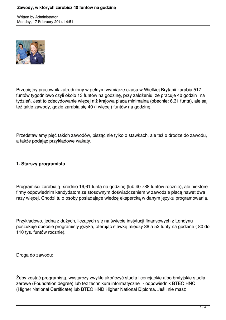 Zawody, w których zarobisz 40 funtów na godzinę Written by Administrator Monday, 17 February 2014 14:51 Przeciętny pracownik zatrudniony w pełnym wymiarze czasu w Wielkiej Brytanii zarabia 517 funtów tygodniowo czyli około 13 funtów na godzinę, przy założeniu, że pracuje 40 godzin na tydzień. Jest to zdecydowanie więcej niż krajowa płaca minimalna (obecnie: 6,31 funta), ale są też takie zawody, gdzie zarabia się 40 (i więcej) funtów na godzinę. Przedstawiamy pięć takich zawodów, pisząc nie tylko o stawkach, ale też o drodze do zawodu, a także podając przykładowe wakaty. 1. Starszy programista Programiści zarabiają średnio 19,61 funta na godzinę (lub 40 788 funtów rocznie), ale niektóre firmy odpowiednim kandydatom ze stosownym doświadczeniem w zawodzie płacą nawet dwa razy więcej. Chodzi tu o osoby posiadające wiedzę ekspercką w danym języku programowania. Przykładowo, jedna z dużych, liczących się na świecie instytucji finansowych z Londynu poszukuje obecnie programisty języka, oferując stawkę między 38 a 52 funty na godzinę ( 80 do 110 tys. funtów rocznie). Droga do zawodu: Żeby zostać programistą, wystarczy zwykle ukończyć studia licencjackie albo brytyjskie studia zerowe (Foundation degree) lub też technikum informatyczne - odpowiednik BTEC HNC (Higher National Certificate) lub BTEC HND Higher National Diploma. Jeśli nie masz 1/4 Zawody, w których zarobisz 40 funtów na godzinę Written by Administrator Monday, 17 February 2014 14:51 ukończonych studiów informatycznych, ale inne, to możesz znaleźć pracę również poprzez program szkoleniowy dla absolwentów uczelni wyższych. 2. Lekarz Przeciętne zarobki lekarzy to 30,54 funtów na godzinę (czyli 63 677 funtów rocznie), ale w wielu ofertach pracy dla lekarzy ogólnych pojawiają się zarobki znacznie wyższe. Przykładowo przychodnia lekarska w Keighley, hrabstwo West Yorkshire, poszukiwała niedawno lekarza ze stawką 45-48 funtów na godzinę (95 - 100 tys. funtów rocznie). Droga do zawodu: Lekarzem w Wielkiej Brytanii zostaje się po pięcioletnich studiach medycznych oraz dwuletnim stażu. Aby zostać lekarzem rodzinnym, trzeba także ukończyć trzyletnie specjalistyczne szkolenie w zakresie medycyny rodzinnej.. 3. Pracownik odpowiedzialny za zapewnienie zgodności Pracownicy odpowiedzialni za przestrzeganie przepisów funkcjonowania biznesu oraz regulacji w zakresie ochrony środowiska, pracują zwykle w branżach regulowanych, takich jak na przykład finanse i opieka zdrowotna. Oczywiście na większe stawki mogą liczyć eksperci pracujący w sektorze finansów, takich jak na przykład bankowość inwestycyjna. Przykładowo w Londynie niedawno oferowano pracownikowi odpowiedzialnemu za zapewnienie zgodności finansowej stawkę 63-75 funtów na godzinę (między 130 500 a 156 600 funtów rocznie). 2/4 Zawody, w których zarobisz 40 funtów na godzinę Written by Administrator Monday, 17 February 2014 14:51 Droga do zawodu: Pracownicy tej specjalności muszą mieć ukończone przynajmniej studia licencjackie. Wielu kandydatów ma przygotowanie prawnicze, inni - ukończone inne studia pokrewne. 4. Pielęgniarka Doświadczone pielęgniarki pracują w wielu różnych miejscach - od przychodni lekarskich, aż po placówki pogotowia ratunkowego. Pielęgniarki na stałych etatach zarabiają średnio 13 funtów na godzinę (czyli 27 086 funtów rocznie), ale te, pracujące na stanowiskach tymczasowych, mogą zarobić nawet do 40 funtów za godzinę. Przykładowo w Bristolu poszukiwano ostatnio pielęgniarki na zastępstwo i oferowano od 30 do 40 funtów na godzinę. Droga do zawodu: W tym zawodzie niezbędne są studia pielęgniarskie, a następnie rejestracja w Radzie Pielęgniarek i Położnych - Nursing and Midwifery Council. Dodatkowo kandydaci muszą przejść pozytywnie badania z zakresu medycyny pracy i sprawdzenie niekaralności. 5. Dyrektor marketingu Dyrektorzy marketingu zarabiają średnio 33 funty na godzinę (czyli 68 438 funtów rocznie), ale często, aby przyciągnąć lepszych kandydatów, zwłaszcza w dużych firmach, oferowane są zarobki dużo wyższe. Przykładowo pewna londyńska firma z sketora płatności rektutuje obecnie doświadczonego 3/4 Zawody, w których zarobisz 40 funtów na godzinę Written by Administrator Monday, 17 February 2014 14:51 dyrektora marketingu, oferując stawkę godzinną między 63 a 75 funtów czyli między 130 500 a 156 600 funtów rocznie. Droga do zawodu: W tym zawodzie studia nie zawsze są wymagane. Jednakże dużą zaletą jest posiadanie kwalifikacji biznesowych lub marketingowych, na przykład Professional Diploma in Marketing, nadany przez Chartered Institute of Marketing (CIM)., UWAGI: * Stawka 517 funtów na tydzień to mediana, a nie prawdziwa średnia. Medianę ustala się zestawiając wszystkie zarobki od najwyższych do najniższych, co oznacza, że zarobki bardzo wysokie lub bardzo niskie mają mniejszy wpływa na końcową wartość niż w przypadku zwykłej średniej. * Podane zarobki to kwoty brutto. * Przeciętne zarobki pochodzą z dorocznej ankiety godzin pracy i zarobków - 2013 Annual Survey of Hours and Earning, opracowanej i opublikowanej przez brytyjski Krajowy Urząd Statystycznyc - Office of National Statistics. emka 4/4
