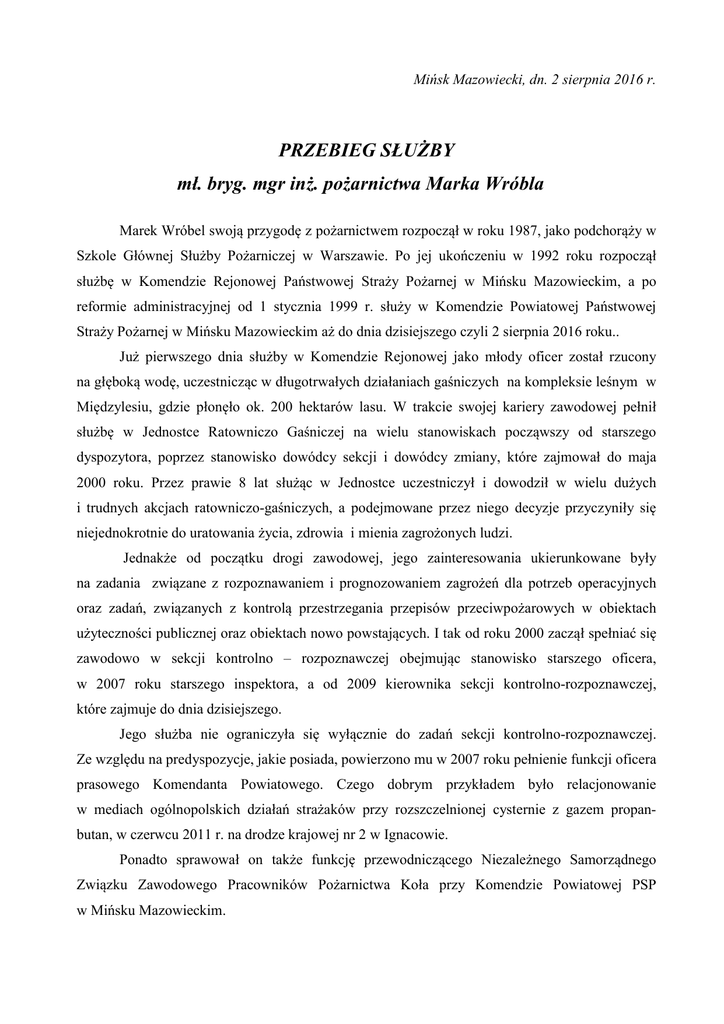 Mińsk Mazowiecki, dn. 2 sierpnia 2016 r. PRZEBIEG SŁUŻBY mł. bryg. mgr inż. pożarnictwa Marka Wróbla Marek Wróbel swoją przygodę z pożarnictwem rozpoczął w roku 1987, jako podchorąży w Szkole Głównej Służby Pożarniczej w Warszawie. Po jej ukończeniu w 1992 roku rozpoczął służbę w Komendzie Rejonowej Państwowej Straży Pożarnej w Mińsku Mazowieckim, a po reformie administracyjnej od 1 stycznia 1999 r. służy w Komendzie Powiatowej Państwowej Straży Pożarnej w Mińsku Mazowieckim aż do dnia dzisiejszego czyli 2 sierpnia 2016 roku.. Już pierwszego dnia służby w Komendzie Rejonowej jako młody oficer został rzucony na głęboką wodę, uczestnicząc w długotrwałych działaniach gaśniczych na kompleksie leśnym w Międzylesiu, gdzie płonęło ok. 200 hektarów lasu. W trakcie swojej kariery zawodowej pełnił służbę w Jednostce Ratowniczo Gaśniczej na wielu stanowiskach począwszy od starszego dyspozytora, poprzez stanowisko dowódcy sekcji i dowódcy zmiany, które zajmował do maja 2000 roku. Przez prawie 8 lat służąc w Jednostce uczestniczył i dowodził w wielu dużych i trudnych akcjach ratowniczo-gaśniczych, a podejmowane przez niego decyzje przyczyniły się niejednokrotnie do uratowania życia, zdrowia i mienia zagrożonych ludzi. Jednakże od początku drogi zawodowej, jego zainteresowania ukierunkowane były na zadania związane z rozpoznawaniem i prognozowaniem zagrożeń dla potrzeb operacyjnych oraz zadań, związanych z kontrolą przestrzegania przepisów przeciwpożarowych w obiektach użyteczności publicznej oraz obiektach nowo powstających. I tak od roku 2000 zaczął spełniać się zawodowo w sekcji kontrolno – rozpoznawczej obejmując stanowisko starszego oficera, w 2007 roku starszego inspektora, a od 2009 kierownika sekcji kontrolno-rozpoznawczej, które zajmuje do dnia dzisiejszego. Jego służba nie ograniczyła się wyłącznie do zadań sekcji kontrolno-rozpoznawczej. Ze względu na predyspozycje, jakie posiada, powierzono mu w 2007 roku pełnienie funkcji oficera prasowego Komendanta Powiatowego. Czego dobrym przykładem było relacjonowanie w mediach ogólnopolskich działań strażaków przy rozszczelnionej cysternie z gazem propanbutan, w czerwcu 2011 r. na drodze krajowej nr 2 w Ignacowie. Ponadto sprawował on także funkcję przewodniczącego Niezależnego Samorządnego Związku Zawodowego Pracowników Pożarnictwa Koła przy Komendzie Powiatowej PSP w Mińsku Mazowieckim. W czasie służby dał się poznać, jako strażak osiągający bardzo dobre wyniki, a własne predyspozycje i cechy charakteru potrafił wykorzystać podczas dowodzenia akcjami i realizowaniu zadań w podległej komórce organizacyjnej. W dowód uznania był wielokrotnie wyróżniany m.in.: brązową odznaką „zasłużony dla ochrony przeciwpożarowej”, srebrnym medalem za długoletnią służbę, a także brązowym, srebrnym i złotym medalem za zasługi dla pożarnictwa. Mł. bryg. Marek na wszystkich stanowiskach służbowych wykazywał się zawsze profesjonalizmem i sumiennością, osiągając bardzo dobre wyniki. Przez wszystkie lata służby postrzegany jest jako ceniony fachowiec, ale poza tym człowiek lubiany przez przełożonych i kolegów. Posiadane przez niego kompetencje, wiedza i bogate doświadczenie zdobyte w służbie stawiają go wśród najlepszych prewentystów w mazowieckich szeregach i nie tylko ;-). Zwieńczeniem jego drogi zawodowej było uzyskanie uprawnień rzeczoznawcy do spraw zabezpieczeń przeciwpożarowych w grudniu 2014 roku. Jednakże w związku ze złożonym przez siebie raportem o zwolnienie ze służby oraz decyzją Komendanta Głównego Państwowej Straży Pożarnej mł. bryg. Marek Wróbel z dniem 2 sierpnia 2016 r. przechodzi na zaopatrzenie emerytalne.