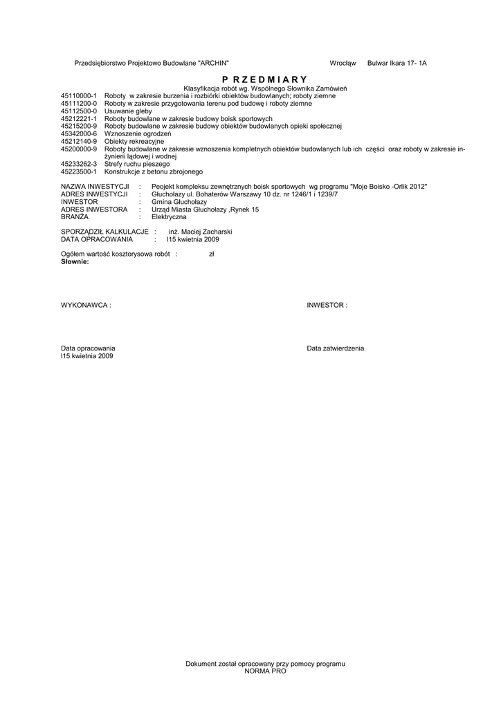 Przedsiębiorstwo Projektowo Budowlane "ARCHIN" Wrocłąw Bulwar Ikara 17- 1A P RZEDMIARY 45110000-1 45111200-0 45112500-0 45212221-1 45215200-9 45342000-6 45212140-9 45200000-9 45233262-3 45223500-1 Klasyfikacja robót wg. Wspólnego Słownika Zamówień Roboty w zakresie burzenia i rozbiórki obiektów budowlanych; roboty ziemne Roboty w zakresie przygotowania terenu pod budowę i roboty ziemne Usuwanie gleby Roboty budowlane w zakresie budowy boisk sportowych Roboty budowlane w zakresie budowy obiektów budowlanych opieki społecznej Wznoszenie ogrodzeń Obiekty rekreacyjne Roboty budowlane w zakresie wznoszenia kompletnych obiektów budowlanych lub ich części oraz roboty w zakresie inŜynierii lądowej i wodnej Strefy ruchu pieszego Konstrukcje z betonu zbrojonego NAZWA INWESTYCJI ADRES INWESTYCJI INWESTOR ADRES INWESTORA BRANśA : : : : : Peojekt kompleksu zewnętrznych boisk sportowych wg programu "Moje Boisko -Orlik 2012" Głuchołazy ul. Bohaterów Warszawy 10 dz. nr 1246/1 i 1239/7 Gmina Głuchołazy Urząd Miasta Głuchołazy ,Rynek 15 Elektryczna SPORZĄDZIŁ KALKULACJE : DATA OPRACOWANIA : inŜ. Maciej Zacharski l15 kwietnia 2009 Ogółem wartość kosztorysowa robót : Słownie: zł WYKONAWCA : INWESTOR : Data opracowania l15 kwietnia 2009 Data zatwierdzenia Dokument został opracowany przy pomocy programu NORMA PRO OGÓLNA CHARAKTERYSTYKA OBIEKTU Kosztorys sporządzony na podstawie projektu budowlano -wykonawczego f-y" ARCHIN" obejmuje zakres inwestycji związanych z wykonaniem : - robót demontaŜowych i wyburzeniowych, - robót rozbiórkowych , - boiska wielofunkcyjnego 27,0 x 44,0 m o nawierzchni kauczukowo-poliuretanowej na podbudowie z kruszywa łamanego - boiska piłkarskiego 39,0 x 66,0 m o nawierzchni ze sztucznej trawy na podbudowie z kruszywa łamanego - piłkołapów przy boiskach , - trybun ziemnych, - skoczni w dal o rozbieŜni z nawierzchni poliuretanowo-kauczukowej, - bieŜni z nawierzchni poliuretanowo-kauczukowej, - dróg pieszojezdnych z kostki betonowej , - placu do tenisa stołowego o nawierzchni z kostki brukowej betonowej, - montaŜu elementów małej architektury : ławek i koszy na śmieci , - wymiany ogrodzenia DANE WYJŚCIOWE DO KOSZTORYSOWANIA Przedmioty zdemontowane przez wykonawcę zostają przez niego zmagazynowane na terenie budowy w miejscu wskazanym przez Inspektora nadzoru. Elementy te pozostają własnością Inwestora . Humus zdjęty z obszaru przeznaczonego pod zainwestowanie jest własnością Zleceniodawcy i sposób jego wykorzystania uzgodniony zostanie z Inspektorem nadzoru.Kosztorys uwzględnia odwiezienie humusu na odległość do 1,0 km. Przyjęto mechaniczną rozbiórkę istniejącej płyty o nawierzchni asfaltowej.Materiał z rozbiurki naleŜy przeznaczyć do powtórnej przeróbki w wytwórni mas asfaltowych. Podbudowę pod istniejącą płytą asfaltową ,przewidziano do złoŜenia na odkład przy budowanym obiekcie oraz jego powtórne wbudowanie w podbudowę nawierzchni noweggo boiska. W kosztorysie ujęto demontaŜ istniejącego od strony północnej ogrodzenia drewnianego/ długość wchodząca w obszar zainwestowania/ oraz przesunięcie i remont tego odcinka. Do kosztorysowania przyjęto uŜycie materiałów nowych. Przyjęto wywiezienie nadmiaru ziemi , gruzu i śmieci na wysypisko odległe o 1 km od placu budowy . Przyjęto dostawę kruszywa piasku z kopalni miejscowej . Kosztorys uwzględnia koszty składowania ziemi i gruzu średnie dla Dolnego Śląska . Kosztorysowanie zgodne z zasadami przyjętymi w KNR -ach. -2- Norma PRO Wersja 4.11 Licencja: 7575 dla PPBH "Archin" Lp. Podstawa Nr Opis i wyliczenia spe c. tech n. Boiska Orlik 2012 w GŁUCHOŁAZACH 1 Oświetlenie boisk 1 KNR 2-01 Ręczne kopanie rowów dla kabli o głębok.do 0.8 m i szer.dna do d.1 0701-02 0.4 w gruncie kat. III sieć oświetle240+35.0 nia j.m. Poszcz m m 275.000 RAZEM 2 KNR 5-10 d.1 0301-01 sieć oświetlenia Nasypanie warstwy piasku grubości 0.1 m na dno rowu kablowego m o szer.do 0.4 m 240.0+35.0 m 3 KNR 5-10 d.1 0103-04 Ręczne układanie kabli wieloŜyłowych 5x16 w rowach kablowych m 281.0 m Ręczne układanie kabli wieloŜyłowych o masie doYKYŜo 5x25 na napięcie znamionowe poniŜej 110 kV w rowach kablowych 36.0 m 4 KNR-W 5-10 d.1 0103-04 m 5 KNR 2-01 d.1 0704-02 sieć oświetlenia Ręczne zasypywanie rowów dla kabli o głębok.do 0.4 m i szer.dna m do 0.4 m w gruncie kat. III 240.0+35.0 m 6 KNR 4-03 d.1 1201-01 Sprawdzenie stanu izolacji induktorem przew. 5*2 przew. 8 KNR 4-03 d.1 1203-01 9 KNR 4-03 d.1 1205-03 10 KNR 4-03 d.1 1205-04 11 KNR 4-03 d.1 1205-05 12 KNR 4-03 d.1 1205-06 13 KNR-W 5-10 d.1 0303-01 14 KNR 5-10 d.1 0604-07 15 KNR 5-10 d.1 0604-06 16 KNR-W 5-10 d.1 0114-02 17 KNR 5-10 d.1 0709-03 18 KNR 5-10 d.1 0709-03 Sprawdzenie i pomiar kompletnego 3-fazowego obwodu elektrycz- pomiar. nego niskiego napięcia 2 pomiar. Badanie linii kablowej o ilości Ŝył do 5 odc. 2 odc. Pierwszy pomiar instalacji odgromowej pomiar. 1 pomiar. Następny pomiar instalacji odgromowej pomiar. 12 pomiar. Pierwszy pomiar skuteczności ochrony przeciwporaŜeniowej pomiar. 1 pomiar. Następny pomiar skuteczności zerowania pomiar. 13 pomiar. 275.000 275.000 RAZEM 275.000 281.000 RAZEM 281.000 36.000 RAZEM 36.000 275.000 RAZEM 7 KNR 4-03 d.1 1202-02 Razem 275.000 10.000 RAZEM 10.000 2.000 RAZEM 2.000 2.000 RAZEM 2.000 1.000 RAZEM 1.000 12.000 RAZEM 12.000 1.000 RAZEM 1.000 13.000 RAZEM 13.000 0.000 RAZEM 0.000 10.000 RAZEM 10.000 105.000 RAZEM 105.000 260.000 RAZEM 260.000 8.000 RAZEM 8.000 2.000 RAZEM 2.000 Układanie rur ochronnych z PCW o średnicy do 75 mm w wykopie m 0 m Zarobienie Końcówek kabla YKYŜo 5x25 szt. 2*5 szt. Zarobienie końcówek kabla YKYŜo 5x16 szt. 10*5*2+5 szt. Układanie kabli YKYŜo 3 x 2,05mm2w rurach i masztach oświetle- m niowych 260 m Mechaniczne stawianie słupów oświetleniowych H-10 m w gruncie szt. kat.I-III 8 szt. Mechaniczne stawianie słupów oświetleniowych H-4,5 m w gruncie szt. kat.I-III 2 szt. -3- Nor