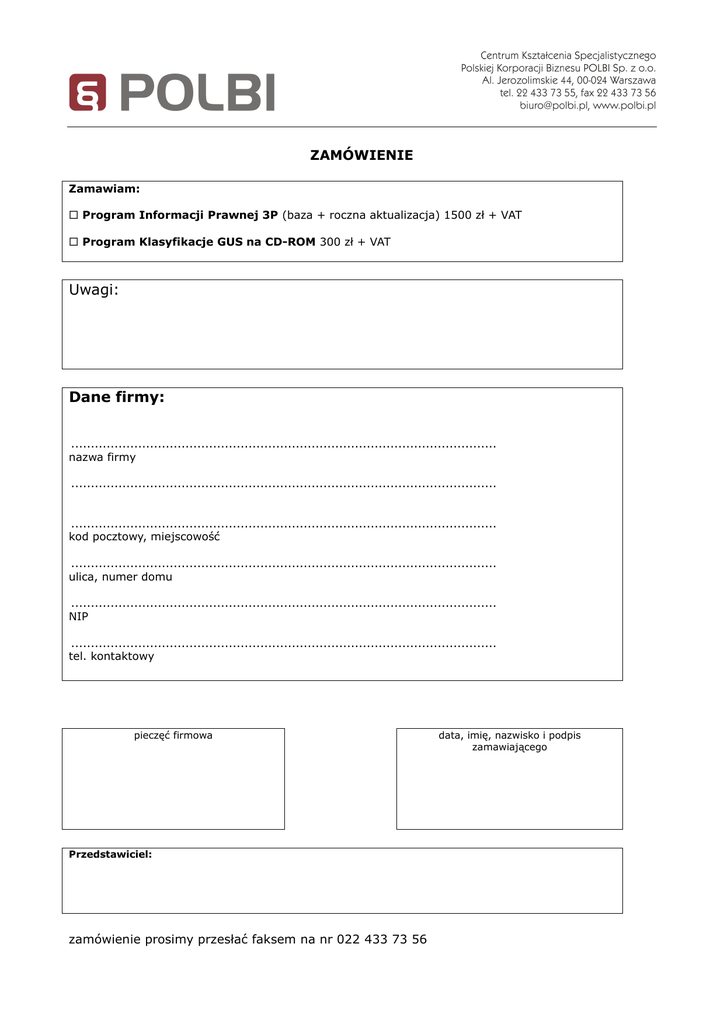 ZAMÓWIENIE Zamawiam: Program Informacji Prawnej 3P (baza + roczna aktualizacja) 1500 zł + VAT Program Klasyfikacje GUS na CD-ROM 300 zł + VAT Uwagi: Dane firmy: ............................................................................................................ nazwa firmy ............................................................................................................ ............................................................................................................ kod pocztowy, miejscowość ............................................................................................................ ulica, numer domu ............................................................................................................ NIP ............................................................................................................ tel. kontaktowy pieczęć firmowa Przedstawiciel: zamówienie prosimy przesłać faksem na nr 022 433 73 56 data, imię, nazwisko i podpis zamawiającego