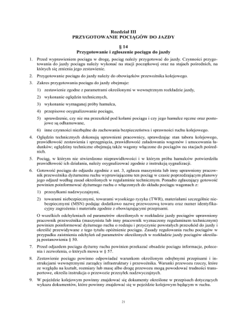 Rozdział III PRZYGOTOWANIE POCIĄGÓW DO JAZDY § 14 Przygotowanie i zgłoszenie pociągu do jazdy 1. Przed wyprawieniem pociągu w drogę, pociąg naleŜy przygotować do jazdy. Czynności przygotowania do jazdy pociągu naleŜy wykonać na stacji początkowej oraz na stajach pośrednich, na których się zmienia jego zestawienie. 2. Przygotowanie pociągu do jazdy naleŜy do obowiązków przewoźnika kolejowego. 3. Zakres przygotowania pociągu do jazdy obejmuje: 1) zestawienie zgodne z parametrami określonymi w wewnętrznym rozkładzie jazdy, 2) wykonanie oględzin technicznych, 3) wykonanie wymaganej próby hamulca, 4) przepisowe osygnalizowanie pociągu, 5) sprawdzenie, czy nie ma przeszkód pod kołami pociągu i czy jego hamulce ręczne oraz postojowe są odhamowane, 6) inne czynności niezbędne do zachowania bezpieczeństwa i sprawności ruchu kolejowego. 4. Oględzin technicznych dokonują uprawnieni pracownicy, sprawdzając stan taboru kolejowego, prawidłowość zestawienia i sprzęgnięcia, prawidłowość załadowania wagonów i umocowania ładunków; oględziny techniczne obejmują takŜe wagony włączone do pociągów na stacjach pośrednich. 5. Pociąg, w którym nie stwierdzono nieprawidłowości i w którym próba hamulców potwierdziła prawidłowość ich działania, naleŜy osygnalizować zgodnie z instrukcją sygnalizacji. 6. Gotowość pociągu do odjazdu zgodnie z ust. 3, zgłasza maszynista lub inny uprawniony pracownik przewoźnika dyŜurnemu ruchu wyprawiającemu ten pociąg w czasie poprzedzającym planowy jego odjazd według zasad określonych w regulaminie technicznym. Ponadto zgłaszający gotowość powinien poinformować dyŜurnego ruchu o włączonych do składu pociągu wagonach z: 1) przesyłkami nadzwyczajnymi, 2) towarami niebezpiecznymi, towarami wysokiego ryzyka (TWR), materiałami szczególnie niebezpiecznymi (MSN) podając dodatkowo nazwę przewozową towaru oraz numer identyfikacyjny zagroŜenia i materiału zgodnie z obowiązującymi przepisami. O wszelkich odchyleniach od parametrów określonych w rozkładzie jazdy pociągów uprawniony pracownik przewoźnika (maszynista lub inny pracownik wyznaczony regulaminem technicznym) powinien poinformować dyŜurnego ruchu o rodzaju i przyczynie powstałych przeszkód do jazdy i określić przewidywane z tego tytułu opóźnienie pociągu. Zasady regulowania ruchu pociągów w przypadku zaistnienia odchyleń od parametrów określonych w rozkładzie jazdy pociągów określają postanowienia § 50. 7. Przed odjazdem pociągu dyŜurny ruchu powinien przekazać obsadzie pociągu informacje, polecenia i zezwolenia, o których mowa w § 57. 8. Zestawienie pociągu powinno odpowiadać warunkom określonym odrębnymi przepisami i instrukcjami wewnętrznymi zarządcy infrastruktury i przewoźnika. Warunki przewozu rzeczy, które ze względu na kształt, rozmiary lub masę albo drogę przewozu mogą powodować trudności transportowe, określa instrukcja o przewozie przesyłek nadzwyczajnych. 9. W pojeździe kolejowym powinny znajdować się dokumenty określone w przepisach dotyczących wykazu dokumentów, które powinny znajdować się w pojeździe kolejowym będącym w ruchu. 21 § 15 Obsada pociągu 1. Obsadę pociągu stanowi druŜyna pociągowa, w skład której wchodzi druŜyna trakcyjna oraz druŜyna konduktorska lub tylko druŜyna trakcyjna. W pociągach bez obsady konduktorskiej czynności druŜyny konduktorskiej wykonuje druŜyna trakcyjna. 2. DruŜyna trakcyjna moŜe być jedno- lub dwuosobowa; w razie potrzeby druŜyna trakcyjna moŜe składać się z większej liczby osób. 3. Jednoosobową obsługę trakcyjną stosuje się: 1) w pociągach kursujących na liniach kolejowych z prędkością nieprzekraczającą 130 km/h i z lokomotywami wyposaŜonymi w urządzenia kontrolujące czujność maszynisty oraz urządzenia radiołączności pociągowej, przy czym jeŜeli urządzenia kontrolujące czujność maszynisty w kabinie sterowniczej nie wymagają współpracy z urządzeniami przytorowymi, jednoosobową obsługę moŜna stosować takŜe na liniach kolejowych niewyposaŜonych w te urządzenia, 2) we wszystkich pociągach kursujących na liniach kolejowych i z pojazdami trakcyjnymi wyposaŜonymi w urządzenia kontroli prowadzenia pociągu, nadzorujące przynajmniej hamowanie pociągu przy dojeździe do sygnału nakazującego zatrzymanie lub zmniejszenie prędkości, oraz w urządzenia radiołączności pociągowej. 4. Pociągi pasaŜerskie powinny mieć obsadę konduktorską składającą się co najmniej z kierownika pociągu, o ile jego zadania ruchowe nie są wykonywane przez innego pracownika lub przez urządzenia wyposaŜenia technicznego. Pociągi pasaŜerskie mogą jeździć bez kierownika pociągu, jeŜeli zamykanie drzwi pojazdu kolejowego przy wymianie podróŜnych jest zapewnione, a zamknięcie drzwi jest zgłaszane kierującemu pojazdem kolejowym z napędem za pomocą urządzeń technicznych. 5. W przypadkach szczególnych takich jak uszkodzenie urządzeń kontrolujących czujność maszynisty lub urządzeń kontroli prowadzenia pociągu albo urządzeń radiołączności, przy jednoosobowej druŜynie trakcyjnej, kierownik pociągu na wezwanie maszynisty powinien zająć miejsce w kabinie sterowniczej. W przypadku braku kierownika pociągu maszynista ma obowiązek doprowadzić pociąg do najbliŜszej stacji. Dalszy sposób postępowania określa przewoźnik w przepisach wewnętrznych. 6. Szczegółowe warunki dotyczące obsady pociągu określa przewoźnik kolejowy w przepisach wewnętrznych. 7. W pociągach uruchamianych dla potrzeb PKP PLK S.A. czynności kierownika pociągu moŜe wykonywać inny pracownik spełniający wymagania kwalifikacyjne i zdrowotne określone w odrębnych przepisach i nie będący jednocześnie kierującym pojazdem kolejowym. § 16 Znajomość linii kolejowych przez druŜynę pociągową 1. Prowadzący pojazd kolejowy z napędem powinien znać warunki miejs
