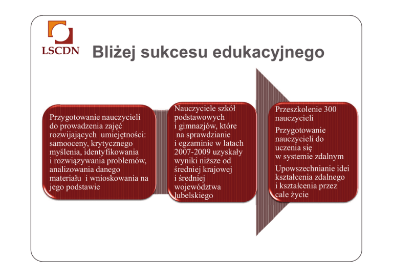Bliżej sukcesu edukacyjnego Przygotowanie nauczycieli do prowadzenia zajęć rozwijających umiejętności: samooceny, krytycznego myślenia, identyfikowania i rozwiązywania problemów, analizowania danego materiału i wnioskowania na jego podstawie Nauczyciele szkół podstawowych i gimnazjów, które na sprawdzianie i egzaminie w latach 2007-2009 uzyskały wyniki niższe od średniej krajowej i średniej województwa lubelskiego Przeszkolenie 300 nauczycieli Przygotowanie nauczycieli do uczenia się w systemie zdalnym Upowszechnianie idei kształcenia zdalnego i kształcenia przez cale życie Bliżej sukcesu edukacyjnego Bliżej sukcesu egaminacyjnego Opracowanie programu wielomodułowego szkolenia i jego uruchomienie na platformie Moodle Forum dyskusyjne dla uczestników po zakończeniu szkolenia Szkolenia zdalne Szkolenia stacjonarne Organizacja konferencji upubliczniającej efekty szkoleń Wyposażenie uczestników w pomoce dydaktyczne - podręczniki, słowniki, poradniki Przygotowanie materiałów edukacyjnych z wykorzystaniem multimediów dla 300 nauczycieli Organizacja konferencji wprowadzających w problematykę projektu Publikacja 3 autorskich pakietów edukacyjnych „Bliżej sukcesu egzaminacyjnego” adresowanych do nauczycieli szkół podstawowych i gimnazjów Publikacja materiałów konferencyjnych w wersji elektronicznej Realizacja 300 warsztatów z uczniem w oparciu o autorskie programy uczestników szkolenia Przygotowanie merytoryczne i organizacyjne grupy edukatorskiej