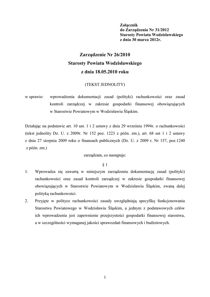 Załącznik do Zarządzenia Nr 31/2012 Starosty Powiatu Wodzisławskiego z dnia 30 marca 2012r. Zarządzenie Nr 26/2010 Starosty Powiatu Wodzisławskiego z dnia 18.05.2010 roku (TEKST JEDNOLITY) w sprawie: wprowadzenia dokumentacji zasad (polityki) rachunkowości oraz zasad kontroli zarządczej w zakresie gospodarki finansowej obowiązujących w Starostwie Powiatowym w Wodzisławiu Śląskim. Działając na podstawie art. 10 ust. 1 i 2 ustawy z dnia 29 września 1994r. o rachunkowości (tekst jednolity Dz. U. z 2009r. Nr 152 poz. 1223 z późn. zm.), art. 68 ust 1 i 2 ustawy z dnia 27 sierpnia 2009 roku o finansach publicznych (Dz. U. z 2009 r. Nr 157, poz.1240 z późn. zm.) zarządzam, co następuje: §1 1. Wprowadza się zawartą w niniejszym zarządzeniu dokumentację zasad (polityki) rachunkowości oraz zasad kontroli zarządczej w zakresie gospodarki finansowej obowiązujących w Starostwie Powiatowym w Wodzisławiu Śląskim, zwaną dalej polityką rachunkowości. 2. Przyjęte w polityce rachunkowości zasady uwzględniają specyfikę funkcjonowania Starostwa Powiatowego w Wodzisławiu Śląskim, a jednym z podstawowych celów ich wprowadzenia jest zapewnienie przejrzystości gospodarki finansowej starostwa, a w szczególności wymaganej jakości sprawozdań finansowych i budżetowych. 1 Rozdział I Przepisy ogólne §2 Ilekroć w dokumentacji zasad (polityki) rachunkowości oraz kontroli finansowej obowiązujących w Starostwie Powiatowym w Wodzisławiu Śląskim mowa o: 1) powiecie - należy przez to rozumieć Powiat Wodzisławski, 2) właściwych organach powiatu - należy przez to rozumieć Radę Powiatu i/lub Zarząd Powiatu Wodzisławskiego, 3) zarządzie - należy przez to rozumieć Zarząd Powiatu Wodzisławskiego, 4) radzie - należy przez to rozumieć Radę Powiatu Wodzisławskiego, 5) starostwie, jednostce - należy przez to rozumieć Starostwo Powiatowe w Wodzisławiu Śląskim, 6) kierowniku jednostki - należy przez to rozumieć Starostę Powiatu Wodzisławskiego, 7) staroście - należy przez to rozumieć Starostę Powiatu Wodzisławskiego, 8) budżecie - należy przez to rozumieć budżet Powiatu Wodzisławskiego w rozumieniu art. 211 ustawy o finansach publicznych, 9) skarbniku - należy przez to rozumieć Skarbnika Powiatu Wodzisławskiego, 10) głównym księgowym - należy przez to rozumieć głównego księgowego starostwa, powiatowej jednostki budżetowej, 11) dysponencie środków budżetowych - należy przez to rozumieć właściwą komórkę organizacyjną starostwa merytorycznie odpowiedzialną za dokonywane wydatki ujęte w planie finansowym jednostki, 12) planach finansowych wydatków - należy przez to rozumieć sporządzone na podstawie powszechnie obowiązujących przepisów prawa, uchwały budżetowej plany finansowe w szczególności dla starostwa, 13) komórce organizacyjnej - należy przez to rozumieć wyodrębniony -zgodnie z obowiązującym regulaminem organizacyjnym- wydział lub biuro starostwa powiatowego, 14) wydziale finansowym - należy przez to rozumieć właściwy do spraw finansów i budżetu wydział starostwa odpowiedzialny za finansową, księgową i budżetową realizację wydatków, dochodów, przychodów i rozchodów. 2 15) kierowniku komórki organizacyjnej, naczelniku - należy przez to rozumieć osobę kierującą, zgodnie z obowiązującym regulaminem organizacyjnym, wyodrębnionym wydziałem lub biurem starostwa, 16) (skreślony) 17) ustawie o rachunkowości należy - przez to rozumieć ustawę z dnia 29 września 1994r. o rachunkowości (tekst jednolity Dz. U. z 2009r. Nr 152 poz. 1223 z późn. zm.), 18) ustawie o samorządzie powiatowym - należy przez to rozumieć ustawę z dnia 5 czerwca 1998r. o samorządzie powiatowym (tekst jednolity Dz. U. z 2001 Nr 142 poz. 1592 z późn. zm.), 19) ustawie o finansach publicznych - należy przez to rozumieć ustawę z dnia 27 sierpnia 2009r. o finansach publicznych (Dz. U. z 2009r. Nr 157 poz. 1240 z późn. zm.), 20) klasyfikacji budżetowej - należy przez to rozumieć klasyfikację uregulowaną normami zawartymi w rozporządzeniu Ministra Finansów w sprawie szczegółowej klasyfikacji dochodów, wydatków, przychodów i rozchodów oraz środków pochodzących ze źródeł zagranicznych, wydanym na podstawie ustawy o finansach publicznych, 21) sprawozdawczości budżetowej - należy przez to rozumieć normy zawarte w rozporządzeniu Ministra Finansów w sprawie sprawozdawczości budżetowej, wydanym na podstawie ustawy o finansach publicznych, 22) sprawozdaniach budżetowych - należy przez to rozumieć sprawozdania sporządzane zgodnie z zasadami przyjętymi w rozporządzeniu w sprawie sprawozdawczości budżetowej. 23) rozporządzeniu w sprawie szczególnych zasad rachunkowości - należy przez to rozumieć rozporządzenie Ministra Finansów w sprawie szczególnych zasad rachunkowości oraz planów kont dla budżetu państwa, budżetów jednostek samorządu terytorialnego oraz niektórych jednostek sektora finansów publicznych, wydanym na podstawie ustawy o finansach publicznych, 24) sprawozdaniach finansowych - należy przez to rozumieć sprawozdania -w szczególności bilanse- sporządzane w trybie określonym w rozporządzeniu w sprawie szczególnych zasad rachunkowości, 3 25) rozporządzeniu w sprawie klasyfikacji środków trwałych - należy przez to rozumieć rozporządzenie Rady Ministrów w sprawie klasyfikacji środków trwałych, 26) procedurze uchwalania budżetu – należy przez to rozumieć obowiązującą w powiecie uchwałę organu stanowiącego wydaną na podstawie ustawy o finansach publicznych, 27) rachunku bankowym budżetu - należy przez to rozumieć wyodrębniony rachunek bankowy przeznaczony do dokonywania operacji związanych z prowadzeniem rozliczeń w zakresie budżetu powiatu, tj. dochodów, przychodów, wydatków i rozchodów. 28) rachunku bankowym jednostki - należy przez to rozumieć odrębny rachunek bankowy starostwa, na który pobierane s