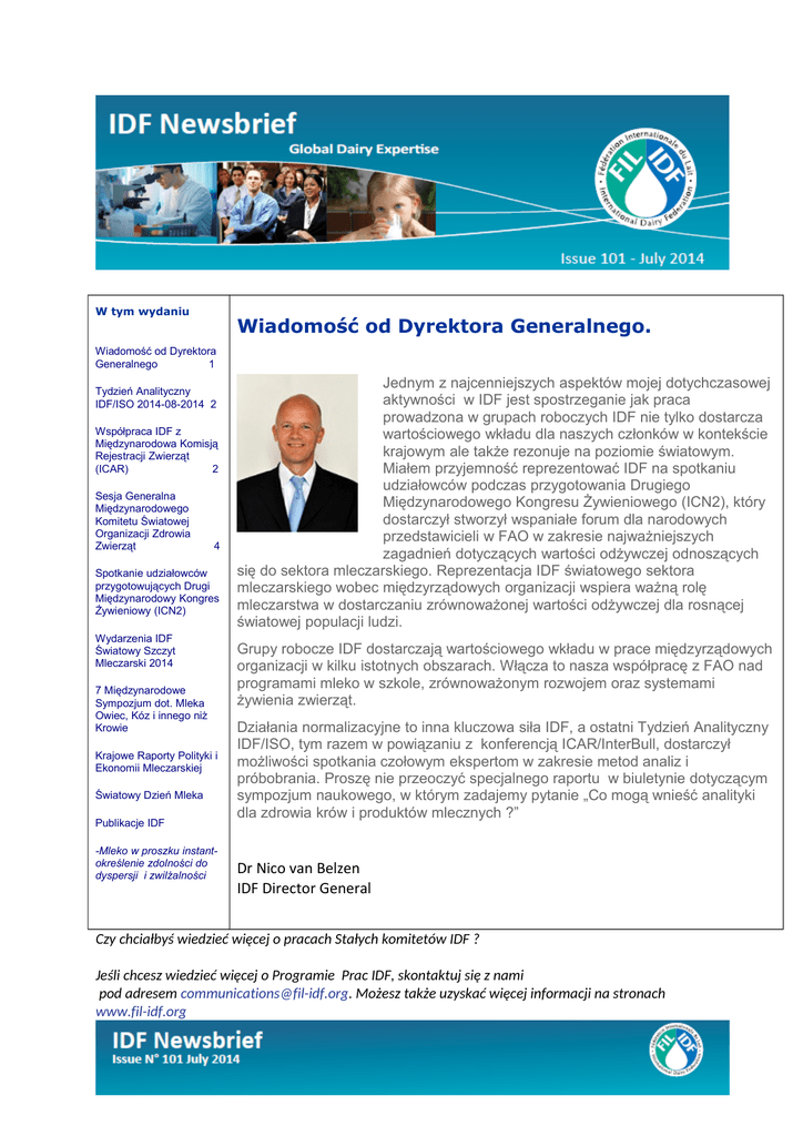 W tym wydaniu Wiadomość od Dyrektora Generalnego. Wiadomość od Dyrektora Generalnego 1 Tydzień Analityczny IDF/ISO 2014-08-2014 2 Współpraca IDF z Międzynarodowa Komisją Rejestracji Zwierząt (ICAR) 2 Sesja Generalna Międzynarodowego Komitetu Światowej Organizacji Zdrowia Zwierząt 4 Spotkanie udziałowców przygotowujących Drugi Międzynarodowy Kongres Żywieniowy (ICN2) Wydarzenia IDF Światowy Szczyt Mleczarski 2014 7 Międzynarodowe Sympozjum dot. Mleka Owiec, Kóz i innego niż Krowie Krajowe Raporty Polityki i Ekonomii Mleczarskiej Światowy Dzień Mleka Publikacje IDF -Mleko w proszku instantokreślenie zdolności do dyspersji i zwilżalności Jednym z najcenniejszych aspektów mojej dotychczasowej aktywności w IDF jest spostrzeganie jak praca prowadzona w grupach roboczych IDF nie tylko dostarcza wartościowego wkładu dla naszych członków w kontekście krajowym ale także rezonuje na poziomie światowym. Miałem przyjemność reprezentować IDF na spotkaniu udziałowców podczas przygotowania Drugiego Międzynarodowego Kongresu Żywieniowego (ICN2), który dostarczył stworzył wspaniałe forum dla narodowych przedstawicieli w FAO w zakresie najważniejszych zagadnień dotyczących wartości odżywczej odnoszących się do sektora mleczarskiego. Reprezentacja IDF światowego sektora mleczarskiego wobec międzyrządowych organizacji wspiera ważną rolę mleczarstwa w dostarczaniu zrównoważonej wartości odżywczej dla rosnącej światowej populacji ludzi. Grupy robocze IDF dostarczają wartościowego wkładu w prace międzyrządowych organizacji w kilku istotnych obszarach. Włącza to nasza współpracę z FAO nad programami mleko w szkole, zrównoważonym rozwojem oraz systemami żywienia zwierząt. Działania normalizacyjne to inna kluczowa siła IDF, a ostatni Tydzień Analityczny IDF/ISO, tym razem w powiązaniu z konferencją ICAR/InterBull, dostarczył możliwości spotkania czołowym ekspertom w zakresie metod analiz i próbobrania. Proszę nie przeoczyć specjalnego raportu w biuletynie dotyczącym sympozjum naukowego, w którym zadajemy pytanie „Co mogą wnieść analityki dla zdrowia krów i produktów mlecznych ?” Dr Nico van Belzen IDF Director General Czy chciałbyś wiedzieć więcej o pracach Stałych komitetów IDF ? Jeśli chcesz wiedzieć więcej o Programie Prac IDF, skontaktuj się z nami pod adresem [email protected]. Możesz także uzyskać więcej informacji na stronach www.fil-idf.org Tydzień Analityczny IDF/ISO 2014 Tydzień Analityczny IDF/ISO 2014 miał miejsce w dniach 15-20 maja w Berlinie, Niemcy. Brało w nim udział 150 ekspertów analityków z całego świata, którzy przybyli aby razem tworzyć i rozwijać program prac IDF/ISO. Tydzień Analityczny nie tylko służy wzmacnianiu relacji pomiędzy poszczególnymi ekspertami oraz grupami projektowymi, ale także pomiędzy zaangażowanymi organizacjami. Po raz pierwszy Tydzień Analityczny IDF/ISO był prowadzony w powiązaniu z konferencją ICAR/Interbull. Naukowe Sympozjum, które miało miejsce 17 maja, służyło w szczególności połączeniu dwóch światów IDF/ISO i ICAR i zademonstrowaniu wartości współpracy pomiędzy tymi organizacjami. Jaki wkład mogą wnieść analityki dla zdrowia krów I mlecznych produktów ? Sympozjum Naukowe IDF/ISO, 17 maja 2014 Sympozjum Naukowe IDF/ISO dostarcza Cennej platformy do zaprezentowania I dyskusji ostatnich osiągnięć na polu analitycznym. Zadając pytanie „Jaki wkład mogą wnieść analityki dla zdrowia krów i zdrowych produktów mleczarskich ?” Sympozjum naświetliło kluczowa rolę analityk i normalizacji na różnych etapach łańcucha mlecznego. Eksperci analitycy zgromadzeni w Berlinie, Niemcy na Sympozjum Naukowym IDF/ISO Pierwsza sesja dostarczyła uczestnikom jasnego wrażenia potencjału jakie maja metody analiz i próbowania (MAS) dla tworzenia wartości dla udziałowców. W prezentacji która przedstawił Jaap Evers’ (IDF), “ Rola analityk mleczarskich-punkt widzenia IDF” wyjaśnił on jak funkcjonują MAS jako istotne elementy bezpieczeństwa i poprawy jakości, wydajności oraz ostatecznie opłacalności. W jaki sposób IDF tworzy wartość dla globalnych udziałowców mleczarskich poprzez MAS. Evers wyjaśniał w jaki sposób IDF buduje swoja pozycję pozostawania światowym głosem dla sektora mleka w przyszłości. Z uwagi na to, że rynki stają się coraz bardziej wzajemnie połączone, pojawia się więcej użytkowników analitycznych standardów. To włącza rosnące zapotrzebowanie w odniesieniu do mleka i mlecznych produktów, zagadnień bezpieczeństwa żywności i polityk mleczarskich. IDF, poprzez swoje relacje z ISO, opublikował ponad 170 Standardów i kontynuuje globalne forum dla rozwoju normalizacji. IDF, jako obserwator w Kodeksie, jest głównym dostarczającym techniczny wkład dla Kodeksowego Komitetu Metod i Analiz. IDF jest unikalną organizacją zdolna do dostarczania takich technicznych ekspertyz na poziomie światowym. Znaczenie rzetelnych danych Sympozjum dostarczyło także dane przykładowe z sektora niemieckiego, gdzie Udo Folgart (VDM) i Folkert Onken (DLQ) demonstrowali jak analityki są osadzone w niemieckim biznesie mleczarskim. To ma miejsce nie tylko na poziomie farmy, gdzie rzetelne dane są używane dla promowania efektywnych i ekonomicznych decyzji zarządzania farmami, ale także na poziomie regionalnym i krajowym, gdzie program “milchQplus” zbiera i oszacowuje dane dla poprawy zdrowia wymion. Znaczenie systematycznej interpretacji zgromadzonych danych zostało podkreślone przez Dörte Döpfer (Wisconsin University), która podała w szczegółach jak są używane matematyczne modele dla identyfikacji ważnych czynników prognostycznych chorób. Od prawej do lewej: H. van den Bijgaart, D. Döpfer, U. Folgart S. Orlandini, C. Baumgartner, J. Evers, T. Berger Budowanie międzynarodowego systemu referencyjnego Druga sesja była nakierowana na wspólny proje