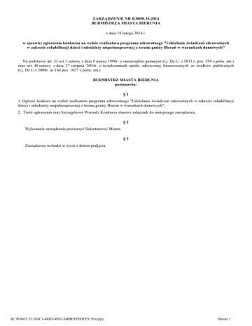 ZARZĄDZENIE NR B.0050.36.2014 BURMISTRZA MIASTA BIERUNIA z dnia 18 lutego 2014 r. w sprawie: ogłoszenia konkursu na wybór realizatora programu zdrowotnego "Udzielanie świadczeń zdrowotnych w zakresie rehabilitacji dzieci i młodzieży niepełnosprawnej z terenu gminy Bieruń w warunkach domowych" Na podstawie art. 33 ust.1 ustawy z dnia 8 marca 1990r. o samorządzie gminnym (t.j. Dz.U. z 2013 r. poz. 594 z późn. zm.) oraz art. 48 ustawy z dnia 27 sierpnia 2004r. o świadczeniach opieki zdrowotnej finansowanych ze środków publicznych (t.j. Dz.U.z 2008r. nr 164 poz. 1027 z późn. zm.) BURMISTRZ MIASTA BIERUNIA postanawia: §1 1. Ogłosić konkurs na wybór realizatora programu zdrowotnego "Udzielanie świadczeń zdrowotnych w zakresie rehabilitacji dzieci i młodzieży niepełnosprawnej z terenu gminy Bieruń w warunkach domowych". 2. Treść ogłoszenia oraz Szczegółowe Warunki Konkursu stanowi załącznik do niniejszego zarządzenia. §2 Wykonanie zarządzenia powierzyć Sekretarzowi Miasta. §3 Zarządzenie wchodzi w życie z dniem podjęcia. Id: 9F46CC7C-9AC1-48B3-8F02-54BB5FF0DFE9. Przyjęty Strona 1 Załącznik do Zarządzenia Nr B.0050.36.2014 Burmistrza Miasta Bierunia z dnia 18.02.2014r. Bieruń, dnia ……………. BURMISTRZ MIASTA BIERUNIA Siedziba: Urząd Miejski 43-150 Bieruń, ul. Rynek 14 tel. 032/ 324 24 00, fax. 032/ 216 47 77, www.bierun.pl na podstawie art. 48 ustawy z dnia 27 sierpnia 2004r. o świadczeniach opieki zdrowotnej finansowanych ze środków publicznych (t.j. Dz. U. z 2008 r. Nr 164, poz. 1027 z późn. zm) oraz art. 114 - 116 ustawy z dnia 15 kwietnia 2011r. o działalności leczniczej (t.j. Dz. U. z 2013r., poz. 217). OGŁASZA KONKURS OFERT dla podmiotów leczniczych w rozumieniu ustawy z o działalności leczniczej (t.j. Dz. U. z 2013r., poz. 217). dnia 15 kwietnia 2011r. Przedmiotem konkursu jest wybór realizatora programu zdrowotnego dot. „Udzielania świadczeń zdrowotnych w zakresie rehabilitacji dzieci i młodzieży niepełnosprawnej z terenu gminy Bieruń w warunkach domowych”. Szacunkowa liczba osób ubezpieczonych objętych świadczeniem wynosi 50. Wymagania stawiane oferentom, niezbędne do realizacji programu zdrowotnego: spełnią wszystkie wymagania wynikające z oświadczeń i dokumentów, których listę przedstawiono w Szczegółowych Warunkach Konkursu (SWK) oraz inne wymagania tam określone; - wskażą do realizacji programu Zespół Rehabilitacji Domowej, w skład którego wchodzą : kierownik zespołu – lekarz rehabilitacji medycznej, posiadający doświadczenie w pracy – leczeniu dzieci, szczególne z MPD, 5-7 fizjoterapeutów (magistrów rehabilitacji ruchowej, fizjoterapii), posiadających min. dwuletni staż w prowadzeniu rehabilitacji dzieci, szczególnie z MPD. Szczegółowe warunki konkursu w tym projekt umowy, obowiązujące formularze oferty, dostępne są w Urzędzie Miejskim w Bieruniu , ul. Rynek 14 ( pokój nr 13) w godzinach urzędowania oraz na stronie internetowej www.bierun.pl. - Termin realizacji umowy: od podpisania umowy do 31.12.2015r. Oferty można składać w Urzędzie Miejskim - Bieruń, ul. Rynek 14 ( kancelaria - parter ) w terminie 15 dni od dnia ukazanie się ogłoszenia o konkursie. Termin związania z ofertą wynosi 30 dni od upływu terminu składania ofert. Id: 9F46CC7C-9AC1-48B3-8F02-54BB5FF0DFE9. Przyjęty Strona 1 Ocena ofert nastąpi na podstawie złożonych oświadczeń i dokumentów. Rozstrzygnięcia konkursu dokona komisja konkursowa w terminie do 14 dni od upływu terminu do składania ofert. Zamawiający zastrzega sobie prawo do przesunięcia terminu składania ofert oraz odwołania konkursu. Id: 9F46CC7C-9AC1-48B3-8F02-54BB5FF0DFE9. Przyjęty Strona 2 SZCZEGÓŁOWE WARUNKI KONKURSU NA WYBÓR REALIZATORA PROGRAMU ZDROWOTNEGO DOTYCZĄCEGO: „UDZIELANIA ŚWIADCZEŃ ZDROWOTNYCH W ZAKRESIE REHABILITACJI DZIECI I MŁODZIEŻY NIEPEŁNOSPRAWNEJ Z TERENU GMINY BIERUŃ W WARUNKACH DOMOWYCH”. I. Informacje wstępne 1.Zamawiający Zamawiającym jest: gmina Bieruń reprezentowana przez Burmistrza Miasta. Adres: 43-150 Bieruń, ul. Rynek 14 telefon: 032/ 324-24-00, fax: 032/ 216 47 77 Strona internetowa: www.bierun.pl Godziny urzędowania: poniedziałki, wtorki, czwartki: od 730 do 1530, środy od 730 do 1700, piątki od 730 do 1400 2.Tryb postępowania Postępowanie o udzielenie świadczenia zdrowotnego prowadzone jest w formie konkursu na podstawie art. 48 ustawy z dnia 27 sierpnia 2004r. o świadczeniach opieki zdrowotnej finansowanych ze środków publicznych (t.j. Dz. U. z 2008 r., Nr 164, poz. 1027 z późn. zm). 3.Informacje uzupełniające A. Wszystkie informacje przedstawione w niniejszych Szczegółowych Warunkach Konkursu (SWK) przeznaczone są wyłącznie do przygotowania oferty. B. Ilekroć w SWK zastosowane jest pojęcie „ ustawa” bez bliższego określenia, dotyczy ono ustawy z dnia 27 sierpnia 2004r. o świadczeniach opieki zdrowotnej finansowanych ze środków publicznych (t.j. Dz. U. z 2008 r., Nr 164, poz. 1027 z późn. zm). C. Wszystkie koszty związane z przygotowaniem i dostarczeniem oferty ponosi oferent. D. Zamawiający zastrzega sobie prawo: - zmiany lub uzupełnienia treści Szczegółowych Warunków Konkursu. Zmiana może mieć miejsce w każdym czasie, przed upływem terminu do składania ofert. W przypadku wprowadzenia takiej zmiany, informacja o tym zostanie niezwłocznie zamieszczona na stronie internetowej Zamawiającego oraz przekazana wszystkim oferentom, którzy znajdują się na liście pobranych Szczegółowych Warunków Konkursu prowadzonej przez Zamawiającego i będzie dla nich wiążąca; - przedłużenia terminu składania ofert; - odwołania konkursu. E. Jeżeli w postępowaniu o udzielenie świadczenia zdrowotnego strony porozumieją się w formie innej niż pisemna, treść przekazanej informacji musi zostać potwierdzona na piśmie. 4. Udzielanie wyjaśnień Zamawiający nie przewiduje zorganizowania zebrania informacyjnego oferentó