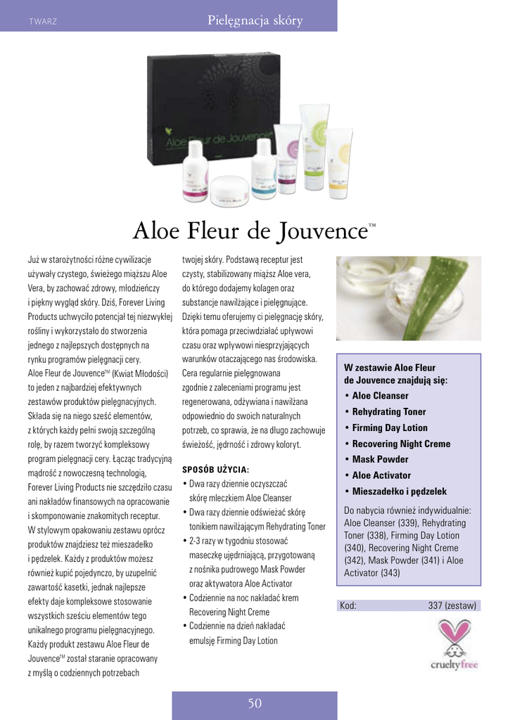 T WARZ Piel´gnacja skóry Aloe Fleur de Jouvence Ju˝ w staro˝ytnoÊci ró˝ne cywilizacje u˝ywały czystego, Êwie˝ego mià˝szu Aloe Vera, by zachowaç zdrowy, młodzieƒczy i pi´kny wyglàd skóry. DziÊ, Forever Living Products uchwyciło potencjał tej niezwykłej roÊliny i wykorzystało do stworzenia jednego z najlepszych dost´pnych na rynku programów piel´gnacji cery. Aloe Fleur de JouvenceTM (Kwiat MłodoÊci) to jeden z najbardziej efektywnych zestawów produktów piel´gnacyjnych. Składa si´ na niego szeÊç elementów, z których ka˝dy pełni swojà szczególnà rol´, by razem tworzyç kompleksowy program piel´gnacji cery. Łàczàc tradycyjnà màdroÊç z nowoczesnà technologià, Forever Living Products nie szcz´dziło czasu ani nakładów finansowych na opracowanie i skomponowanie znakomitych receptur. W stylowym opakowaniu zestawu oprócz produktów znajdziesz te˝ mieszadełko i p´dzelek. Ka˝dy z produktów mo˝esz równie˝ kupiç pojedynczo, by uzupełniç zawartoÊç kasetki, jednak najlepsze efekty daje kompleksowe stosowanie wszystkich szeÊciu elementów tego unikalnego programu piel´gnacyjnego. Ka˝dy produkt zestawu Aloe Fleur de JouvenceTM został staranie opracowany z myÊlà o codziennych potrzebach twojej skóry. Podstawà receptur jest czysty, stabilizowany mià˝sz Aloe vera, do którego dodajemy kolagen oraz substancje nawil˝ajàce i piel´gnujàce. Dzi´ki temu oferujemy ci piel´gnacj´ skóry, która pomaga przeciwdziałaç upływowi czasu oraz wpływowi niesprzyjajàcych warunków otaczajàcego nas Êrodowiska. Cera regularnie piel´gnowana zgodnie z zaleceniami programu jest regenerowana, od˝ywiana i nawil˝ana odpowiednio do swoich naturalnych potrzeb, co sprawia, ˝e na długo zachowuje Êwie˝oÊç, j´drnoÊç i zdrowy koloryt. SPOSÓB U˚YCIA: • Dwa razy dziennie oczyszczaç skór´ mleczkiem Aloe Cleanser • Dwa razy dziennie odÊwie˝aç skór´ tonikiem nawil˝ajàcym Rehydrating Toner • 2-3 razy w tygodniu stosowaç maseczk´ uj´drniajàcà, przygotowanà z noÊnika pudrowego Mask Powder oraz aktywatora Aloe Activator • Codziennie na noc nakładaç krem Recovering Night Creme • Codziennie na dzieƒ nakładaç emulsj´ Firming Day Lotion 50 TM W zestawie Aloe Fleur de Jouvence znajdujà si´: • Aloe Cleanser • Rehydrating Toner • Firming Day Lotion • Recovering Night Creme • Mask Powder • Aloe Activator • Mieszadełko i p´dzelek Do nabycia równie˝ indywidualnie: Aloe Cleanser (339), Rehydrating Toner (338), Firming Day Lotion (340), Recovering Night Creme (342), Mask Powder (341) i Aloe Activator (343) Kod: 337 (zestaw) Piel´gnacja skóry T WARZ Kompleksowa piel´gnacja cery z Aloe Fleur de Jouvence TM W zestawie Aloe Fleur de Jouvence znajdziesz wszystkie produkty potrzebne do kompleksowej piel´gnacji cery. M aseczka aloesowa Zalecane jest stosowanie maseczki aloesowej dwa – trzy razy w tygodniu dla wygładzenia, oczyszczenia i uj´drnienia skóry oraz dla przywrócenia jej młodzieƒczego wyglàdu. Aktywator aloesowy Aloe Activator znakomicie nawil˝a skór´ i doskonale współdziała z noÊnikiem pudrowym Mask Powder. Aloe Activator mo˝e byç tak˝e stosowany osobno, do skutecznego oczyszczania i odÊwie˝ania skóry. E T A P 1 : O cz y szczanie Mleczko Aloe Cleanser to pierwszy krok na drodze ku pi´knej, nieskazitelnej cerze. Stosuj je rano i wieczorem, nanoszàc opuszkami palców na twarz i szyj´. Nast´pnie usuƒ je zwil˝onym r´cznikiem lub chusteczkà. Wymieszaj jednà ły˝eczk´ Mask Powder z jednà ły˝eczkà Aloe Activator, tak by maseczka uzyskała konsystencj´ emulsji. P´dzelkiem nanieÊ równà warstw´ maseczki na twarz i szyj´ – zaczynajàc od nasady szyi ruchami ku górze. Połó˝ si´ lub oprzyj wygodnie, zrelaksuj i unikaj poruszania mi´Êniami twarzy przez około pół godziny. E T A P 2 : T onizacja Bezalkoholowy tonik nawil˝ajàcy Rehydrating Toner zawiera Aloe vera, kolagen i alantoin´, by delikatnie tonizowaç skór´. Tonikiem nasàczaj bawełniany wacik i tak nanoÊ go na skór´ codziennie rano i wieczorem, ruchami ku górze. E T A P 3 : N awil ˚ enie ( rano ) Przyłó˝ do twarzy zwil˝ony r´cznik, by zmi´kczyç maseczk´, a nast´pnie delikatnie usuƒ jej pozostałoÊci i przemyj twarz ciepłà wodà. Nast´pnie nałó˝ Rehydrating Toner i swój ulubiony krem nawil˝ajàcy Forever. Firming Day Lotion to nawil˝ajàca emulsja na dzieƒ, która pomaga skórze zachowaç zdrowy, młodzieƒczy wyglàd. Delikatnie wmasowuj jà w twarz i szyj´. Firming Day Lotion stanowi doskonałà baz´ pod makija˝ twoimi ulubionymi kosmetykami Sonya Colour Collection. E T A P 3 : N awil ˚ enie ( wieczór ) Recovering Night Creme nawil˝a i koi skór´, od˝ywiajàc jà podczas twojego snu. Po oczyszczeniu skóry wieczorem, obficie nałó˝ krem na twarz i szyj´. 51