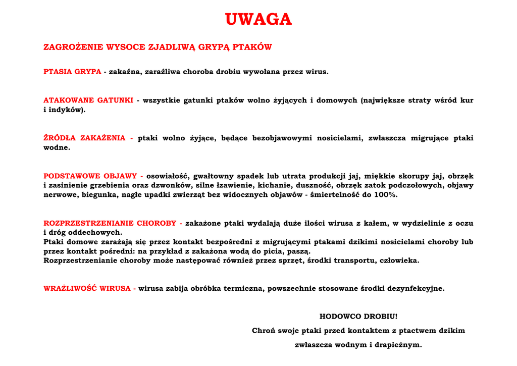 UWAGA ZAGROŻENIE WYSOCE ZJADLIWĄ GRYPĄ PTAKÓW PTASIA GRYPA - zakaźna, zaraźliwa choroba drobiu wywołana przez wirus. ATAKOWANE GATUNKI - wszystkie gatunki ptaków wolno żyjących i domowych (największe straty wśród kur i indyków). ŹRÓDŁA ZAKAŻENIA - ptaki wolno żyjące, będące bezobjawowymi nosicielami, zwłaszcza migrujące ptaki wodne. PODSTAWOWE OBJAWY - osowiałość, gwałtowny spadek lub utrata produkcji jaj, miękkie skorupy jaj, obrzęk i zasinienie grzebienia oraz dzwonków, silne łzawienie, kichanie, duszność, obrzęk zatok podczołowych, objawy nerwowe, biegunka, nagłe upadki zwierząt bez widocznych objawów - śmiertelność do 100%. ROZPRZESTRZENIANIE CHOROBY - zakażone ptaki wydalają duże ilości wirusa z kałem, w wydzielinie z oczu i dróg oddechowych. Ptaki domowe zarażają się przez kontakt bezpośredni z migrującymi ptakami dzikimi nosicielami choroby lub przez kontakt pośredni: na przykład z zakażona wodą do picia, paszą. Rozprzestrzenianie choroby może następować również przez sprzęt, środki transportu, człowieka. WRAŻLIWOŚĆ WIRUSA - wirusa zabija obróbka termiczna, powszechnie stosowane środki dezynfekcyjne. HODOWCO DROBIU! Chroń swoje ptaki przed kontaktem z ptactwem dzikim zwłaszcza wodnym i drapieżnym.