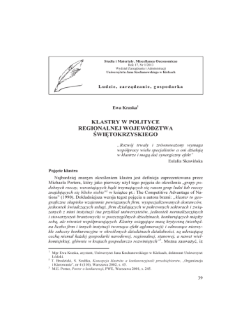 Studia i Materiały. Miscellanea Oeconomicae Rok 17, Nr 1/2013 Wydział Zarządzania i Administracji Uniwersytetu Jana Kochanowskiego w Kielcach Ludzie, zarządzanie, gospodarka Ewa Kraska1 KLASTRY W POLITYCE REGIONALNEJ WOJEWÓDZTWA ŚWIĘTOKRZYSKIEGO „Rozwój trwały i zrównoważony wymaga współpracy wielu specjalistów a oni działają w klastrze i mogą dać synergiczny efekt” Eulalia Skawińska Pojęcie klastra Najbardziej znanym określeniem klastra jest definicja zaprezentowana przez Michaela Portera, który jako pierwszy użył tego pojęcia do określenia „grupy podobnych rzeczy, wzrastających bądź trzymających się razem grup ludzi lub rzeczy znajdujących się blisko siebie”2 w książce pt.: The Competitive Advantage of Nations” (1990). Dokładniejsza wersja tegoż pojęcia u autora brzmi: „klaster to geograficzne skupisko wzajemnie powiązanych firm, wyspecjalizowanych dostawców, jednostek świadczących usługi, firm działających w pokrewnych sektorach i związanych z nimi instytucji (na przykład uniwersytetów, jednostek normalizacyjnych i stowarzyszeń branżowych) w poszczególnych dziedzinach, konkurujących między sobą, ale również współpracujących. Klastry osiągające masę krytyczną (niezbędna liczba firm i innych instytucji tworząca efekt aglomeracji) i odnoszące niezwykłe sukcesy konkurencyjne w określonych dziedzinach działalności, są uderzającą cechą niemal każdej gospodarki narodowej, regionalnej, stanowej, a nawet wielkomiejskiej, głównie w krajach gospodarczo rozwiniętych”3. Można zauważyć, iż 1 2 3 Mgr Ewa Kraska, asystent, Uniwersytet Jana Kochanowskiego w Kielcach, doktorant Uniwersytet Łódzki. T. Brodzicki, S. Szultka, Koncepcja klastrów a konkurencyjność przedsiębiorstw, „Organizacja i Kierowanie”, nr 4 (110), Warszawa 2002, s. 45. M.E. Porter, Porter o konkurencji, PWE, Warszawa 2001, s. 245. 39 koncepcja klastra u Portera kładzie nacisk na klastry jako ugrupowania płynne, tworzone w sposób nieformalny wokół danej technologii i lokalizacji, wykorzystujące jedynie lokalne powiązania strukturalne4. W Polsce koncepcja klastrów stanowi nowy sposób myślenia o kreowaniu konkurencyjności przedsiębiorstw, sprowadza się do stymulowania współpracy pomiędzy poszczególnymi podmiotami życia gospodarczego, przyśpieszenia procesów innowacyjnych i poprawy pozycji konkurencyjnej przedsiębiorstw funkcjonujących w klastrze5. Tabela 1. Przegląd definicji klastrów. Autor R. Rabelotti P. Swann, M. Prevezer S. Rosenfeld T. Padmore H. Gibson OECD 4 5 Definicja Geograficzne skupisko wyspecjalizowanych firm działających w pokrewnych sektorach, powiązanych siecią publicznych i prywatnych instytucji wspierających ich aktywność. Pomiędzy podmiotami gospodarczymi występują powiązania rynkowe i pozarynkowe wynikające z wymiany dóbr i informacji, zaś zachowania poszczególnych przedsiębiorstw determinowane są przez poczucie więzi i wspólnoty z innymi firmami z pokrewnych sektorów, działającymi w tej lokalizacji. Grupa przedsiębiorstw zlokalizowanych na wyodrębnionym obszarze. Geograficzne skupisko przedsiębiorstw działających w pokrewnych sektorach, funkcjonujących na lokalnym rynku pracy, powiązanych ze sobą, świadczących sobie komplementarne usługi i korzystających ze wspólnej infrastruktury oraz wyspecjalizowanych dostawców. Koncentracja firm, która działa dzięki interakcjom, czyli przez bezpośrednie konkurowanie, czyli kooperację, poprzez bycie dostawcą lub konsumentem w łańcuchu wartości. Klastry to ekonomiczne regiony, które mogą, ale nie muszą dostosowywać się do politycznych granic. Sieć produkcyjna powiązanych ze sobą firm połączonych w łańcuchu produkcyjnym wartości dodanej. Mogą one obejmować także strategiczne związki z instytucjami naukowymi, konsultantami i klientami. Źródło Is there an „Industrial District Model?” Footwear District in Italy and Mexico Compared, “World Development, Vol. 23, N. 1, 1995. A Comparision of the Dynamics of Industrial Clustering In Computing and Biotechnology, „Research Policy” 1996, No. 25. Bringing Business Clusters into the Mainstream of Economic Development, “European Planning Studies” 1997, vol. 5, No. 1. Modeling systems of innovation: II. A framework of industrial cluster analysis in regions “Research Policy” 1998, No. 26, s. 627. OECD, Boosting Innovation – the Cluster Approach, Paris 1999, s. 8. Z. Olesiński, Industrial Clusters in Poland. A Zone along the Wrosław-Katowice-Kraków Motorway [w:] The emergence and development of clusters In Poland, E. Bojar, Z. Olesiński (red.), Wyd. Difin, Warszawa 2007, s. 121. K. Przybylska, Polityka rozwoju klastrów, „Zeszyty Naukowe” nr 6, Wyd. Wyższej Szkoły Ekonomicznej, Bochnia 2007, s. 81. 40 Cd. tabeli 1. P. Cook Firmy bliskie przestrzennie, połączone wertykalnymi i horyzontalnymi zależnościami, związane z lokalną infrastrukturą wsparcia biznesu i dzielące wspólną wizję rozwoju gospodarczego. Współpracują i konkurują ze sobą na danym dziale rynku. L. Van den Berg, E. Braun, W. van Winden Klastry jako zlokalizowane sieci wyspecjalizowanych organizacji, w których procesy produkcji są ściśle połączone poprzez wymianę towarów, usług i / lub wiedzy. Organizacja Narodów Zjednoczonych ds. Rozwoju Przemysłowego UNIDO Regionalne i terytorialne koncentracje firm produkujących lub sprzedających podobne lub komplementarne produkty a przez to zmuszone do stawiania czoła wspólnym problemom. Taka koncentracja przedsiębiorstw może przyczynić się do powstawania wyspecjalizowanych dostawców maszyn, surowców lub rozwoju wyspecjalizowanych umiejętności i przyśpieszyć rozwój specjalistycznych usług. Wspólnota ludzi i firm zlokalizowanych blisko siebie na danym obszarze na którym współpracują ze sobą w sensie ekonomicznym w celu wytworzenia produktu lub usługi i dostarczenia ich na rynek. 