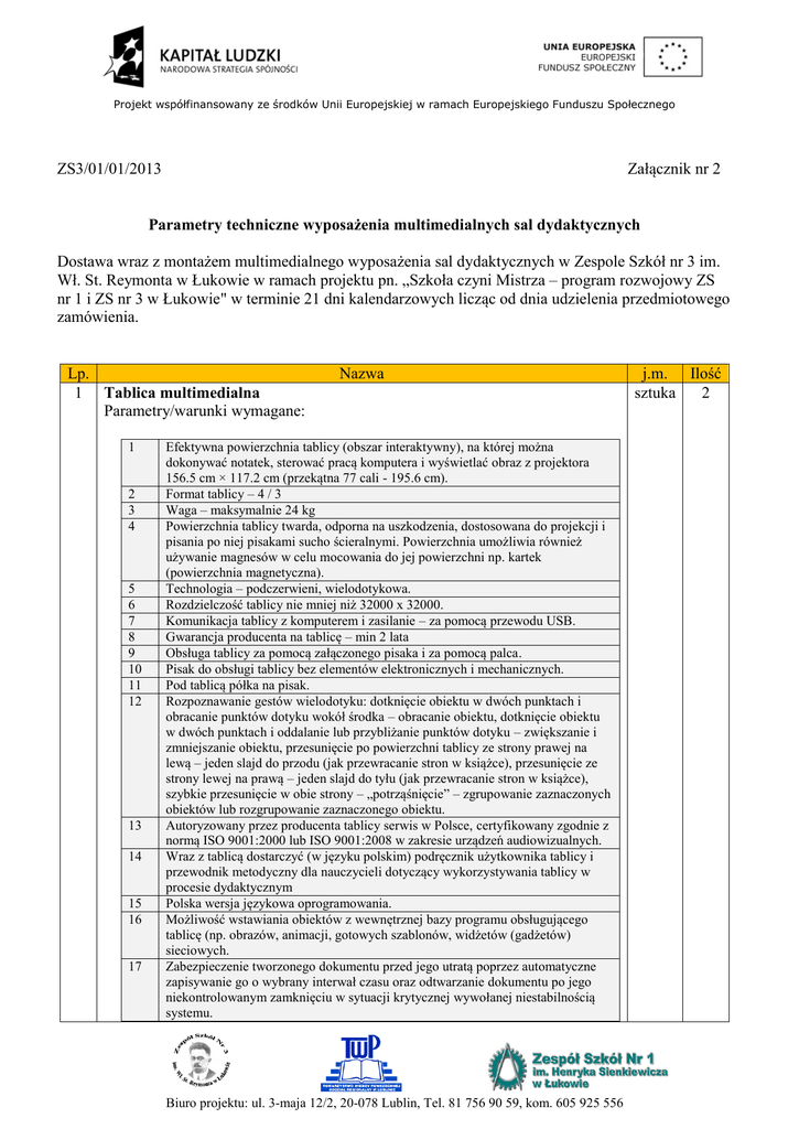 Projekt współfinansowany ze środków Unii Europejskiej w ramach Europejskiego Funduszu Społecznego Załącznik nr 2 ZS3/01/01/2013 Parametry techniczne wyposażenia multimedialnych sal dydaktycznych Dostawa wraz z montażem multimedialnego wyposażenia sal dydaktycznych w Zespole Szkół nr 3 im. Wł. St. Reymonta w Łukowie w ramach projektu pn. „Szkoła czyni Mistrza – program rozwojowy ZS nr 1 i ZS nr 3 w Łukowie" w terminie 21 dni kalendarzowych licząc od dnia udzielenia przedmiotowego zamówienia. Lp. 1 Tablica multimedialna Parametry/warunki wymagane: 1 2 3 4 5 6 7 8 9 10 11 12 13 14 15 16 17 Nazwa Efektywna powierzchnia tablicy (obszar interaktywny), na której można dokonywać notatek, sterować pracą komputera i wyświetlać obraz z projektora 156.5 cm × 117.2 cm (przekątna 77 cali - 195.6 cm). Format tablicy – 4 / 3 Waga – maksymalnie 24 kg Powierzchnia tablicy twarda, odporna na uszkodzenia, dostosowana do projekcji i pisania po niej pisakami sucho ścieralnymi. Powierzchnia umożliwia również używanie magnesów w celu mocowania do jej powierzchni np. kartek (powierzchnia magnetyczna). Technologia – podczerwieni, wielodotykowa. Rozdzielczość tablicy nie mniej niż 32000 x 32000. Komunikacja tablicy z komputerem i zasilanie – za pomocą przewodu USB. Gwarancja producenta na tablicę – min 2 lata Obsługa tablicy za pomocą załączonego pisaka i za pomocą palca. Pisak do obsługi tablicy bez elementów elektronicznych i mechanicznych. Pod tablicą półka na pisak. Rozpoznawanie gestów wielodotyku: dotknięcie obiektu w dwóch punktach i obracanie punktów dotyku wokół środka – obracanie obiektu, dotknięcie obiektu w dwóch punktach i oddalanie lub przybliżanie punktów dotyku – zwiększanie i zmniejszanie obiektu, przesunięcie po powierzchni tablicy ze strony prawej na lewą – jeden slajd do przodu (jak przewracanie stron w książce), przesunięcie ze strony lewej na prawą – jeden slajd do tyłu (jak przewracanie stron w książce), szybkie przesunięcie w obie strony – „potrząśnięcie” – zgrupowanie zaznaczonych obiektów lub rozgrupowanie zaznaczonego obiektu. Autoryzowany przez producenta tablicy serwis w Polsce, certyfikowany zgodnie z normą ISO 9001:2000 lub ISO 9001:2008 w zakresie urządzeń audiowizualnych. Wraz z tablicą dostarczyć (w języku polskim) podręcznik użytkownika tablicy i przewodnik metodyczny dla nauczycieli dotyczący wykorzystywania tablicy w procesie dydaktycznym Polska wersja językowa oprogramowania. Możliwość wstawiania obiektów z wewnętrznej bazy programu obsługującego tablicę (np. obrazów, animacji, gotowych szablonów, widżetów (gadżetów) sieciowych. Zabezpieczenie tworzonego dokumentu przed jego utratą poprzez automatyczne zapisywanie go o wybrany interwał czasu oraz odtwarzanie dokumentu po jego niekontrolowanym zamknięciu w sytuacji krytycznej wywołanej niestabilnością systemu. Biuro projektu: ul. 3-maja 12/2, 20-078 Lublin, Tel. 81 756 90 59, kom. 605 925 556 j.m. Ilość sztuka 2 Projekt współfinansowany ze środków Unii Europejskiej w ramach Europejskiego Funduszu Społecznego 18 19 20 21 22 23 24 25 26 27 28 29 30 31 32 33 34 35 Importowanie i eksportowanie materiałów powstałych na tablicy w czasie zajęć (notatek, obiektów) w formacie Whiteboard Common File Format (CFF). Dostępna na stronie producenta aplikacja pozwalająca na dostęp do plików stworzonych za pomocą oprogramowania producenta tablicy bez konieczności instalowania go na komputerze. Aplikacja musi umożliwiać przeglądanie plików, wykonywanie w nich przygotowanych ćwiczeń interaktywnych, pisanie za pomocą pisaków po slajdach, wprowadzanie tekstu i zapis do pliku wprowadzonych zmian. Narzędzie do rysowania wielokątów foremnych od trójkąta do co najmniej piętnastokąta. Funkcja usuwania jednocześnie wszystkich zapisków i rysunków wprowadzonych na stronę za pomocą pisaków. Funkcja resetowania strony pozwalająca na przywrócenie stanu pojedynczego slajdu do postaci bezpośrednio po otwarciu pliku z dysku. Funkcja ta pozwala szybko rozpocząć pracę od nowa. Dostęp bezpośrednio z poziomu programu do obsługi tablicy do bazy gotowych lekcji z w języku polskim, ilustracji, zdjęć, reprodukcji, animacji i widżetów (gadżetów) sieciowych itp. dostępnej przez sieć Internet. Baza musi zawierać co najmniej 200 lekcji z różnych przedmiotów i na różne poziomy edukacyjne. Automatyczna optymalizacja wielkości wstawianych plików graficznych, co umożliwia szybsze i łatwiejsze przekazywanie materiałów edukacyjnych przez sieć np. pocztą elektroniczną, na stronach WWW itp. Oprogramowanie umożliwia wyświetlanie stron w trybie pokazu (pełnoekranowym) ze zminimalizowanymi paskami narzędziowymi, podobnie jak w popularnych programach prezentacyjnych np. Microsoft PowerPoint. Możliwość wyświetlania dwóch slajdów (stron) jednocześnie np. w celu możliwości prezentacji treści zadania, danych, założeń i jego rozwiązania w przypadku gdy nie mieszczą się na jednej stronie. Wyszukiwarka wewnętrznej galerii oprogramowania do obsługi tablicy umożliwiająca szybkie i sprawne odnajdowanie interesujących materiałów poprzez słowa kluczowe. Użytkownik ma możliwość ustawienia, aby ślad atramentu piór stopniowo blakł, aż do całkowitego zniknięcia. Można regulować czas po jakim ślad atramentu zaczyna znikać. Pióro kaligraficzne – narzędzie automatycznie wygładza kreskę w czasie pisania lub rysowania w celu poprawienia czytelności zapisków lub rysunków. Pióro typu kredka świecowa- narzędzie pozwalające uzyskać rysunki lub notatki wykonane przy pomocy kredek świecowych. Pióro kreatywne – narzędzie umożliwiające pisanie i rysowane dowolnymi kształtami (np. gwiazdki, kwiatki itp.). Użytkownik może dostosować pióro kreatywne do swoich potrzeb poprzez wybranie dowolnego kształtu, który jest obiektem znajdującym się na s