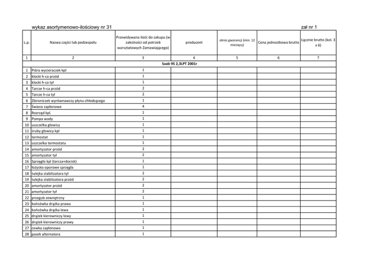 wykaz asortymenowo-ilościowy nr 31 zał nr 1 L.p. Nazwa części lub podzespołu Przewidywana ilość do zakupu (w zależności od potrzeb warsztatowych Zamawiającego) 1 2 3 1 Pióra wycieraczek kpl 1 2 klocki h-ca przód 1 3 klocki h-ca tył 1 4 Tarcze h-ca przód 2 5 Tarcze h-ca tył 2 6 Zbironiczek wyrównawczy płynu chłodzącego 1 7 Świece zapłonowe 4 8 Rozrząd kpl. 1 9 Pompa wody 1 10 uszczelka głowicy 1 11 śruby głowicy kpl 1 12 termostat 1 13 uszczelka termostatu 1 14 amortyzator przód 2 15 amortyzator tył 2 16 Sprzęgło kpl (tarcza+docisk) 1 17 łożysko oporowe sprzęgła 1 18 tulejka stabilizatora tył 2 19 tulejka stabilizatora przód 2 20 amortyzator przód 2 21 amortyzator tył 2 22 przegub zewnętrzny 1 23 końcówka drążka prawa 1 24 końcówka drążka lewa 1 25 drążek kierowniczy lewy 1 26 drążek kierowniczy prawy 1 27 cewka zapłonowa 1 28 pasek alternatora 1 producent 4 Saab 95 2,3LPT 2001r Łącznie brutto (kol. 3 okres gwarancji (min. 12 Cena jednostkowa brutto miesięcy) x 6) 5 6 7 29 tuleja wahacza tylna 1 30 tuleja wahacza przednia 1 31 łącznik drążka stabilizatora przód 2 32 tuleja drążka stabilizatora przód 2 33 tarcza koła (felga) 2 RAZEM: ……………………………………………………………………. pieczęć i podpis Wykoanwcy lub osoby upoważnionej