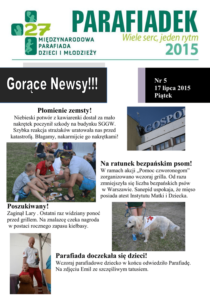 Nr 5 17 lipca 2015 Piątek Płomienie zemsty! Niebieski potwór z kawiarenki dostał za mało nakrętek poczynił szkody na budynku SGGW. Szybka reakcja strażaków uratowała nas przed katastrofą. Błagamy, nakarmijcie go nakrętkami! Na ratunek bezpańskim psom! W ramach akcji „Pomoc czworonogom” zorganizowano wczoraj grilla. Od razu zmniejszyła się liczba bezpańskich psów w Warszawie. Sanepid uspokaja, że mięso posiada atest Instytutu Matki i Dziecka. Poszukiwany! Zaginął Lary . Ostatni raz widziany ponoć przed grillem. Na znalazcę czeka nagroda w postaci rocznego zapasu kiełbasy. Parafiada doczekała się dzieci! Wczoraj parafiadowe dziecko w końcu odwiedziło Parafiadę. Na zdjęciu Emil ze szczęśliwym tatusiem. STREFA SŁOWA Ewangelia według św Mateusza (Mt 12, 1-8) Pewnego razu Jezus przechodził w szabat wśród zbóż. Uczniowie Jego, będąc głodni, zaczęli zrywać kłosy i jeść. Gdy to ujrzeli faryzeusze, rzekli Mu: "Oto Twoi uczniowie czynią to, czego nie wolno czynić w szabat". A On im odpowiedział: "Nie czytaliście, co uczynił Dawid, gdy był głodny, on i jego towarzysze? Jak wszedł do domu Bożego i jadł chleby pokładne, których nie wolno było jeść jemu ani jego towarzyszom, tylko samym kapłanom? Albo nie czytaliście w Prawie, że w dzień szabatu kapłani naruszają w świątyni spoczynek szabatu, a są bez winy? Oto powiadam wam: Tu jest coś większego niż świątynia. Gdybyście zrozumieli, co znaczy: «Chcę raczej miłosierdzia niż ofiary», nie potępialibyście niewinnych. Albowiem Syn Człowieczy jest Panem szabatu". Krótka refleksja… Gdy patrzę na dzisiejszą Ewangelię, przypominają mi się „Dzieje Duszy” Małej Tereski. Święta pisała tam, że ilekroć dostrzega niedociągnięcie lub zaniedbanie jakiejś siostry, walczy, by nie wydać osądu. Stara się spojrzeć na to pozytywnie. Może ta siostra zrobiła to, by się umartwić, albo miała inne zadania, które uniemożliwiły jej wykonanie akurat tej czynności. Może okazać się, że osoba – na którą spoglądam z gotowym osądem – dużo dalej zaszła na drodze świętości, niż ja sam. Ile razy to, co widzę, przedstawia się zupełnie inaczej, niż jest w rzeczywistości. Założę więc okulary Jezusa z dzisiejszej Ewangelii, okulary miłości. Nie będę spieszył się z osądem. W pierwszym rzędzie pomyślę, jak mogę ofiarować dziś miłość spotkanym ludziom, a nie jak ich osądzić, potępić… Bo skoro Bóg nikogo nie potępia, dlaczego ja mam być do tego uprawniony. Czy mogę odmawiać miłości innym, gdy sam Jezus podnosi mnie wzrokiem na piedestał. Najpierw miłość, by uczynić sytuację przejrzystą. Dopiero później ewentualne upomnienie. Hasło dnia: o. Józef Joniec SP – przebaczenie O. Józef Joniec (1959-2010) - polski duchowny katolicki, zakonnik pijarski, działacz pozarządowy. Inicjator i współzałożyciel (potem wieloletni prezes) Stowarzyszenia Parafiada im. św. Józefa Kalasancjusza. Promował dzięki niemu katolickie wychowanie dzieci i młodzieży. Oparł je na trzech filarach: sportu, sztuki i wiary. Był organizatorem wielu imprez i programów edukacyjnych m.in. "Międzynarodowych Parafiad Dzieci i Młodzieży", programu "Moja Mała Ojczyzna". Gdyby zapytano 100 różnych osób, które znały Ojca Józefa, jakimi cechami się odznaczał, wielu wymieniłoby cierpliwość, radość i życzliwość. Dlaczego więc mówimy o przebaczeniu? Ponieważ ci, którzy z nim pracowali, zwracali uwagę na to, że bardzo często można go było zobaczyć, jak rozwiązuje trudne sytuacje w duchu pojednania. Sam dawał przykład takiej postawy. Potrafił przebaczać ludziom i nie chować do nich urazy. Wiernie świadczył o miłości chrześcijańskiej. Czasami trudno jest nam wybaczyć. Chowamy w sobie negatywne emocje, często nie radząc sobie z nimi. A tak proste rozwiązanie jak przebaczenie, nie przychodzi nam do głowy. Z kolei, gdy znajdujemy się w odwrotnej sytuacji, potrzebujemy by nam wybaczono. Często ludzie nie są gotowi na udzielenie przebaczenia oraz na jego przyjęcie. Czy potrafisz wybaczać tym, którzy Cię skrzywdzili? Łatwo Ci to przychodzi? A jak czujesz się, kiedy nie otrzymujesz wybaczenia? Pora na piąte i ostatnie zadanie. Zastanów się nad swoimi relacjami z innymi. Z kim potrzebujesz pojednania? Zrób sobie listę 3 osób, z którymi czujesz, że twoje relacje muszą się zmienić. Wykonaj dziś konkretny gest pojednania z pierwszą osobą na liście. To może być drobnostka, chociażby próba porozmawiania. Marta Nawrocka Koszykówka dziewcząt (G) 1 2 3 Kraków Gimnazjum Unitas Tuchola Tuchola Parafia Koszykówka chłopców (G) 1 2 3 Koszykówka dziewcząt (L) 1 2 3 Zwoleń Mickuny Unitas Tuchola Koszykówka chłopców (L) 1 2 3 Skok w dal dziewcząt (P) 1 2 3 Agnieszka Bartkowiak – Wolsztyn Anna Vinnytska – Dolina Alexandra Dzwonkowski – Frankfurt Nikola Horowska – Wolsztyn Daria Tiszczenko – Grodno-Południowy Jowita Kowhan – Zawidów Emilija Juckiewicz – Mickuny Aleksandra Miły – Kosztowo Jennifer Dzwonkowski – Frankfurt Anna Vinnytska – Dolina Kamila Waliłko – Stalowa Wola Paola Casas Perez – Arroyo de la Miel STREFA WYNIKÓW Agnieszka Dybka – Stalowa Wola Daria Tiszczenko – Grodno-Południowy Nikola Horowska – Wolsztyn Bieg na 400 m dziewcząt (L) 1 2 Veranika Afonina – GrodnoWiszniewiec Natallia Dallidovich - Derewnaja 2 3 Bieg na 1000 m dziewcząt (G) 2 3 Olga Czeszczewik – GrodnoAugustówek Viktoriia Mazur – Kałusz Julia Gotowski – Mickuny 2 3 Magdalena Michalczyk – Jastrzębie Zdrój Diana Skorodynska – Dolina Beata Achramowicz – Mickuny Aleksy Rymarczuk – GrodnoPołudniowy Ernest Szostak – Mickuny Yuaheni Maulevich – GrodnoDziewiatówka Bieg na 1500 m chłopców (G) 1 Stanisław Lebioda – Stalowa Wola 2 3 Radosław Moskal – Stalowa Wola Marek Zwierżewicz – GrodnoAugustówek Bieg na 1000 m dziewcząt (L) 1 Jurek Garrid