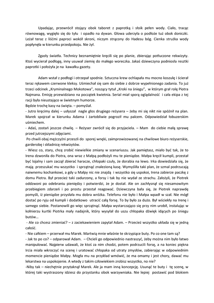 Upadając, przewrócił stojący obok taboret z paprotką i słoik pełen wody. Ciało, tracąc równowagę, wygięło się do tyłu i opadło na dywan. Głowa uderzyła o podłoże tuż obok doniczki. Leżał teraz z liśćmi paproci wokół skroni, niczym strącony do Hadesu bóg. Cienka strużka wody popłynęła w kierunku przedpokoju. Nie żył. Zgasły światła. Technicy beznamiętnie kręcili się po planie, zbierając potłuczone rekwizyty. Ktoś wycierał podłogę, inny usuwał ziemię do małego woreczka. Jakaś dziewczyna podniosła resztki paprotki i położyła je na kawałku gazety. Adam wstał z podłogi i otrzepał spodnie. Sztuczna krew ochlapała mu mocno koszulę i ścierał teraz rękawem czerwone kleksy. Uśmiechał się sam do siebie z dobrze wypełnionego zadania. To już trzeci odcinek „Kryminalnego Mokotowa”, noszący tytuł „Kroki na śniegu”, w którym grał rolę Piotra Najmana. Emisję przewidziano na początek kwietnia. Serial miał sporą oglądalność i cała ekipa z tej racji była nieustająco w świetnym humorze. Będzie trochę kasy na święta. – pomyślał. - Jutro kręcimy dalej – usłyszał nagle głos drugiego reżysera – żeby mi się nikt nie spóźnił na plan. Marek spojrzał w kierunku Adama i żartobliwie pogroził mu palcem. Odpowiedział łobuzerskim uśmiechem. - Adaś, zostań jeszcze chwilę. – Reżyser zwrócił się do przyjaciela. – Mam do ciebie małą sprawę przed jutrzejszymi zdjęciami. Po chwili obaj mężczyźni przeszli do sporej wnęki, zaimprowizowanej na chwilowe biuro reżyserskie, garderobę i składnicę rekwizytów. - Wiesz co, stary, chcę zrobić niewielkie zmiany w scenariuszu. Jak pamiętasz, miało być tak, że to Irena dzwoniła do Piotra, ona wraz z Małpą podłożyli mu te pieniądze. Małpa kręcił kumpli, przestał być lojalny i sam zaczął zbierać haracze, chłopaki czuły, że dorabia na lewo. Irka dowiedziała się, że mają przeszukać mu wszystko i sprzątnąć znalezioną kasę. Wymyśliła taki plan, że szmal podrzucają naiwnemu kochankowi, a gdy u Małpy nic nie znajdą i wszystko się uspokoi, Irena zabierze paczkę z domu Piotra. Był przecież taki zadurzony, a forsy i tak by nie wydał ze strachu. Założyli, że Piotrek oddzwoni po odebraniu pieniędzy i potwierdzi, że je dostał. Ale on zachłysnął się niesamowitym przebiegiem zdarzeń i po prostu przestał reagować. Dziewczyna bała się, że Piotrek naprawdę pomyśli, iż pieniądze przysłała mu dobra wróżka. Telefonu nie było i Małpa wpadł w szał. Nie mógł dostać po ryju od kumpli i dodatkowo utracić całą forsę. To by było za dużo. Był wściekły na Irenę i samego siebie. Postanowili go więc sprzątnąć. Małpa wystarczająco się przy nim urobił, instalując w kołnierzu kurtki Piotrka mały nadajnik, który wysyłał do uszu chłopaka dźwięk idących po śniegu butów… - Ale co chcesz zmieniać? – z zaciekawieniem zapytał Adam. – Przecież wszystko układa się w jedną całość. - Nie całkiem – przerwał mu Marek. Martwią mnie właśnie te skrzypiące buty. Po co one tam są? - Jak to po co? – odparował Adam. – Chcieli go odpowiednio nastraszyć, żeby można nim było łatwo manipulować. Najpierw udawali, że ktoś za nim chodzi, potem podrzucili forsę, a na koniec piękna Ircia miała wkroczyć na scenę i uratować chłopaka od utraty zmysłów, zabierając w odpowiednim momencie pieniądze Małpy. Mogła mu na przykład wmówić, że ma omamy i jest chory, dawać mu lekarstwa na uspokojenie. A wtedy z takim człowiekiem zrobisz wszystko, no nie? -Niby tak – niechętnie przytaknął Marek. Ale ja mam inną koncepcję. Usunąć te buty i tę scenę, w której taki wystraszony idziesz do przystanku obok warzywniaka. Nie lepiej postawić pod blokiem tego Franka Defrauda? Niby, że cię śledzi, przymuszony przez Małpę, któremu wisi od lat sporą sumkę. Przecież nie kręcimy Hitchcocka. - Wiesz co Marek, chyba nawet to dobrze wymyśliłeś – po chwili zastanowienia odpowiedział Adam. Janusz od dawna gra tylko same ogony, a tak to miałby chociaż jakąś rólkę w odcinku. To dobry chłopak, ma się żenić w tym roku. Rola Franka jest dla niego stworzona, też lubi pożyczyć i długo nie oddać, ale to dusza towarzystwa – Adam zaśmiał się ubawiony własnymi słowami a baryton Marka zawtórował mu z aprobatą. - Masz rację, Adaś, w końcu przyszła pani prezydent ponoć sama powiedziała do wyborców, że aktorzy dostaną więcej ról – odparł reżyser z całkowicie poważną miną. Adam spojrzał na przyjaciela i nagle razem gruchnęli histerycznym śmiechem, aż echo niosło po opustoszałym planie. Autor: Kika