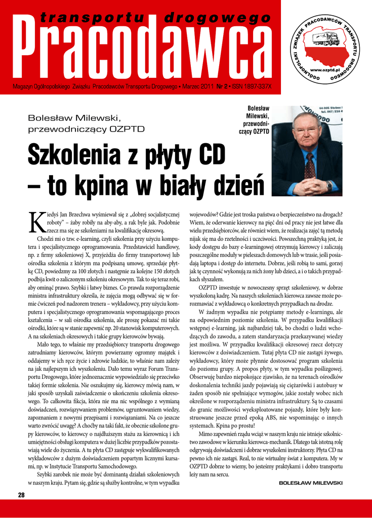 Pracodawca transportu drogowego Bolesław Milewski, przewodniczący OZPTD Bolesław Milewski, przewodniczący OZPTD Szkolenia z płyty CD – to kpina w biały dzień K iedyś Jan Brzechwa wyśmiewał się z „dobrej socjalistycznej roboty” – żaby robiły na aby-aby, a rak byle jak. Podobnie rzecz ma się ze szkoleniami na kwalifikację okresową. Chodzi mi o tzw. e-learning, czyli szkolenia przy użyciu komputera i specjalistycznego oprogramowania. Przedstawiciel handlowy, np. z firmy szkoleniowej X, przyjeżdża do firmy transportowej lub ośrodka szkolenia z którym ma podpisaną umowę, sprzedaje płytkę CD, powiedzmy za 100 złotych i następnie za kolejne 150 złotych podbija kwit o zaliczonym szkoleniu okresowym. Tak to się teraz robi, aby ominąć prawo. Szybki i łatwy biznes. Co prawda rozporządzenie ministra infrastruktury określa, że zajęcia mogą odbywać się w formie ćwiczeń pod nadzorem trenera – wykładowcy, przy użyciu komputera i specjalistycznego oprogramowania wspomagającego proces kształcenia – w sali ośrodka szkolenia, ale proszę pokazać mi takie ośrodki, które są w stanie zapewnić np. 20 stanowisk komputerowych. A na szkoleniach okresowych i takie grupy kierowców bywają. Mało tego, to właśnie my przedsiębiorcy transportu drogowego zatrudniamy kierowców, którym powierzamy ogromny majątek i oddajemy w ich ręce życie i zdrowie ludzkie, to właśnie nam zależy na jak najlepszym ich wyszkoleniu. Dało temu wyraz Forum Transportu Drogowego, które jednoznacznie wypowiedziało się przeciwko takiej formie szkolenia. Nie oszukujmy się, kierowcy mówią nam, w jaki sposób uzyskali zaświadczenie o ukończeniu szkolenia okresowego. To całkowita fikcja, która nie ma nic wspólnego z wymianą doświadczeń, rozwiązywaniem problemów, ugruntowaniem wiedzy, zapoznaniem z nowymi przepisami i rozwiązaniami. Na co jeszcze warto zwrócić uwagę? A choćby na taki fakt, że obecnie szkolone grupy kierowców, to kierowcy o najdłuższym stażu za kierownicą i ich umiejętności obsługi komputera w dużej liczbie przypadków pozostawiają wiele do życzenia. A tu płyta CD zastępuje wykwalifikowanych wykładowców z dużym doświadczeniem popartym licznymi kursami, np. w Instytucie Transportu Samochodowego. Szybki zarobek nie może być dominantą działań szkoleniowych w naszym kraju. Pytam się, gdzie są służby kontrolne, w tym wypadku 28 wojewodów? Gdzie jest troska państwa o bezpieczeństwo na drogach? Wiem, że oderwanie kierowcy na pięć dni od pracy nie jest łatwe dla wielu przedsiębiorców, ale również wiem, że realizacja zajęć tą metodą nijak się ma do rzetelności i uczciwości. Powszechną praktyką jest, że kody dostępu do bazy e-learningowej otrzymują kierowcy i zaliczają poszczególne moduły w pieleszach domowych lub w trasie, jeśli posiadają laptopa i dostęp do internetu. Dobrze, jeśli robią to sami, gorzej jak tę czynność wykonują za nich żony lub dzieci, a i o takich przypadkach słyszałem. OZPTD inwestuje w nowoczesny sprzęt szkoleniowy, w dobrze wyszkoloną kadrę. Na naszych szkoleniach kierowca zawsze może porozmawiać z wykładowcą o konkretnych przypadkach na drodze. W żadnym wypadku nie potępiamy metody e-learningu, ale na odpowiednim poziomie szkolenia. W przypadku kwalifikacji wstępnej e-learning, jak najbardziej tak, bo chodzi o ludzi wchodzących do zawodu, a zatem standaryzacja przekazywanej wiedzy jest możliwa. W przypadku kwalifikacji okresowej rzecz dotyczy kierowców z doświadczeniem. Tutaj płyta CD nie zastąpi żywego, wykładowcy, który może płynnie dostosować program szkolenia do poziomu grupy. A propos płyty, w tym wypadku poślizgowej. Obserwuję bardzo niepokojące zjawisko, że na terenach ośrodków doskonalenia techniki jazdy pojawiają się ciężarówki i autobusy w żaden sposób nie spełniające wymogów, jakie zostały wobec nich określone w rozporządzeniu ministra infrastruktury. Są to czasami do granic możliwości wyeksploatowane pojazdy, które były konstruowane jeszcze przed epoką ABS, nie wspominając o innych systemach. Kpina po prostu! Mimo zapewnień rządu wciąż w naszym kraju nie istnieje szkolnictwo zawodowe w kierunku kierowca-mechanik. Dlatego tak istotną rolę odgrywają doświadczeni i dobrze wyszkoleni instruktorzy. Płyta CD na pewno ich nie zastąpi. Real, to nie wirtualny świat z komputera. My w OZPTD dobrze to wiemy, bo jesteśmy praktykami i dobro transportu leży nam na sercu. Bolesław Milewski Firma „Bury” stawia na MAN 16 ciągników TGX 18x480 oraz najnowsza w Polsce stacja serwisowa Z Polski meble, do kraju owoce L ubelska firma „Bury” należy do krajowych potentatów w zakresie handlu owocami. Ten trudny w transporcie towar jest frachtowany poprzez własną flotę zestawów chłodniczych, która kilka tygodni temu poszerzyła się o 16 nowych MAN TGX 18x480. Firma „Bury” jest członkiem OZPTD. Nie jest to jednak koniec działań ze strony firmy „Bury” w zakresie transportu ciężarowego. Lubelskie przedsiębiorstwo uruchomiło najnowszy w Polsce serwis MAN. Certyfikacja to podstawa. Firma Bury jest znana z dbałości o jakość. Posiada System Zarządzania Bezpieczeństwa Żywności na zgodność z wymaganiami normy ISO 2200-2006 w zakresie „Magazynowania, Dystrybucji Owoców i Warzyw oraz Dojrzewania Bananów”. – Zgodnie z wymaganiami jakościowymi rynku stworzyliśmy sieć transportową specjalizującą się w transporcie ładunków chłodniczych, która ma na celu dostawę towaru od producenta do odbiorcy w jak najkrótszym czasie, tak by produkty spełniały kryteria najwyższej jakości – mówi Jacek Bury, właściciel firmy. – Stale dokładamy starań by nasza flota pojazdów spełniała najwyższe europejskie standardy – dodaje Jacek Bury. Flota rośnie. Do dotychczasowej floty pojazdów dołączyło właśnie 16 nowiutkich MAN z naczepami chłodniczymi. Ciągniki 4x2 1