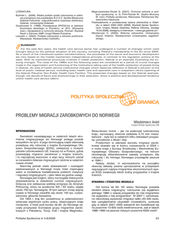 LITERATURA Buliński L. (2006), Realia polityki opieki zdrowotnej w sektorze prywatnym (na przykładzie N.Z.O.Z. Spółka Medyczna Gdańsk-Południe), niepublikowana rozprawa doktorska, Gdańsk: Uniwersytet Gdański. Grzybowski A. (1999), Prywatyzacja SPZOZ-ów w zakresie lecznictwa otwartego w Poznaniu, w: M.D. Głowacka (red.), Zarządzanie w ochronie zdrowia, Poznań: Wydział Nauk o Zdrowiu AMP, Urząd Miasta Poznania. Leowski J. (2004), Polityka zdrowotna a zdrowie publiczne, Warszawa: Wydawnictwo CeDeWu. ¯ Magnuszewska-Otulak G. (2007), Ochrona zdrowia w polityce społecznej, w: G. Firlit-Fesnak M., Szylko-Skoczny M. (red.) Polityka społeczna, Warszawa: Państwowe Wydawnictwo Naukowe. Przekształcenia w podstawowej opiece zdrowotnej w Gdańsku w latach 2000–2002 (2008), Wydział Spraw Społecznych Urzędu Miasta Gdańska, Referat Zdrowia, [dostęp 15.04.2008], dostępny w Internecie: <www.gis.gdansk.pl>. Włodarczyk C. (2003): Reformy zdrowotne. Uniwersalny kłopot, Kraków: Wydawnictwo Uniwersytetu Jagiellońskiego. SUMMARY For the past few years, the health care service sector has undergone a number of changes which were brought about by the political situation of the country, including Poland’s membership in the EU since 2004. As a result of the introduced system transformations, the processes of the social and economic development are now based on the market mechanism independence principle, in contrast to the regulation actions of the state. With its institutional structures involved in health protection, Gdańsk is an example illustrating the ensuing changes. The close of the 1990s and the following years are considered as a period of crucial changes made in the organization and functioning of the institutions taking care of the health protection of people living in Gdańsk. An area of health service institutional changes which deserves reflection is Gdańsk’s solution to the level of public medical service, including basic health care and specialist care in outpatient clinics (opening of the Gdańsk Południe Non-Public Health Care Facility). The presented changes based on the Gdańsk example, though not devoid of flaws and shortcomings in their execution, show a positive and developmental tendency within health care service reform. PROBLEMY MIGRACJI ZAROBKOWYCH DO NORWEGII Włodzimierz Anioł Instytut Polityki Społecznej UW WPROWADZENIE Swoistość narastającego w ostatnich latach strumienia imigracyjnego do Norwegii polega przede wszystkim na tym, iż jego dominującą część stanowią przepływy siły roboczej z krajów Europejskiego Obszaru Gospodarczego (EOG), zwłaszcza z nowych państw członkowskich UE. Inaczej niż w Polsce, gdzie przeważają migranci zarobkowi z krajów trzecich, i to najczęściej sezonowi, a więc tacy, których udział w norweskim bilansie migracyjnym istotnie w ostatnim czasie zmalał. Niemniej jednak wiele doświadczeń i rozwiązań zastosowanych w Norwegii może mieć inspirujący walor w kontekście kształtowania polskich instytucji i regulacji imigracyjnych, i jako takie są godne uwagi. Norwegia jest krajem, który ma bogate historyczne doświadczenia w dziedzinie ruchów migracyjnych. Dotyczą one zwłaszcza wielkiej emigracji do Ameryki Północnej, która na przełomie XIX i XX wieku objęła około 750 tys. Norwegów. W tym samym mniej więcej czasie w Norwegii osiedliło się około 150 tys. cudzoziemców, głównie Szwedów. Od 1954 r. kraj ten uczestniczy w ustanowionym wówczas wspólnym rynku pracy, obejmującym kraje nordyckie. Z kolei pod koniec lat 60. do Norwegii zaczęły przybywać liczniejsze grupy migrantów zarobkowych z Pakistanu, Turcji, Indii i krajów Maghrebu. Polityka Społeczna nr 5-6/2009 Stosunkowo liczne – jak na potencjał ludnościowy kraju, wynoszący obecnie zaledwie 4,74 mln mieszkańców – były też w ostatnich kilku dekadach przyjazdy uchodźców z Afryki i Azji. Przełomem w zakresie wzrostu imigracji zarobkowej okazało się w końcu rozszerzenie w 2004 r. o nowe kraje z Europy Środkowej i Wschodniej Europejskiego Obszaru Gospodarczego, na którym obowiązują zliberalizowane zasady przepływu siły roboczej i do którego Norwegia przystąpiła jeszcze w 1994 r. Należy dodać, iż wprowadzone na początku obecnej dekady pewne uproszczenia w przepisach regulujących napływ imigrantów ekonomicznych spoza EOG zwiększyły także liczbę przyjazdów z krajów trzecich. DYNAMIKA I STRUKTURA IMIGRACJI Od końca lat 60. XX wieku Norwegia posiada dodatni bilans migracyjny: rokrocznie (za wyjątkiem jednego 1989 r.) więcej przyjeżdża do niej imigrantów niż wyjeżdża z niej emigrantów1. W 2007 r. odnotowano rekordową wysokość imigracji netto (40 200 osób, bez uwzględnienia obywateli norweskich), podczas gdy w latach 2001–2005 wskaźnik ten kształtował się na poziomie 13 600 osób średniorocznie, zaś w latach 1986–1990 na jeszcze niższym poziomie 6300 osób2. 23 Mamy więc do czynienia ze sporą dynamiką zmian – Norwegia coraz szybciej i bardziej zdecydowanie przekształca się w kraj imigracyjny. W 2007 r. prawie 54 500 cudzoziemców (o 17 tys. więcej niż w roku poprzednim) zostało zarejestrowanych w Norwegii jako imigranci. O znacznym wzroście liczby przyjezdnych decydują ostatnio przede wszystkim przybysze z nowych krajów członkowskich Unii Europejskiej. Największa grupa imigrantów przybyła (w tymże 2007 r.) z Polski – 14 tys., prawie dwa razy więcej niż w roku poprzednim. Kolejnymi na liście krajów pochodzenia imigrantów były: Szwecja (4300), Niemcy (3600), Litwa (2350) i Somalia (1600). Warto dodać, iż w tym samym roku do kraju powróciło z zagranicy 8300 Norwegów. W ostatniej dekadzie liczba norweskich reemigrantów pozostawała stabilna, kształtując się na poziomie około 8–10 tys. w skali roku. W przypadku Polaków i Litwinów zwraca uwagę wysoki udział mężczyzn wśród imigrantów (odpowiednio 78% i 69%). Z kolei wśród przy