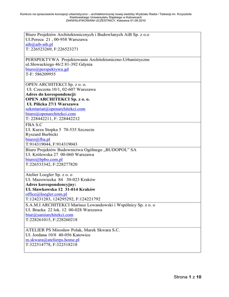 Konkurs na opracowanie koncepcji urbanistyczno – architektonicznej nowej siedziby Wydziału Radia i Telewizji im. Krzysztofa Kieślowskiego Uniwersytetu Śląskiego w Katowicach ZAKWALIFIKOWANI UCZESTNICY, Katowice 01.09.2010 Biuro Projektów Architektonicznych i Budowlanych AiB Sp. z o.o Ul.Pereca 21 , 00-958 Warszawa [email protected] T: 226523269, F:226523271 PERSPEKTYWA Projektowanie Architektoniczno-Urbanistyczne ul.Słowackiego 46/2 81-392 Gdynia [email protected] T-F: 586209955 OPEN ARCHITEKCI Sp. z o. o. Ul. Czeczota 10/1, 02-607 Warszawa Adres do korespondencji: OPEN ARCHITEKCI Sp. z o. o. Ul. Pilicka 27/1 Warszawa [email protected] [email protected] T: 228442211, F: 228442212 FBA S.C Ul. Kurza Stopka 5 70-535 Szczecin Ryszard Burbicki [email protected] T:914319044, F:914319043 Biuro Projektów Budownictwa Ogólnego „BUDOPOL” SA Ul. Królewska 27 00-060 Warszawa [email protected] T:226533342, F:228277820 Atelier Loegler Sp. z o. o Ul. Mazowiecka 84 30-023 Kraków Adres korespondencyjny: Ul. Sławkowska 12 31-014 Kraków [email protected] T:124231283, 124295292, F:124221792 S.A.M.I ARCHITEKCI Mariusz Lewandowski i Wspólnicy Sp. z o. o Ul. Bracka 22 lok. 12 00-028 Warszawa [email protected] T:228261015, F:228260218 ATELIER PS Mirosław Polak, Marek Skwara S.C. Ul. Jordana 10/8 40-056 Katowice [email protected] T:322514778, F:322518218 Strona 1 z 10 Konkurs na opracowanie koncepcji urbanistyczno – architektonicznej nowej siedziby Wydziału Radia i Telewizji im. Krzysztofa Kieślowskiego Uniwersytetu Śląskiego w Katowicach ZAKWALIFIKOWANI UCZESTNICY, Katowice 01.09.2010 Mado architekci s.c. Damian Poklewski-Koziełł, Marcin Marchewka Ul. Spokojna 22/7 30-054 Kraków [email protected] T:123598019, F:123598019 Autorska Pracownia Architektury’91 Arch. Wacław Stefański Ul. Józefitów 1/17 30-039 Kraków [email protected]ów.pl T-F: 126333818 Estudio Lamela S.L.P. Sp. partnerska oddział w Polsce Al. Szucha 8 00-582 Warszawa Carlos Lamela y de Vargas [email protected] T: 226261111, F: 226261110 VROA ARCHITEKCI S.C. ul. Nauczycielska 8/4 50-381 Wrocław [email protected] Studio Architektury Format Adam Gorczyca Ul. Poniatowskiego 55 41-807 Zabrze Adres korespondencyjny: Ul. Dymińska 6a/58, 01-519 Warszawa [email protected] T:222540260 ARCADA Sp. z o.o. Al. Niepodległości 39 61-714 Poznań [email protected] T:618520269, 618531364 F:618527201 Biuro Arcon sp. z o.o. i Biuro Projektów Architektonicznych Sp. z o. o. Pełnomocnik/Adres do korespondencji: Aleksander Skupin Biuro Projektów Architektonicznych Sp. z o. o. Ul. Noskowskiego 6 40-697 Katowice [email protected] T:322521623, 322526043 F:322521623 wew.106 Ludomir Książek, Piotr Knez Pełnomocnik/Adres do korespondencji: Piotr Knez Ul. Odrowąża 20/13 30-009 Kraków [email protected] T:608787203 Strona 2 z 10 Konkurs na opracowanie koncepcji urbanistyczno – architektonicznej nowej siedziby Wydziału Radia i Telewizji im. Krzysztofa Kieślowskiego Uniwersytetu Śląskiego w Katowicach ZAKWALIFIKOWANI UCZESTNICY, Katowice 01.09.2010 Gronner & Rączka Architekci Sp. jawna Pracownia Projektowa JKM Jacek Majewski Pełnomocnik/Adres do korespondencji: Marek Gronner Gronner & Rączka Architekci Sp. jawna Pl. Wojska Polskiego 9 43-300 Bielsko-Biała [email protected] T:338166122, F:338166182 Pracownia Projektowa ABP Studio Architekt Bartosz Prokop Os. Złotej Jesieni 6/99 31-826 Kraków [email protected] T: 601964567,123576775,123462770 F:123591924 INARKO Sp. z o. o. Ul. Lutycka 1/4 44-100 Gliwice [email protected] T-F: 322316632 Autorska Pracownia Architektury CAD Sp. z o. o. Ul. Zamieniecka 46 04-158 Warszawa [email protected] T:227401145, F:228798420 BULANDA MUCHA – ARCHITEKCI Sp. z o. o. Ul. Barcicka 14 01-839 Warszawa Adres do korespondencji: BULANDA MUCHA – ARCHITEKCI Sp. z o. o. Ul. Lipińska 4, 01-833 Warszawa [email protected] T:228690154, F:225610151 JEMS Architekci Sp. z o. o. Ul. Gagarina 28A 00-754 Warszawa [email protected] T:225592800, F:225592803-04 Lipski i Wujek Sp. z o. o. Prof.dr arch. Jakub Wujek Ul. Łąkowa 11 90-562 Łódź [email protected] T:426395267, F:426395270 Pracownia Architektoniczno-Urbanistyczna A3 Agnieszka Romanowska-Tarczyńska Ul. Bednarska 4/4 44-100 Gliwice [email protected] T-F:322304636 Strona 3 z 10 Konkurs na opracowanie koncepcji urbanistyczno – architektonicznej nowej siedziby Wydziału Radia i Telewizji im. Krzysztofa Kieślowskiego Uniwersytetu Śląskiego w Katowicach ZAKWALIFIKOWANI UCZESTNICY, Katowice 01.09.2010 IPG sp.z o.o. Ul. Królewska 5/8, 30-045 Kraków Pełnomocnik/Adres do korespondencji: Magdalena Celadyn Al. Krasińskiego 9/11 31-111 Kraków [email protected] nxD architekci Krzysztof Zalewski ul. Kościuszki 30/9 44-100 Gliwice [email protected] T-F:322302131 AiR Jurkowscy - Architekci sp.z o.o. Ul. Cybulskiego 8 40-705 Katowice Adres do korespondencji: AiR Jurkowscy – Architekci sp.z o.o. Ul.Szafirowa 7/17, 40-759 Katowice [email protected] T-F: 322063971 NOW Biuro Architektoniczne Sp. z o. o. Ul. Sienkiewicza 75/77 90-057 Łódź [email protected] T:426377090, 426377027 F:426399696 Piotr Płaskowicki & Partnerzy Architekci Ul. Dynasy 8/6A 00-354 Warszawa Adres do korespondencji: Piotr Płaskowicki & Partnerzy Architekci Ul. Wąchocka 1i, 03-934 Warszawa [email protected] T-F: 227888845 E&L Architects Sp. z o. o. Ul. Szyszkowa 34 02-285 Warszawa [email protected] [email protected] T: 225758110, F:225758111 agn Niederberghaus & Partners GmbH Piotr Kuczia Groner Allee 100 D 49479 Ibbenburen Niemcy Pełnomocnik: Axel Schwinde [email protected] T:0049 54515901241, F: 0049 54515901240 Strona 4 z 10 Konkurs na opracowanie koncepcji urbanistyczno – architektonicznej nowej siedziby Wydziału Radia i Telewizji im. Krzysztofa Kieślowskiego Uniwersytetu Śląskiego w Katowicach ZAKWALIFIKOWANI UCZESTNICY, Katowice 01.09.2010 Inżynierowie i Doradcy Sp. z o. o. Ul. Walerego Sławka 3a 30-633 Kraków [email protected] T: 126469705, F:126469701 eM4 Pracownia 