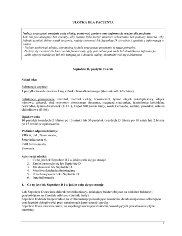 ULOTKA DLA PACJENTA Należy przeczytać uważnie całą ulotkę, ponieważ zawiera ona informacje ważne dla pacjenta. Lek ten jest dostępny bez recepty, aby można było leczyć niektóre schorzenia bez pomocy lekarza. Aby jednak uzyskać dobry wynik leczenia, należy stosować lek Septolete D ostrożnie i zgodnie z informacją w ulotce. - Należy zachować ulotkę, aby można ją było przeczytać ponownie w razie potrzeby. -Należy się zwrócić do lekarza lub farmaceuty, gdy potrzebna jest rada lub dodatkowa informacja. - Jeśli objawy nasilą się lub nie ustąpią po 3 dniach, należy skontaktować się z lekarzem. Septolete D, pastylki twarde Skład leku Substancje czynne: 1 pastylka twarda zawiera 1 mg chlorku benzalkoniowego (Benzalkonii chloridum). Substancje pomocnicze: maltitol, maltitol ciekły, lewomentol, tymol, olejek eukaliptusowy, olejek miętowy, glicerol, olej rycynowy pierwszego tłoczenia, magnezu stearynian, krzemionka koloidalna bezwodna, tytanu dwutlenek (E 171), Capol 600 (wosk biały, wosk Carnauba, szelak), powidon, żółcień chinolinowa (E104) Opakowania 10 pastylek twardych (1 blister po 10 sztuk) lub 30 pastylek twardych (3 blistry po 10 sztuk lub 2 blistry po 15 sztuk) w opakowaniu. Podmiot odpowiedzialny: KRKA, d.d., Novo mesto, Šmarješka cesta 6, 8501 Novo mesto, Słowenia Spis treści ulotki: 1. Co to jest lek Septolete D i w jakim celu się go stosuje 2. Zanim zastosuje się lek Septolete D 3. Jak stosować lek Septolete D 4. Możliwe działania niepożądane 5. Przechowywanie leku Septolete D 6. Inne informacje 1. Co to jest lek Septolete D i w jakim celu się go stosuje Lek Septolete D zawiera chlorek benzalkoniowy, działający bakteriobójczo na niektóre bakterie i grzybobójczo na Candida albicans (bielnik biały). Septolete D działa bezpośrednio na drobnoustroje powodujące zakażenia, działa miejscowo odkażająco oraz łagodzi dolegliwości przy zakażeniach jamy ustnej i gardła. Septolete D nie zawiera cukru, co zapobiega rozwojowi bakterii powodujących powstawanie płytki nazębnej. 1 Wskazania do stosowania: Pomocniczo w objawach stanów zapalnych spowodowanych zakażeniami bakteryjnymi jamy ustnej i gardła: ból gardła chrypka nieświeży oddech zapalenie dziąseł 2. Zanim zastosuje się lek Septolete D Nie należy stosować leku Septolete D: w przypadku nadwrażliwości na chlorek benzalkoniowy lub którąkolwiek substancję pomocniczą. Nie zaleca się stosowania leku Septolete D u dzieci do 4 lat. Zachować szczególną ostrożność stosując lek Septolete D w przypadku: - cięższych zakażeń, z wysoką gorączką, bólami głowy i wymiotami; jeśli objawy nasilą się lub nie ustąpią po 3 dniach należy zasięgnąć porady lekarskiej; - cukrzycy - pacjent powinien wziąć pod uwagę, że każda pastylka zawiera około 0,8 g maltitolu; z powodu powolnej hydrolizy i powolnego wchłaniania z przewodu pokarmowego maltitol wpływa na stężenie glukozy we krwi w niewielkim stopniu. Nie należy przyjmować pastylek jednocześnie z mlekiem, ponieważ zmniejsza ono skuteczność działania przeciwdrobnoustrojowego chlorku benzalkoniowego. Nie należy stosować większych dawek niż zalecane. Stosowanie leku z jedzeniem i piciem Leku Septolete D nie należy zażywać bezpośrednio przed posiłkiem lub w czasie posiłku. Nie należy przyjmować pastylek jednocześnie z mlekiem. Stosowanie leku Septolete D u dzieci Nie zaleca się stosowania leku Septolete D pastylki u dzieci w wieku do 4 lat. Ciąża Przed zastosowaniem leku należy zasięgnąć porady u lekarza lub farmaceuty. Brak wystarczających danych dotyczących bezpieczeństwa stosowania leku podczas ciąży, dlatego nie zaleca się stosowania leku podczas ciąży. Karmienie piersią Przed zastosowaniem leku należy zasięgnąć porady u lekarza lub farmaceuty. Brak wystarczających danych dotyczących bezpieczeństwa stosowania leku podczas ciąży, dlatego nie zaleca się stosowania leku podczas karmienia piersią. Prowadzenie pojazdów i obsługa maszyn Lek Septolete D nie wpływa na zdolność prowadzenia pojazdów i obsługę urządzeń mechanicznych w ruchu. Ważne informacje o niektórych składnikach leku Septolete D Glicerol może w dużych dawkach powodować bóle głowy i zaburzenia żołądkowo-jelitowe. Pastylki zawierają alkohole wielowodorotlenowe (maltitol, mannitol), które mogą w dużych dawkach, zwłaszcza u dzieci powodować biegunkę. 2 Stosowanie innych leków Należy poinformować lekarza oraz o wszystkich przyjmowanych ostatnio lekach, nawet tych, które wydawane są bez recepty. W przypadku stosowania innych leków należy poradzić się lekarza lub farmaceuty. 3. Jak stosować lek Septolete D Dawkowanie i sposób podawania Lek Septolete D należy przyjmować zgodnie z zaleceniami znajdującymi się w tej ulotce. W przypadku wątpliwości należy ponownie skontaktować się z lekarzem. Należy ssać 1 pastylkę do rozpuszczenia w jamie ustnej co 2 do 3 godziny. Dzieciom powyżej 4 lat zaleca się do 4 pastylki na dobę, a dzieciom powyżej 10 lat do 6 pastylek na dobę. Dorosłym i dzieciom powyżej 12 lat zaleca się 6 do 8 pastylek na dobę. Pastylek nie zaleca się stosować u dzieci młodszych niż 4 lata Pastylek nie należy rozgryzać ani połykać. Pastylek nie powinno się stosować bezpośrednio przed posiłkiem lub w czasie posiłku. W przypadku wrażenia, że działanie leku Septolete D jest za mocne lub za słabe, należy zwrócić się do lekarza. W przypadku zażycia większej dawki leku Septolete D niż zalecana: W przypadku zażycia większej dawki leku niż zalecana, należy skontaktować się z lekarzem lub farmaceutą. Ze względu na ilości substancji czynnych w jednej pastylce, możliwość przedawkowania leku jest bardzo mała. Zażycie większej ilości pastylek może doprowadzić do zaburzeń żołądkowo-jelitowych, takich jak nudności, wymioty, biegunka. W takim przypadku należy zaprzestać przyjmowania leku, wypi
