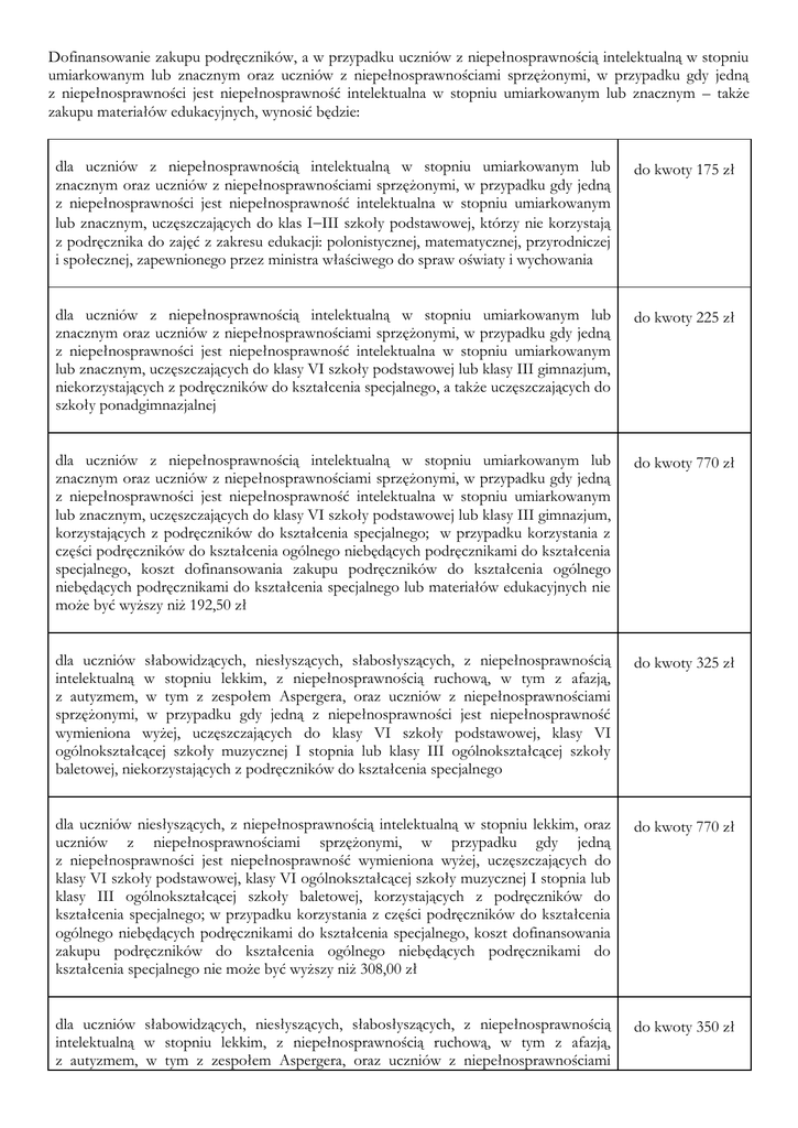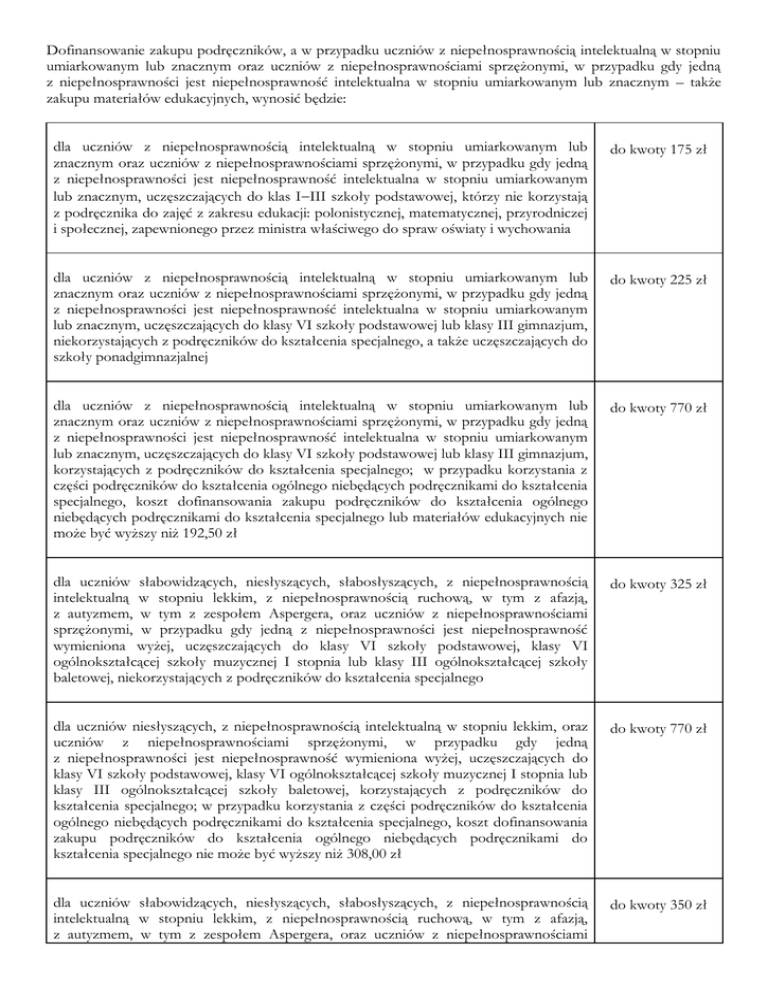 Dofinansowanie zakupu podręczników, a w przypadku uczniów z niepełnosprawnością intelektualną w stopniu umiarkowanym lub znacznym oraz uczniów z niepełnosprawnościami sprzężonymi, w przypadku gdy jedną z niepełnosprawności jest niepełnosprawność intelektualna w stopniu umiarkowanym lub znacznym – także zakupu materiałów edukacyjnych, wynosić będzie: dla uczniów z niepełnosprawnością intelektualną w stopniu umiarkowanym lub znacznym oraz uczniów z niepełnosprawnościami sprzężonymi, w przypadku gdy jedną z niepełnosprawności jest niepełnosprawność intelektualna w stopniu umiarkowanym lub znacznym, uczęszczających do klas IIII szkoły podstawowej, którzy nie korzystają z podręcznika do zajęć z zakresu edukacji: polonistycznej, matematycznej, przyrodniczej i społecznej, zapewnionego przez ministra właściwego do spraw oświaty i wychowania do kwoty 175 zł dla uczniów z niepełnosprawnością intelektualną w stopniu umiarkowanym lub znacznym oraz uczniów z niepełnosprawnościami sprzężonymi, w przypadku gdy jedną z niepełnosprawności jest niepełnosprawność intelektualna w stopniu umiarkowanym lub znacznym, uczęszczających do klasy VI szkoły podstawowej lub klasy III gimnazjum, niekorzystających z podręczników do kształcenia specjalnego, a także uczęszczających do szkoły ponadgimnazjalnej do kwoty 225 zł dla uczniów z niepełnosprawnością intelektualną w stopniu umiarkowanym lub znacznym oraz uczniów z niepełnosprawnościami sprzężonymi, w przypadku gdy jedną z niepełnosprawności jest niepełnosprawność intelektualna w stopniu umiarkowanym lub znacznym, uczęszczających do klasy VI szkoły podstawowej lub klasy III gimnazjum, korzystających z podręczników do kształcenia specjalnego; w przypadku korzystania z części podręczników do kształcenia ogólnego niebędących podręcznikami do kształcenia specjalnego, koszt dofinansowania zakupu podręczników do kształcenia ogólnego niebędących podręcznikami do kształcenia specjalnego lub materiałów edukacyjnych nie może być wyższy niż 192,50 zł do kwoty 770 zł dla uczniów słabowidzących, niesłyszących, słabosłyszących, z niepełnosprawnością intelektualną w stopniu lekkim, z niepełnosprawnością ruchową, w tym z afazją, z autyzmem, w tym z zespołem Aspergera, oraz uczniów z niepełnosprawnościami sprzężonymi, w przypadku gdy jedną z niepełnosprawności jest niepełnosprawność wymieniona wyżej, uczęszczających do klasy VI szkoły podstawowej, klasy VI ogólnokształcącej szkoły muzycznej I stopnia lub klasy III ogólnokształcącej szkoły baletowej, niekorzystających z podręczników do kształcenia specjalnego do kwoty 325 zł dla uczniów niesłyszących, z niepełnosprawnością intelektualną w stopniu lekkim, oraz uczniów z niepełnosprawnościami sprzężonymi, w przypadku gdy jedną z niepełnosprawności jest niepełnosprawność wymieniona wyżej, uczęszczających do klasy VI szkoły podstawowej, klasy VI ogólnokształcącej szkoły muzycznej I stopnia lub klasy III ogólnokształcącej szkoły baletowej, korzystających z podręczników do kształcenia specjalnego; w przypadku korzystania z części podręczników do kształcenia ogólnego niebędących podręcznikami do kształcenia specjalnego, koszt dofinansowania zakupu podręczników do kształcenia ogólnego niebędących podręcznikami do kształcenia specjalnego nie może być wyższy niż 308,00 zł do kwoty 770 zł dla uczniów słabowidzących, niesłyszących, słabosłyszących, z niepełnosprawnością intelektualną w stopniu lekkim, z niepełnosprawnością ruchową, w tym z afazją, z autyzmem, w tym z zespołem Aspergera, oraz uczniów z niepełnosprawnościami do kwoty 350 zł sprzężonymi, w przypadku gdy jedną z niepełnosprawności jest niepełnosprawność wymieniona wyżej, uczęszczających do klasy III gimnazjum, klasy III ogólnokształcącej szkoły muzycznej II stopnia, klasy III ogólnokształcącej szkoły sztuk pięknych lub klasy VI ogólnokształcącej szkoły baletowej, niekorzystających z podręczników do kształcenia specjalnego dla uczniów niesłyszących, z niepełnosprawnością intelektualną w stopniu lekkim, oraz uczniów z niepełnosprawnościami sprzężonymi, w przypadku gdy jedną z niepełnosprawności jest niepełnosprawność wymieniona wyżej, uczęszczających do klasy III gimnazjum, klasy III ogólnokształcącej szkoły muzycznej II stopnia, klasy III ogólnokształcącej szkoły sztuk pięknych lub klasy VI ogólnokształcącej szkoły baletowej, korzystających z podręczników do kształcenia specjalnego; w przypadku korzystania z części podręczników do kształcenia ogólnego niebędących podręcznikami do kształcenia specjalnego, koszt dofinansowania zakupu podręczników do kształcenia ogólnego niebędących podręcznikami do kształcenia specjalnego nie może być wyższy niż 303,50 zł do kwoty 607 zł dla uczniów słabowidzących, niesłyszących, słabosłyszących, z niepełnosprawnością intelektualną w stopniu lekkim, z niepełnosprawnością ruchową, w tym z afazją, z autyzmem, w tym z zespołem Aspergera, oraz uczniów z niepełnosprawnościami sprzężonymi, w przypadku gdy jedną z niepełnosprawności jest niepełnosprawność wymieniona wyżej, uczęszczających do zasadniczej szkoły zawodowej do kwoty 390 zł dla uczniów słabowidzących, niesłyszących, słabosłyszących, z niepełnosprawnością intelektualną w stopniu lekkim, z niepełnosprawnością ruchową, w tym z afazją, z autyzmem, w tym z zespołem Aspergera, oraz uczniów z niepełnosprawnościami sprzężonymi, w przypadku gdy jedną z niepełnosprawności jest niepełnosprawność wymieniona wyżej, uczęszczających do liceum ogólnokształcącego, technikum, klas IV– VI ogólnokształcącej szkoły muzycznej II stopnia, klas IV–VI ogólnokształcącej szkoły sztuk pięknych, klas VI