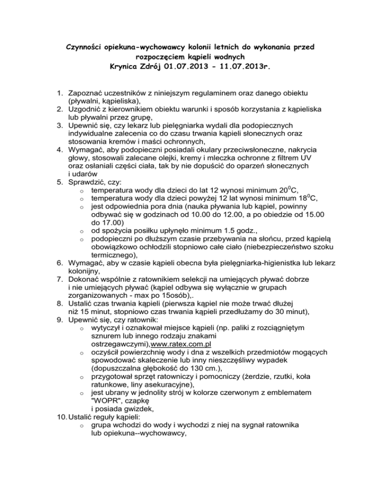 Czynności opiekuna-wychowawcy kolonii letnich do wykonania przed rozpoczęciem kąpieli wodnych Krynica Zdrój 01.07.2013 - 11.07.2013r. 1. Zapoznać uczestników z niniejszym regulaminem oraz danego obiektu (pływalni, kąpieliska), 2. Uzgodnić z kierownikiem obiektu warunki i sposób korzystania z kąpieliska lub pływalni przez grupę, 3. Upewnić się, czy lekarz lub pielęgniarka wydali dla podopiecznych indywidualne zalecenia co do czasu trwania kąpieli słonecznych oraz stosowania kremów i maści ochronnych, 4. Wymagać, aby podopieczni posiadali okulary przeciwsłoneczne, nakrycia głowy, stosowali zalecane olejki, kremy i mleczka ochronne z filtrem UV oraz osłaniali części ciała, tak by nie dopuścić do oparzeń słonecznych i udarów 5. Sprawdzić, czy: 0 o temperatura wody dla dzieci do lat 12 wynosi minimum 20 C, 0 o temperatura wody dla dzieci powyżej 12 lat wynosi minimum 18 C, o jest odpowiednia pora dnia (nauka pływania lub kąpiel, powinny odbywać się w godzinach od 10.00 do 12.00, a po obiedzie od 15.00 do 17.00) o od spożycia posiłku upłynęło minimum 1.5 godz., o podopieczni po dłuższym czasie przebywania na słońcu, przed kąpielą obowiązkowo ochłodzili stopniowo całe ciało (niebezpieczeństwo szoku termicznego), 6. Wymagać, aby w czasie kąpieli obecna była pielęgniarka-higienistka lub lekarz kolonijny, 7. Dokonać wspólnie z ratownikiem selekcji na umiejących pływać dobrze i nie umiejących pływać (kąpiel odbywa się wyłącznie w grupach zorganizowanych - max po 15osób),. 8. Ustalić czas trwania kąpieli (pierwsza kąpiel nie może trwać dłużej niż 15 minut, stopniowo czas trwania kąpieli przedłużamy do 30 minut), 9. Upewnić się, czy ratownik: o wytyczył i oznakował miejsce kąpieli (np. paliki z rozciągniętym sznurem lub innego rodzaju znakami ostrzegawczymi),www.ratex.com.pl o oczyścił powierzchnię wody i dna z wszelkich przedmiotów mogących spowodować skaleczenie lub inny nieszczęśliwy wypadek (dopuszczalna głębokość do 130 cm.), o przygotował sprzęt ratowniczy i pomocniczy (żerdzie, rzutki, koła ratunkowe, liny asekuracyjne), o jest ubrany w jednolity strój w kolorze czerwonym z emblematem "WOPR", czapkę i posiada gwizdek, 10. Ustalić reguły kąpieli: o grupa wchodzi do wody i wychodzi z niej na sygnał ratownika lub opiekuna--wychowawcy, nie wolno wchodzić do wody bez wiedzy i zgody ratownika i opiekunawychowawcy, w czasie kąpieli nie wolno, bezmyślnie potrącać się, popychać, wrzucać i wciągać do wody, udawać topienie się i symulować inne zagrożenia mogące powodować nieprzewidziane, skutki, o dolegliwości zdrowotne (zawroty i bóle głowy lub inne dolegliwości) zgłaszać natychmiast do opiekuna--wychowawcy, pielęgniarki lub lekarza, o w przypadku zauważenia oznak topienia się kolegów lub koleżanek lub innej sytuacji zagrożenia życia, natychmiast alarmować ratownika, opiekuna- wychowawcę lub najbliższe osoby dorosłe, które są zobowiązane poprowadzić akcję ratowniczą lub zapobiegawczą, o nie wolno wchodzić do wody wbrew zakazowi ratownika lub w czasie, w którym wywieszona jest czerwona flaga, o nie wolno przekraczać wyznaczonej strefy kąpieliska. 11. Ustalić sygnały (na gwizdek): o wejście do wody, o wyjście z wody, o koniec kąpieli o alarm-zagrożenie, o Czynności opiekuna-wychowawcy kolonii letnich do wykonania w czasie kąpieli nad wodą i plażowania 12. Przeprowadzić z dziećmi odpowiednie ćwiczenia, by dokładnie zaznajomiły się z sygnalizacją i wdrożyły do sprawnego wykonywania poleceń, 13. Czuwać nad przestrzeganiem niniejszego regulaminu i regulaminu danego obiektu przez grupę, 14. Przed wejściem do wody i po wyjściu z niej dokładnie policzyć podopiecznych, 15. Wymagać, aby ratownik przeprowadził z grupą kąpiących się odpowiednie ćwiczenia posługiwania się sprzętem ratowniczym, np. holowanie kolejno każdego dziecka w stronę brzegu, przy pomocy koła ratunkowego, zamocowanego na lince, 16. Uważnie obserwować dzieci, powierzchnię wody, niezwłocznie reagować na każdy sygnał wzywania pomocy, ani na chwilę nie zostawiać ich bez opieki, 17. Nie pozwalać wchodzić do wody, gdy dzieci są zgrzane lub zmęczone, 18. Utrzymywać w grupie bezwzględną dyscyplinę. Szczególnie ostro reagować za urządzanie fałszywych alarmów, 19. Czuwać, aby żadne dziecko nie przekroczyło oznaczonego miejsca kąpieli, 20. Nie dopuszczać do sytuacji aby na wyznaczonym kąpielisku przebywały osoby postronne, 21.Uczestników naruszających przepisy niniejszego regulaminu relegować z terenu kąpieliska i stosować przewidziane regulaminem kolonii sankcje wychowawcze, Czynności do wykonania po zakończeniu kąpieli nad wodą i plażowania 21. Dokładnie policzyć wszystkich podopiecznych, 22. Dopilnować, aby uczestnicy kąpieli: o osuszyli skórę ręcznikiem kąpielowym i zmienili mokre stroje kąpielowe na suche, o wrażliwi na słońce zostali posmarowani zalecanym preparatem ochronnym (minimum 8 dla cery jasnej), posiadającym odpowiedni atest, o założyli słomkowe kapelusze, czapeczki z daszkiem, okulary przeciwsłoneczne, 23. Zakończyć kąpiele słoneczne co najmniej pół godziny przed obiadem (maksymalnie do godz. 12,00 w południe) 25. Uporządkować miejsce plażowania, zabezpieczyć sprzęt ratowniczy i pomocniczy przed osobami postronnymi. Zasady postępowania w sytuacjach stwarzających zagrożenia dla życia i zdrowia uczestników kąpieli nad wodą i plażowania 24. W przypadku udaru słonecznego doprowadzić jak najszybciej do obniżenia temperatury ciała (przenieść w cień, położyć zimny okład na głowę), wezwać lekarza. 25. W przypadku poparzenia słonecznego smarować skórę pianką "panthenol", robić okłady serwatką, zsiadłym mlekiem, jogurtem. Zabieg powtarzać wielokrotnie, dopóki stan skóry się nie poprawi. 26. W przypadku utonięcia - na sygnał "alarm" wszyscy, poza zespołem r