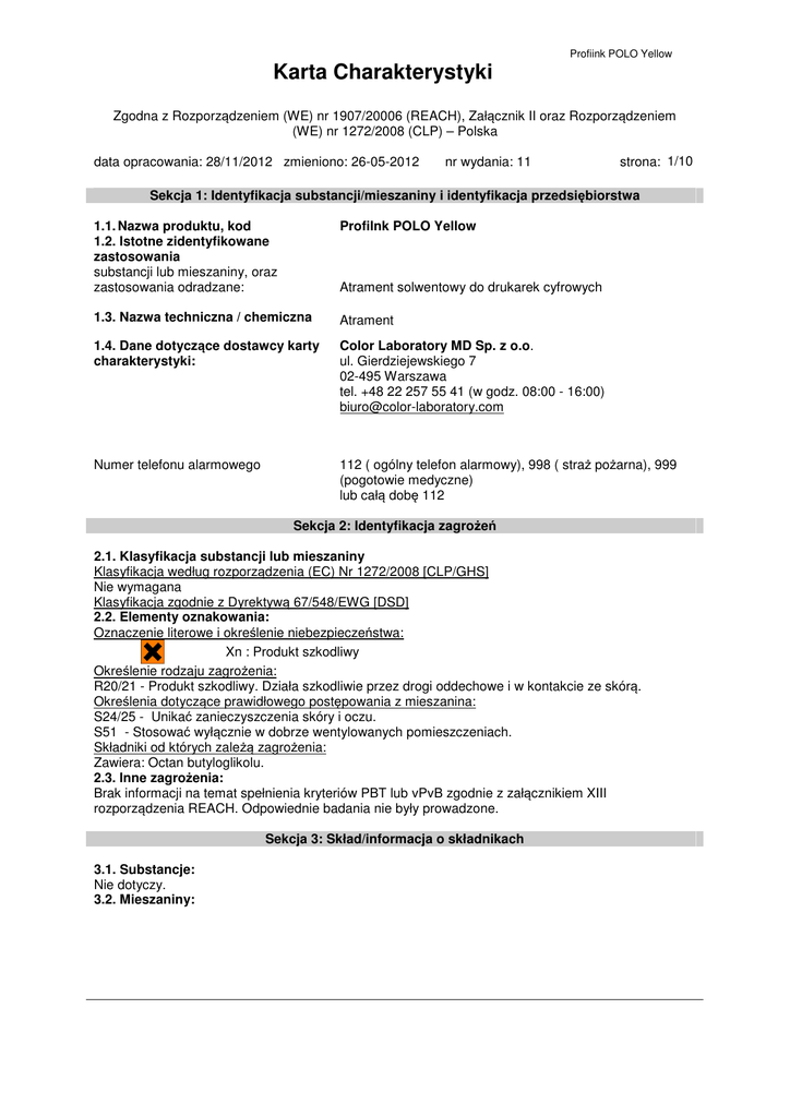 Profiink POLO Yellow Karta Charakterystyki Zgodna z Rozporządzeniem (WE) nr 1907/20006 (REACH), Załącznik II oraz Rozporządzeniem (WE) nr 1272/2008 (CLP) – Polska data opracowania: 28/11/2012 zmieniono: 26-05-2012 nr wydania: 11 strona: 1/10 Sekcja 1: Identyfikacja substancji/mieszaniny i identyfikacja przedsiębiorstwa 1.1. Nazwa produktu, kod 1.2. Istotne zidentyfikowane zastosowania substancji lub mieszaniny, oraz zastosowania odradzane: ProfiInk POLO Yellow Atrament solwentowy do drukarek cyfrowych 1.3. Nazwa techniczna / chemiczna Atrament 1.4. Dane dotyczące dostawcy karty charakterystyki: Color Laboratory MD Sp. z o.o. ul. Gierdziejewskiego 7 02-495 Warszawa tel. +48 22 257 55 41 (w godz. 08:00 - 16:00) [email protected] Numer telefonu alarmowego 112 ( ogólny telefon alarmowy), 998 ( straż pożarna), 999 (pogotowie medyczne) lub całą dobę 112 Sekcja 2: Identyfikacja zagrożeń 2.1. Klasyfikacja substancji lub mieszaniny Klasyfikacja według rozporządzenia (EC) Nr 1272/2008 [CLP/GHS] Nie wymagana Klasyfikacja zgodnie z Dyrektywą 67/548/EWG [DSD] 2.2. Elementy oznakowania: Oznaczenie literowe i określenie niebezpieczeństwa: Xn : Produkt szkodliwy Określenie rodzaju zagrożenia: R20/21 - Produkt szkodliwy. Działa szkodliwie przez drogi oddechowe i w kontakcie ze skórą. Określenia dotyczące prawidłowego postępowania z mieszanina: S24/25 - Unikać zanieczyszczenia skóry i oczu. S51 - Stosować wyłącznie w dobrze wentylowanych pomieszczeniach. Składniki od których zależą zagrożenia: Zawiera: Octan butyloglikolu. 2.3. Inne zagrożenia: Brak informacji na temat spełnienia kryteriów PBT lub vPvB zgodnie z załącznikiem XIII rozporządzenia REACH. Odpowiednie badania nie były prowadzone. Sekcja 3: Skład/informacja o składnikach 3.1. Substancje: Nie dotyczy. 3.2. Mieszaniny: Profiink POLO Yellow Karta Charakterystyki Zgodna z Rozporządzeniem (WE) nr 1907/20006 (REACH), Załącznik II oraz Rozporządzeniem (WE) nr 1272/2008 (CLP) – Polska data opracowania: 28/11/2012 zmieniono: 26-05-2012 strona: 2/10 nr wydania: 11 Rozporządzenie (WE) Nr 1272/2008 Dyrektywa Rady 67/548/EWG Substancja Octan butyloglikolu Octan-2-metoksy-1metyloetylu Numer CAS 1207-2 10865-6 Numer WE 201159-0 203603-9 Numer indeksowy 607-03800-2 607-19500-7 Stężenie % wag. 50-100 Znak ostregawczy Symbol Xn 10-25 Zwroty R 10894-1 203631-1 606-01000-7 R10 2,5-10 Xn Kody rodz. zarożenia Acute Tox. (skin) 4 H312 Acute Tox. (oral) 4 H302 Flam. Liq. 3 H226 R20/21 R10 Cykloheksanon Klasy zagrożenia i kody kategorii R20 Flam. Liq. 3 | Acute Tox. (inh.) 4 Acute Tox. (skin) 4 Acute Tox. (oral) Skin Irrit. 2 Eye Dam. 1 H226 H332 H312 H302 H315 H318 Opis zwrotów R i H znajduje się w punkcie 16 Karty Sekcja 4: Środki pierwszej pomocy 4.1. Opis środków pierwszej pomocy: 4.2. Najważniejsze ostre i opóźnione objawy oraz skutki narażenia: W przypadku inhalacji-wdychania: Wdychanie oparów może powodować ból i zawroty głowy, znużenie, osłabienie mięśni, senność a w wyjątkowych przypadkach utratę przytomności. Poszkodowanego usunąć (wyprowadzić/wynieść) z miejsca narażenia na świeże powietrze; zapewnić spokój i ciepło, rozluźnić uciskające części ubrania. Nieprzytomnego ułożyć w pozycji bocznej ustalonej; kontrolować i utrzymywać drożność dróg oddechowych. W przypadku zaburzeń w oddychaniu podawać tlen, w przypadku braku oddechu stosować sztuczne oddychanie. W przypadku utraty przytomności, zaburzeń oddychania lub utrzymującego się złego samopoczucia natychmiast zapewnić pomoc lekarską. W przypadku kontaktu ze skórą: Dłuższe narażenie może powodować suchość skóry. Natychmiast zdjąć zanieczyszczoną/nasiąkniętą odzież i buty. Zanieczyszczoną skórę umyć dokładnie wodą z mydłem lub łagodnym detergentem, a następnie spłukać dużą ilością wody. Nie używać rozpuszczalników. W przypadku wystąpienia i utrzymywania się objawów podrażnienia skonsultować się z lekarzem. W przypadku skażenia oczu: Kontakt z oczami powoduje zaczerwienienie i ból. Zanieczyszczone oczy natychmiast płukać ciągłym strumieniem wody, usunąć szkła kontaktowe (jeśli są) i kontynuować płukanie przez ok. 15 minut. Podczas płukania trzymać powieki szeroko rozwarte i poruszać gałką oczną. W przypadku wystąpienia i utrzymywania się objawów podrażnienia skonsultować się z lekarzem. UWAGA: Nie stosować zbyt silnego strumienia wody, aby nie uszkodzić rogówki. W przypadku połknięcia: Połknięcie może powodować podrażnienie gardła, ból brzucha, senność, nudności, wymioty i Profiink POLO Yellow Karta Charakterystyki Zgodna z Rozporządzeniem (WE) nr 1907/20006 (REACH), Załącznik II oraz Rozporządzeniem (WE) nr 1272/2008 (CLP) – Polska data opracowania: 28/11/2012 zmieniono: 26-05-2012 nr wydania: 11 strona: 3/10 biegunkę. Natychmiast zapewnić pomoc medyczną. NIE prowokować wymiotów – niebezpieczeństwo aspiracji do płuc. Ułożyć pacjenta w komfortowej pozycji. 4.3. Wskazania dotyczące wszelkiej natychmiastowej pomocy lekarskiej i szczególnego postępowania z poszkodowanym: Pokazać kartę charakterystyki lub etykietę/opakowanie personelowi medycznemu udzielającemu pomocy. Osoby udzielające pomocy w obszarze o nieznanym stężeniu par powinny być wyposażone w aparaty oddechowe z niezależnym dopływem powietrza. Wskazówki dla lekarza: leczenie objawowe i wspomagające. Sekcja 5: Postępowanie w przypadku pożaru 5.1. Środki Gaśnicze Odpowiednie środki gaśnicze: Dwutlenek węgla, proszek gaśniczy, piana odporna na alkohol, rozproszone prądy wody lub mgła wodna Niewłaściwe środki gaśnicze: Zwarte prądy wody. UWAGA: woda może być nieskuteczna - produkt jest częściowo rozpuszczalny w wodzie i lżejszy od wody. Rozproszone prądy wody mogą być stosowane do chłodzenia pojemników, rozcieńczania wycieków do niepalnych mieszanin, rozpraszania par. 5.2. Szczególne zagrożenia zwią