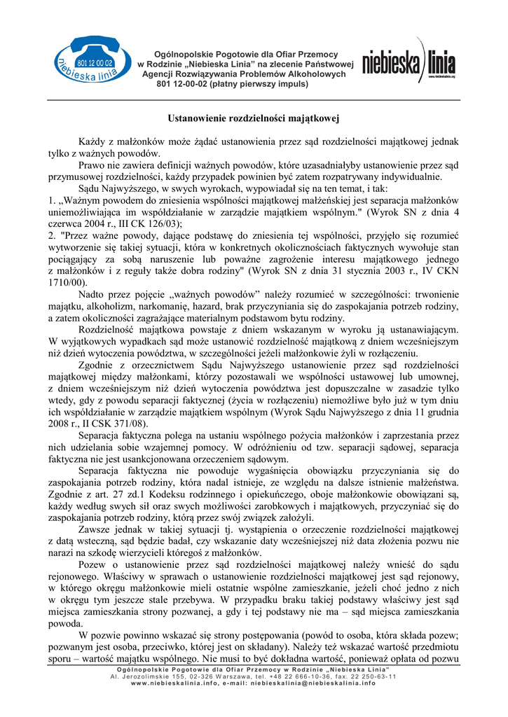 Ogólnopolskie Pogotowie dla Ofiar Przemocy w Rodzinie „Niebieska Linia” na zlecenie Państwowej Agencji Rozwiązywania Problemów Alkoholowych 801 12-00-02 (płatny pierwszy impuls) Ustanowienie rozdzielności majątkowej Każdy z małżonków może żądać ustanowienia przez sąd rozdzielności majątkowej jednak tylko z ważnych powodów. Prawo nie zawiera definicji ważnych powodów, które uzasadniałyby ustanowienie przez sąd przymusowej rozdzielności, każdy przypadek powinien być zatem rozpatrywany indywidualnie. Sądu Najwyższego, w swych wyrokach, wypowiadał się na ten temat, i tak: 1. „Ważnym powodem do zniesienia wspólności majątkowej małżeńskiej jest separacja małżonków uniemożliwiająca im współdziałanie w zarządzie majątkiem wspólnym." (Wyrok SN z dnia 4 czerwca 2004 r., III CK 126/03); 2. "Przez ważne powody, dające podstawę do zniesienia tej wspólności, przyjęło się rozumieć wytworzenie się takiej sytuacji, która w konkretnych okolicznościach faktycznych wywołuje stan pociągający za sobą naruszenie lub poważne zagrożenie interesu majątkowego jednego z małżonków i z reguły także dobra rodziny" (Wyrok SN z dnia 31 stycznia 2003 r., IV CKN 1710/00). Nadto przez pojęcie „ważnych powodów” należy rozumieć w szczególności: trwonienie majątku, alkoholizm, narkomanię, hazard, brak przyczyniania się do zaspokajania potrzeb rodziny, a zatem okoliczności zagrażające materialnym podstawom bytu rodziny. Rozdzielność majątkowa powstaje z dniem wskazanym w wyroku ją ustanawiającym. W wyjątkowych wypadkach sąd może ustanowić rozdzielność majątkową z dniem wcześniejszym niż dzień wytoczenia powództwa, w szczególności jeżeli małżonkowie żyli w rozłączeniu. Zgodnie z orzecznictwem Sądu Najwyższego ustanowienie przez sąd rozdzielności majątkowej między małżonkami, którzy pozostawali we wspólności ustawowej lub umownej, z dniem wcześniejszym niż dzień wytoczenia powództwa jest dopuszczalne w zasadzie tylko wtedy, gdy z powodu separacji faktycznej (życia w rozłączeniu) niemożliwe było już w tym dniu ich współdziałanie w zarządzie majątkiem wspólnym (Wyrok Sądu Najwyższego z dnia 11 grudnia 2008 r., II CSK 371/08). Separacja faktyczna polega na ustaniu wspólnego pożycia małżonków i zaprzestania przez nich udzielania sobie wzajemnej pomocy. W odróżnieniu od tzw. separacji sądowej, separacja faktyczna nie jest usankcjonowana orzeczeniem sądowym. Separacja faktyczna nie powoduje wygaśnięcia obowiązku przyczyniania się do zaspokajania potrzeb rodziny, która nadal istnieje, ze względu na dalsze istnienie małżeństwa. Zgodnie z art. 27 zd.1 Kodeksu rodzinnego i opiekuńczego, oboje małżonkowie obowiązani są, każdy według swych sił oraz swych możliwości zarobkowych i majątkowych, przyczyniać się do zaspokajania potrzeb rodziny, którą przez swój związek założyli. Zawsze jednak w takiej sytuacji tj. wystąpienia o orzeczenie rozdzielności majątkowej z datą wsteczną, sąd będzie badał, czy wskazanie daty wcześniejszej niż data złożenia pozwu nie narazi na szkodę wierzycieli któregoś z małżonków. Pozew o ustanowienie przez sąd rozdzielności majątkowej należy wnieść do sądu rejonowego. Właściwy w sprawach o ustanowienie rozdzielności majątkowej jest sąd rejonowy, w którego okręgu małżonkowie mieli ostatnie wspólne zamieszkanie, jeżeli choć jedno z nich w okręgu tym jeszcze stale przebywa. W przypadku braku takiej podstawy właściwy jest sąd miejsca zamieszkania strony pozwanej, a gdy i tej podstawy nie ma – sąd miejsca zamieszkania powoda. W pozwie powinno wskazać się strony postępowania (powód to osoba, która składa pozew; pozwanym jest osoba, przeciwko, której jest on składany). Należy też wskazać wartość przedmiotu sporu – wartość majątku wspólnego. Nie musi to być dokładna wartość, ponieważ opłata od pozwu O gó l no po ls k ie P ogot ow ie d la Of i ar Pr z em ocy w R odz i ni e „ N ie bi es ka L i ni a” A l . J er oz o l i m s k i e 1 5 5 , 0 2 - 3 2 6 W ar s z a w a, t e l . + 4 8 2 2 6 6 6 - 1 0 - 3 6 , f a x. 2 2 2 5 0 - 6 3 - 1 1 w w w . nieb i esk a li ni a. i nf o, e - m a il : nie bi es ka l i nia @ ni eb ie sk al i ni a. i nf o Ogólnopolskie Pogotowie dla Ofiar Przemocy w Rodzinie „Niebieska Linia” na zlecenie Państwowej Agencji Rozwiązywania Problemów Alkoholowych 801 12-00-02 (płatny pierwszy impuls) nie jest obliczana od wartości przedmiotu sporu, lecz jest opłatą stałą. Opłata od pozwu wynosi 200 złotych [stosownie do art. 27 pkt 6 ustawy z dnia 28 lipca 2005 r. o kosztach sądowych w sprawach cywilnych (Dz. U. z 2005 r. Nr 167, poz. 1398)]. W pozwie należy wskazać ważne powody, na których podstawie żąda się ustanowienia rozdzielności majątkowej np. pozostawanie w faktycznej separacji, która uniemożliwia zgodne działanie w zarządzie majątkiem wspólnym; że mimo pozostawania w ustroju wspólności majątkowej małżeńskiej faktycznie każde z małżonków zarządza tą częścią majątku wspólnego, która stanowi dochód każdego z małżonków; że np. małżonek może zaciągać bez wiedzy i zgody żony zobowiązania, za które może ona ponosić odpowiedzialność. Do pozwu należy dołączyć odpis aktu małżeństwa w oryginale. Powinno zgłosić się środki dowodowe na okoliczność twierdzeń zawartych w pozwie. Takimi środkami dowodowymi mogą być oprócz zeznań powoda także zeznania innych osób, choćby członków rodziny. Pozew może wnieść każdy z małżonków. Powództwo na rzecz jednego z małżonków może wytoczyć również prokurator. Co do zasady udziały małżonków w majątku wspólnym są równe. Z ważnych powodów można żądać, ażeby ustalenie udziałów w majątku wspólnym nastąpiło z uwzględnieniem stopnia, w którym każdy z nich przyczynił się do powstania tego majątku. W takim przyp