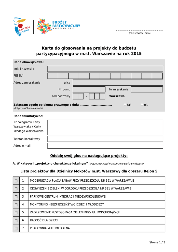 ..................................................................... (miejscowość, data) Karta do głosowania na projekty do budżetu partycypacyjnego w m.st. Warszawie na rok 2015 Dane obowiązkowe: Imię i nazwisko PESEL1) Adres zamieszkania ulica Nr domu Kod pocztowy Nr mieszkania - Warszawa Załączam zgodę opiekuna prawnego z dnia ……………………………… tak nie (dotyczy osób małoletnich) Dane fakultatywne: Nr hologramu Karty Warszawiaka / Karty Młodego Warszawiaka Telefon kontaktowy Adres e-mail Oddaję swój głos na następujące projekty: A. W kategorii „projekty o charakterze lokalnym” (proszę zaznaczyć maksymalnie pięć z poniższych) Lista projektów dla Dzielnicy Mokotów m.st. Warszawy dla obszaru Rejon 5 □ 1. MODERNIZACJA PLACU ZABAW PRZY PRZEDSZKOLU NR 391 W WARSZAWAIE □ 2. ODŚWIEŻENIE ZIELENI W OGRÓDKU PRZEDSZKOLA NR 391 W WARSZAWIE □ 3. PARKOWE CENTRUM INTEGRACJI MIĘDZYPOKOLENIOWEJ □ 4. MONITORING - BEZPIECZEŃŚTWO DZIECI I MŁODZIEŻY □ 5. ZADRZEWIENIE PUSTEGO PASA ZIELENI PRZY UL. PODCHORĄŻYCH □ 6. RADOŚĆ DLA DZIECI □ 7. PRACOWNIA MULTIMEDIALNA Strona 1 / 3 □ 8. KOMPUTERY Z OPROGRAMOWANIEM □ 9. ŁAWKA PLENEROWA ZE STANISŁAWEM GRZESIUKIEM □ 10 . WYMIANA NAWIERZCHNI CHODNIKA UL. HOŁÓWKI 3 □ 11 . PASTORAŁY NA KAMERALNEJ I PRZEDWOJENNEJ UL. HOŁÓWKI 3 W WARSZAWIE (DOM BACZYŃSKIEGO) □ 12 . NOWOCZESNA PRACOWNIA KOMPUTEROWA □ 13 . SIŁOWNIA □ 14 . SIELECKI INFORMATOR KULTURALNY - TABLICE INFORMACYJNE □ 15 . ORGANIZACJA "KLUBU SENIORA" PRZY GÓRSKIEJ 12 □ 16 . ZAKUP SPRZĘTU DO INTEGRACJI SENSORYCZNEJ ORAZ WYPOSAŻENIE SALI DOŚWIADCZEŃ ŚWIATA □ 17 . REWITALIZACJA OTOCZENIA W "KOLONII GROTTGERA" PRZY BUDYNKU POGODNA 4 □ 18 . OTWARTY PLAC ZABAW NA SIELCACH □ 19 . FASCYNUJĄCY ŚWIAT NAUKI Z KOMPUTEREM □ 20 . CZERSKA I OKOLICE - PRZYJAZNE DLA PIESZYCH □ 21 . "OD MALUSZKA DO STARUSZKA NA SIELCACH" ZAGOSPODAROWANIE TERENU DO POTRZEB SPĘDZANIA WOLNEGO CZASU □ 22 . CZERSKA DLA ROWERÓW ! □ 23 . REMONT PUNKTU ZAGOSPODAROWANIA CZASU WOLNEGO DZIECI I MŁODZIEŻY ORAZ PUNKTU INFORMACYJNO - KONSULTACYJNEGO □ 24 . DOMKI DLA SKRZYDLATYCH PASIASTYCH PRZYJACIÓŁ □ 25 . ANALIZA SPOŁECZNA SIELC I CZERNIAKOWA □ 26 . INFRASTRUKTURA I ŚRODOWISKO - REWITALIZACJA SIELC □ 27 . BEZPIECZNE ŚCIEŻKI PRZEDSZKOLAKA Z CZERNIAKOWA □ 28 . CENTRUM TENISA STOŁOWEGO - CZERNIAKÓW, SIELCE □ 29 . WIELOPRZEDMIOTOWA PRACOWNIA INFORMATYCZNA □ 30 . WYMIANA NAWIERZCHNI CHODNIKA PRZYLEGAJĄCEGO DO POGODNEJ 6 OBRĘB 10123, DZIAŁKA NR 34/1 □ 31 . ZABAWKI OGRODOWE DLA PRZEDSZKOLA □ 32 . MODERNIZACJA PRZEDSZKOLNEGO OGRÓDKA Strona 2 / 3 □ 33 . WAKACYJNE KINO PLENEROWE NA SIELCACH □ 34 . BEZPIECZNY, PRZYJAZNY OGRÓD PRZEDSZKOLNY, ZGODNY ZE STANDARDAMI EUROPEJSKIMI. □ 35 . POTAŃCÓWKI NA SIELCACH □ 36 . PARKRUN WARSZAWA MORSKIE OKO □ 37 . WYKŁADZINA □ 38 . ZAJĘCIA ARTYSTYCZNE DLA PRZEDSZKOLI NA SIELCACH I CZERNIAKOWIE □ 39 . WYMIANA NAWIERZCHNI PLACU ZABAW W PRZEDSZKOLU NR 278 □ 40 . REMOT TARASU PRZEDSZKOLA NR 117 □ 41 . WYKONANIE NAWIERZCHNI NA PLACYKU PARKINGOWYM PRZY ULICY POGODNEJ 6 I 8; OBRĘB 10123, DZIAŁKA 34/10 □ 42 . REMONT SALI REKREACYJNEJ DLA DZIECI PRZEBYWAJĄCYCH W ŚWIETLICY Wybrałam(/-łem) projekt(y/-ów) o charakterze lokalnym. (liczba słownie) Na podstawie art. 7 pkt 5 ustawy z dnia 29 sierpnia 1997 r. o ochronie danych osobowych (Dz. U. z 2002 r. nr 101, poz. 926 ze zm.), wyrażam zgodę na przetwarzanie moich danych osobowych przez Prezydenta m.st. Warszawy w celu realizacji budżetu partycypacyjnego w m.st. Warszawie na rok 20152). Oświadczam, iż wszystkie informacje podane w formularzu, w tym o zamieszkiwaniu na terenie m.st. Warszawy, są zgodne z aktualnym stanem faktycznym. Oświadczam także, iż zapoznałem się z treścią zarządzenia nr 5409/2014 r. Prezydenta Miasta Stołecznego Warszawy z dnia 13 stycznia 2014 r. w sprawie konsultacji społecznych z mieszkańcami Miasta Stołecznego Warszawy w zakresie budżetu partycypacyjnego na rok 2015. Jestem świadomy(-ma) możliwości weryfikacji zamieszczonych przeze mnie danych na podstawie dostępnych m.st. Warszawie rejestrów, ewidencji lub innych danych. Jestem również świadomy(-ma) odpowiedzialności wynikającej z podawania nieprawdziwych informacji i składania nieprawdziwych oświadczeń. ..................................................................... Podpis głosującego/opiekuna prawnego 1) Pole należy pozostawić puste, jeżeli głosującym jest mieszkaniec m.st. Warszawy będący cudzoziemcem nieposiadającym numeru PESEL. Jego udział w głosowaniu jest możliwy po uprzednim okazaniu pracownikowi Wydziału Obsługi Mieszkańców wybranego urzędu dzielnicy ważnego dokumentu podróży, wydanego przez państwo, którego jest obywatelem i jednoczesnym złożeniu oświadczenia o zgodzie na przetwarzanie danych osobowych. 2) Administratorem danych jest Prezydent m.st. Warszawy z siedzibą w Warszawie, Pl. Bankowy 3/5. Dane osobowe przetwarzane są wyłącznie w celu realizacji budżetu partycypacyjnego w m.st. Warszawie na rok 2015 i nie będą przekazywane innym odbiorcom. Osobie, której dane dotyczą, przysługuje prawo dostępu do treści jej danych oraz możliwość ich poprawiania. Podanie danych jest dobrowolne jednak bez ich podania nie jest możliwe uczestnictwo w procesie. Strona 3 / 3