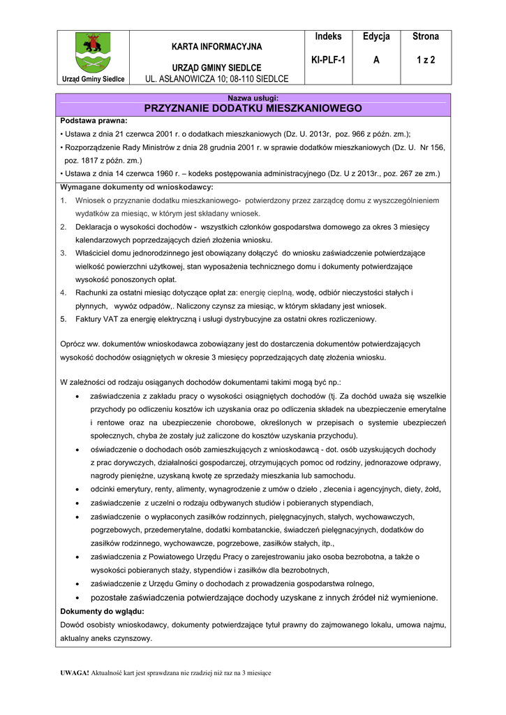 KARTA INFORMACYJNA URZĄD GMINY SIEDLCE UL. ASŁANOWICZA 10; 08-110 SIEDLCE Urząd Gminy Siedlce Indeks Edycja Strona KI-PLF-1 A 1z2 Nazwa usługi: PRZYZNANIE DODATKU MIESZKANIOWEGO Podstawa prawna: • Ustawa z dnia 21 czerwca 2001 r. o dodatkach mieszkaniowych (Dz. U. 2013r, poz. 966 z późn. zm.); • Rozporządzenie Rady Ministrów z dnia 28 grudnia 2001 r. w sprawie dodatków mieszkaniowych (Dz. U. Nr 156, poz. 1817 z późn. zm.) • Ustawa z dnia 14 czerwca 1960 r. – kodeks postępowania administracyjnego (Dz. U z 2013r., poz. 267 ze zm.) Wymagane dokumenty od wnioskodawcy: 1. Wniosek o przyznanie dodatku mieszkaniowego- potwierdzony przez zarządcę domu z wyszczególnieniem wydatków za miesiąc, w którym jest składany wniosek. 2. Deklaracja o wysokości dochodów - wszystkich członków gospodarstwa domowego za okres 3 miesięcy kalendarzowych poprzedzających dzień złożenia wniosku. 3. Właściciel domu jednorodzinnego jest obowiązany dołączyć do wniosku zaświadczenie potwierdzające wielkość powierzchni użytkowej, stan wyposażenia technicznego domu i dokumenty potwierdzające wysokość ponoszonych opłat. 4. Rachunki za ostatni miesiąc dotyczące opłat za: energię cieplną, wodę, odbiór nieczystości stałych i płynnych, wywóz odpadów,. Naliczony czynsz za miesiąc, w którym składany jest wniosek. 5. Faktury VAT za energię elektryczną i usługi dystrybucyjne za ostatni okres rozliczeniowy. Oprócz ww. dokumentów wnioskodawca zobowiązany jest do dostarczenia dokumentów potwierdzających wysokość dochodów osiągniętych w okresie 3 miesięcy poprzedzających datę złożenia wniosku. W zależności od rodzaju osiąganych dochodów dokumentami takimi mogą być np.: • zaświadczenia z zakładu pracy o wysokości osiągniętych dochodów (tj. Za dochód uważa się wszelkie przychody po odliczeniu kosztów ich uzyskania oraz po odliczenia składek na ubezpieczenie emerytalne i rentowe oraz na ubezpieczenie chorobowe, określonych w przepisach o systemie ubezpieczeń społecznych, chyba że zostały już zaliczone do kosztów uzyskania przychodu). • oświadczenie o dochodach osób zamieszkujących z wnioskodawcą - dot. osób uzyskujących dochody z prac dorywczych, działalności gospodarczej, otrzymujących pomoc od rodziny, jednorazowe odprawy, nagrody pieniężne, uzyskaną kwotę ze sprzedaży mieszkania lub samochodu. • odcinki emerytury, renty, alimenty, wynagrodzenie z umów o dzieło , zlecenia i agencyjnych, diety, żołd, • zaświadczenie z uczelni o rodzaju odbywanych studiów i pobieranych stypendiach, • zaświadczenie o wypłaconych zasiłków rodzinnych, pielęgnacyjnych, stałych, wychowawczych, pogrzebowych, przedemerytalne, dodatki kombatanckie, świadczeń pielęgnacyjnych, dodatków do zasiłków rodzinnego, wychowawcze, pogrzebowe, zasiłków stałych, itp., • zaświadczenia z Powiatowego Urzędu Pracy o zarejestrowaniu jako osoba bezrobotna, a także o wysokości pobieranych staży, stypendiów i zasiłków dla bezrobotnych, • zaświadczenie z Urzędu Gminy o dochodach z prowadzenia gospodarstwa rolnego, • pozostałe zaświadczenia potwierdzające dochody uzyskane z innych źródeł niż wymienione. Dokumenty do wglądu: Dowód osobisty wnioskodawcy, dokumenty potwierdzające tytuł prawny do zajmowanego lokalu, umowa najmu, aktualny aneks czynszowy. UWAGA! Aktualność kart jest sprawdzana nie rzadziej niż raz na 3 miesiące KARTA INFORMACYJNA Urząd Gminy Siedlce URZĄD GMINY SIEDLCE UL. ASŁANOWICZA 10; 08-110 SIEDLCE Indeks Edycja Strona KI-PLF-1 A 2z2 Sposób załatwienia sprawy: • Decyzja o przyznaniu lub odmowie przyznania dodatku mieszkaniowego. • Dodatek mieszkaniowy przyznaje się na okres 6-ciu miesięcy, licząc od pierwszego dnia miesiąca następującego po dniu złożenia wniosku. Opłaty: Nie podlega opłacie Przewidywany termin załatwienia sprawy: Niezwłocznie, nie później niż 30 dni od daty złożenia wniosku. Odpowiedzialność za załatwienie sprawy: Referat Planowania i Finansów Nr pokoju: 23 – II piętro Nr tel./fax: tel. (25) 63 277 31 w. 19 , fax (25) 63 236 30 Godziny pracy: 8.00 -16.00 Tryb odwoławczy: Odwołanie wnosi się do Samorządowego Kolegium Odwoławczego w Siedlcach za pośrednictwem Wójta Gminy Siedlce, w terminie 14 dni od dnia doręczenia decyzji. Uwagi: Druki można pobrać w pokoju nr 23 lub na stronie internetowej. UWAGA! Aktualność kart jest sprawdzana nie rzadziej niż raz na 3 miesiące
