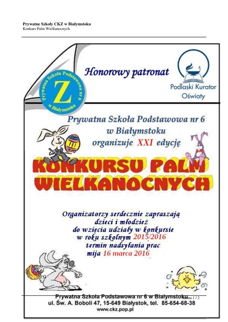 Prywatne Szkoły CKZ w Białymstoku Konkurs Palm Wielkanocnych strona 1 / 2 Prywatne Szkoły CKZ w Białymstoku Konkurs Palm Wielkanocnych Regulamin wydarzenia Program przedsięwzięcia strona 2 / 2