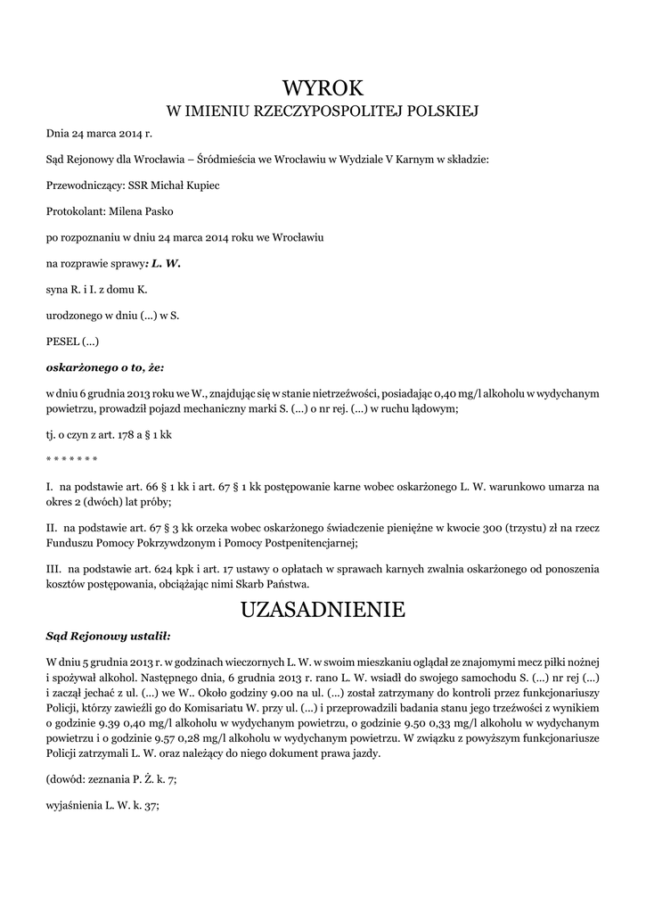 WYROK W IMIENIU RZECZYPOSPOLITEJ POLSKIEJ Dnia 24 marca 2014 r. Sąd Rejonowy dla Wrocławia – Śródmieścia we Wrocławiu w Wydziale V Karnym w składzie: Przewodniczący: SSR Michał Kupiec Protokolant: Milena Pasko po rozpoznaniu w dniu 24 marca 2014 roku we Wrocławiu na rozprawie sprawy: L. W. syna R. i I. z domu K. urodzonego w dniu (...) w S. PESEL (...) oskarżonego o to, że: w dniu 6 grudnia 2013 roku we W., znajdując się w stanie nietrzeźwości, posiadając 0,40 mg/l alkoholu w wydychanym powietrzu, prowadził pojazd mechaniczny marki S. (...) o nr rej. (...) w ruchu lądowym; tj. o czyn z art. 178 a § 1 kk ******* I. na podstawie art. 66 § 1 kk i art. 67 § 1 kk postępowanie karne wobec oskarżonego L. W. warunkowo umarza na okres 2 (dwóch) lat próby; II. na podstawie art. 67 § 3 kk orzeka wobec oskarżonego świadczenie pieniężne w kwocie 300 (trzystu) zł na rzecz Funduszu Pomocy Pokrzywdzonym i Pomocy Postpenitencjarnej; III. na podstawie art. 624 kpk i art. 17 ustawy o opłatach w sprawach karnych zwalnia oskarżonego od ponoszenia kosztów postępowania, obciążając nimi Skarb Państwa. UZASADNIENIE Sąd Rejonowy ustalił: W dniu 5 grudnia 2013 r. w godzinach wieczornych L. W. w swoim mieszkaniu oglądał ze znajomymi mecz piłki nożnej i spożywał alkohol. Następnego dnia, 6 grudnia 2013 r. rano L. W. wsiadł do swojego samochodu S. (...) nr rej (...) i zaczął jechać z ul. (...) we W.. Około godziny 9.00 na ul. (...) został zatrzymany do kontroli przez funkcjonariuszy Policji, którzy zawieźli go do Komisariatu W. przy ul. (...) i przeprowadzili badania stanu jego trzeźwości z wynikiem o godzinie 9.39 0,40 mg/l alkoholu w wydychanym powietrzu, o godzinie 9.50 0,33 mg/l alkoholu w wydychanym powietrzu i o godzinie 9.57 0,28 mg/l alkoholu w wydychanym powietrzu. W związku z powyższym funkcjonariusze Policji zatrzymali L. W. oraz należący do niego dokument prawa jazdy. (dowód: zeznania P. Ż. k. 7; wyjaśnienia L. W. k. 37; protokół badania alkomatem k. 2; protokół zatrzymania k. 4) L. W., urodzony w dniu (...), jest żonaty, ma dorosłe dzieci. Utrzymuje się z renty w kwocie 1.000 zł miesięcznie. Nie posiada majątku przedstawiającego większej wartości. L. W. jest człowiekiem cierpiącym na szereg schorzeń, w tym utrudniające mu poruszanie się. Nie był nigdy karany sądownie. (dowód: wyjaśnienia L. W. k. 36 – 37; wywiad środowiskowy k. 21 informacja z K. k. 20, k. 34) W toku dochodzenia oskarżony L. W. nie przyznał się do winy i odmówił składania wyjaśnień. Natomiast przed Sądem oskarżony w całości przyznał się do popełnienia zarzucanego mu czynu. Wyjaśniał, że wieczorem dnia poprzedniego spożywał alkohol ze znajomymi oglądając mecz piłki nożnej. Następnego dnia jechał samochodem ze swojego miejsca zamieszkania przy ul. (...) i został zatrzymany przez Policję przy ul. (...). Nie kwestionował wyników badania alkomatem. Podnosił jedynie, że nie spodziewał się tak wysokiego stężenia alkoholu w wydychanym powietrzu, czuł się dobrze, nigdy wcześniej taka sytuacja mu się nie zdarzyła. Sąd Rejonowy zważył: Sprawstwo i wina L. W. w zakresie zarzucanego mu czynu były oczywiste, natomiast okoliczności popełnienia tego przestępstwa i dotyczące samego oskarżonego w przekonaniu Sądu przemawiały za warunkowym umorzeniem postępowania karnego. Sam oskarżony w postępowaniu przygotowawczym co prawda nie przyznawał się do winy, ale wynikało to z obawy przed grożącą mu odpowiedzialnością, a jego oświadczenie pozostawało w oczywistej sprzeczności z całokształtem zebranego materiału dowodowego, w tym z zeznaniami świadka P. Ż. i wynikami badania alkomatem. Na rozprawie oskarżony zmienił jednak stanowisko i w pełni przyznał się do popełnienia zarzucanego mu czynu. Wyjaśnił, że prowadził samochód znajdując się w stanie nietrzeźwości i nie kwestionował wyniku badania alkomatem. Podał, że spożywał alkohol wieczorem dnia poprzedniego, oglądając mecz ze znajomymi, a następnego dnia jechał samochodem ze swojego miejsca zamieszkania przy ul. (...) i został zatrzymany na ul. (...). Nie ma powodów aby odmówić wiarygodności jego wyjaśnieniom, zwłaszcza że stan faktyczny sprawy jest niejako niesporny i nie ma dowodów przeciwnych. Są one nota bene zgodne z zeznaniami świadka P. Ż., Policjanta który dokonywał zatrzymania oskarżonego, a który opisywał że razem z funkcjonariuszem T. Ż. około godziny 9.00 zatrzymał L. W. na ul. (...) po otrzymaniu zgłoszenia o nietrzeźwym kierowcy poruszającym się samochodem S. (...). Z jego zeznań wynikało, że od kierowcy czuć było woń alkoholu, został więc przewieziony do Komisariatu W., gdzie poddano go badaniu na zawartość alkoholu w wydychanym powietrzu, potwierdzając że jest on nietrzeźwy. Stan nietrzeźwości oskarżonego Sąd ustalił na podstawie niekwestionowanych przez strony i nie budzących wątpliwości co do miarodajności odczytów alkosensora, z których wynikało, że oskarżony posiadał o godzinie 9.39 0,40 mg/l alkoholu w wydychanym powietrzu, o godzinie 9.50 0,33 mg/l alkoholu w wydychanym powietrzu i o godzinie 9.57 0,28 mg/l alkoholu w wydychanym powietrzu. Pewne wątpliwości budziły informacje podawane przez oskarżonego do protokołu badania alkomatem, co do ilości spożytego alkoholu. L. W. podawał bowiem, że o godzinie 20.00 dnia poprzedniego wypił jedno piwo, co jest niemożliwe z uwagi na uzyskane dnia następnego wyniki badania alkomatem. Ma to jednak mniejsze znaczenie, ponieważ składając wyjaśnienia na rozprawie oskarżony zmienił przecież swoje stanowisko, zaczął przyznawać się do winy, nie kwestionując tego że jechał samochodem w stanie nietrzeźwości, a w swoich wyjaśnieniach nie podawał, ile alkoholu spożył. Zdaniem Sądu jest oczywiste, że skoro oskarżony spożywał dnia poprzedniego piwo ze znajomymi podczas oglądania meczu piłki