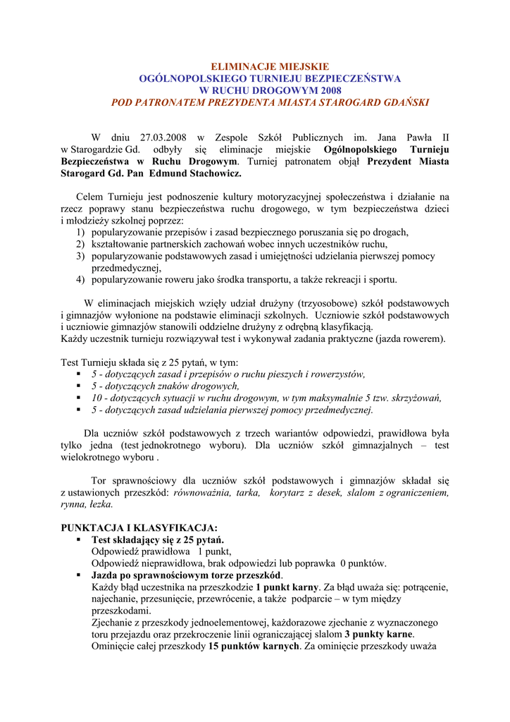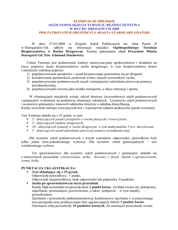 ELIMINACJE MIEJSKIE OGÓLNOPOLSKIEGO TURNIEJU BEZPIECZEŃSTWA W RUCHU DROGOWYM 2008 POD PATRONATEM PREZYDENTA MIASTA STAROGARD GDAŃSKI W dniu 27.03.2008 w Zespole Szkół Publicznych im. Jana Pawła II w Starogardzie Gd. odbyły się eliminacje miejskie Ogólnopolskiego Turnieju Bezpieczeństwa w Ruchu Drogowym. Turniej patronatem objął Prezydent Miasta Starogard Gd. Pan Edmund Stachowicz. Celem Turnieju jest podnoszenie kultury motoryzacyjnej społeczeństwa i działanie na rzecz poprawy stanu bezpieczeństwa ruchu drogowego, w tym bezpieczeństwa dzieci i młodzieŜy szkolnej poprzez: 1) popularyzowanie przepisów i zasad bezpiecznego poruszania się po drogach, 2) kształtowanie partnerskich zachowań wobec innych uczestników ruchu, 3) popularyzowanie podstawowych zasad i umiejętności udzielania pierwszej pomocy przedmedycznej, 4) popularyzowanie roweru jako środka transportu, a takŜe rekreacji i sportu. W eliminacjach miejskich wzięły udział druŜyny (trzyosobowe) szkół podstawowych i gimnazjów wyłonione na podstawie eliminacji szkolnych. Uczniowie szkół podstawowych i uczniowie gimnazjów stanowili oddzielne druŜyny z odrębną klasyfikacją. KaŜdy uczestnik turnieju rozwiązywał test i wykonywał zadania praktyczne (jazda rowerem). Test Turnieju składa się z 25 pytań, w tym: 5 - dotyczących zasad i przepisów o ruchu pieszych i rowerzystów, 5 - dotyczących znaków drogowych, 10 - dotyczących sytuacji w ruchu drogowym, w tym maksymalnie 5 tzw. skrzyŜowań, 5 - dotyczących zasad udzielania pierwszej pomocy przedmedycznej. Dla uczniów szkół podstawowych z trzech wariantów odpowiedzi, prawidłowa była tylko jedna (test jednokrotnego wyboru). Dla uczniów szkół gimnazjalnych – test wielokrotnego wyboru . Tor sprawnościowy dla uczniów szkół podstawowych i gimnazjów składał się z ustawionych przeszkód: równowaŜnia, tarka, korytarz z desek, slalom z ograniczeniem, rynna, łezka. PUNKTACJA I KLASYFIKACJA: Test składający się z 25 pytań. Odpowiedź prawidłowa 1 punkt, Odpowiedź nieprawidłowa, brak odpowiedzi lub poprawka 0 punktów. Jazda po sprawnościowym torze przeszkód. KaŜdy błąd uczestnika na przeszkodzie 1 punkt karny. Za błąd uwaŜa się: potrącenie, najechanie, przesunięcie, przewrócenie, a takŜe podparcie – w tym między przeszkodami. Zjechanie z przeszkody jednoelementowej, kaŜdorazowe zjechanie z wyznaczonego toru przejazdu oraz przekroczenie linii ograniczającej slalom 3 punkty karne. Ominięcie całej przeszkody 15 punktów karnych. Za ominięcie przeszkody uwaŜa się nie podjęcie próby przejazdu obydwoma kołami po przeszkodzie. Wyklucza się pokonywanie przeszkód podskakując na rowerze lub przenosząc rower 15 punktów karnych. KaŜdą przeszkodę zawodnik pokonuje jeden raz. Czas przejazdu po torze sprawnościowym nie jest limitowany. Turniej otworzyła Wizytator Kuratorium Oświaty Pani Teresa Burczyk Udział w eliminacjach miejskich wzięło udział 30 zawodników - 5 trzyosobowych druŜyn ze Szkół Podstawowych oraz 5 druŜyn trzyosobowych z Gimnazjów. KLASYFIKACJA KOŃCOWA TURNIEJU: Szkoły Podstawowe: I miejsce: ZS Publiczna Szkoła Podstawowa Nr 6 opiekun p. Ryszard Hapoński II miejsce: PSP Nr 1, opiekun p. Renata Grabowska III miejsce: PSP Nr 3 opiekun p. Wojciech Pachulski Gimnazja: I miejsce ZS Publiczne Gimnazjum Nr 4 opiekun p. Ryszard Hapoński II miejsce: PG Nr 1 opiekun p. ElŜbieta Dobrzyńska III miejsce: PG Nr 3, opiekun p. Adam Raczkowski Indywidualnie Szkoły Podstawowe I miejsce zajął Patryk Zimny z PSP Nr 6 Indywidualnie Gimnazja: I miejsce zajął Mateusz Koprowski PG Nr 4 Szkoła Podstawowa Nr 6 i Gimnazjum Nr 4 będą reprezentowały nasze miasto w eliminacjach powiatowych, które odbędą się 17.04.2008r. Najlepsze szkoły i najlepsi zawodnicy otrzymali nagrody ufundowane przez Prezydenta Miasta, które wręczyła Naczelnik Wydz. Spraw Społecz. Pani Urszula Domachowska Sędziowie główni turnieju: był przedstawiciel policji p. Marek Beyrowski Organizację eliminacji miejskich turnieju przygotował p. Ryszard Hapoński