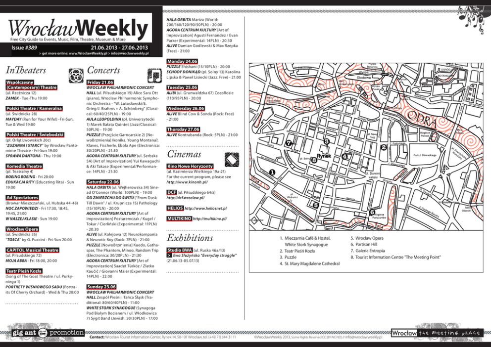 WrocławWeekly Free City Guide to Events, Music, Film, Theatre, Museum & More Issue #389 21.06.2013 - 27.06.2013 > get more online: www.WroclawWeekly.pl > [email protected] InTheaters Współczesny (Contemporary) Theatre (ul. Rzeźnicza 12) Zamek - Tue-Thu 19:00 Polski Theatre / Kameralna (ul. Świdnicka 28) Mayday (Run for Your Wife!) -Fri-Sun, Tue & Wed 19:00 Polski Theatre / Świebodzki (pl. Orląt Lwowskich 20c) “Zuzanna i Starcy" by Wrocław Pantomime Theatre - Fri-Sun 19:00 Sprawa Dantona - Thu 19:00 Komedia Theatre (pl. Teatralny 4) Boeing Boeing - Fri 20:00 Edukacja Rity (Educating Rita) - Sun 19:00 Ad Spectatores (Browar Mieszczański, ul. Hubska 44-48) Noc zapowiedzi - Fri 17:30, 18:45, 19:45, 21:00 W naszej klasie - Sun 19:00 Wrocław Opera (ul. Świdnicka 35) “Tosca" by G. Puccini - Fri-Sun 20:00 CAPITOL Musical Theatre (ul. Piłsudskiego 72) Moja ABBA - Fri 18:00, 20:00 Teatr Pieśń Kozła (Song of The Goat Theatre / ul. Purkyniego 1) Portrety Wiśniowego sadu (Portraits Of Cherry Orchard) - Wed & Thu 20:00 Concerts Friday 21.06 WROCŁAW PHILHARMONIC CONCERT HALL (ul. Piłsudskiego 19) Alice Sara Ott (piano), Wrocław Philharmonic Symphonic Orchestra - “W. Lutosławski/E. Grieg/J. Brahms + A. Schönberg" (Classical: 60/40/25PLN) - 19:00 AULA LEOPOLDINA (pl. Uniwersytecki 1) Marek Bałata Quintet (Jazz/Classical: 50PLN) - 19:00 PUZZLE (Przejście Garncarskie 2) [NowoBrzmienia] Ikonika, Young Montana?, Klaves, Fischerle, Ebola Ape (Electronica: 30/20PLN) - 21:30 AGORA CENTRUM KULTURY (ul. Serbska 5A) [Art of Improvization] Yui Kawaguchi & Aki Takase (Experimental/Performance: 14PLN) - 21:30 Saturday 22.06 HALA ORBITA (ul. Wejherowska 34) Sinead O’Connor (World: 100PLN) - 19:00 OD ZMIERZCHU DO ŚWITU (“From Dusk Till Dawn" / ul. Krupnicza 15) Pathology (15/10PLN) - 20:00 AGORA CENTRUM KULTURY [Art of Improvization] Postaremczak / Kugel / Tokar / Cierliński (Experimental: 11PLN) - 20:30 ALIVE (ul. Kolejowa 12) Neurokompania & Neurotic Boy (Rock: 7PLN) - 21:00 PUZZLE [NowoBrzmienia] Kuedo, Gathaspar, The Phantom, Minoo, Random Trip (Electronica: 30/20PLN) - 21:30 AGORA CENTRUM KULTURY [Art of Improvization] Saadet Türköz / Zlatko Kaučič / Giovanni Maier (Experimental: 14PLN) - 22:00 HALA ORBITA Mariza (World: 200/160/120/90/50PLN) - 20:00 AGORA CENTRUM KULTURY [Art of Improvization] Agustí Fernández / Evan Parker (Experimental: 14PLN) - 20:30 ALIVE Damian Godlewski & Max Rzepka (Free) - 21:00 Monday 24.06 PUZZLE Shishani (15/10PLN) - 20:00 SCHODY DONIKĄD (pl. Solny 13) Karolina Lipska & Paweł Lisiecki (Jazz: Free) - 21:00 Tuesday 25.06 ALIBI (ul. Grunwaldzka 67) CocoRosie (110/95PLN) - 20:00 Wednesday 26.06 ALIVE Blind Cow & Sonda (Rock: Free) - 21:00 pl. Jana Pawła II Thursday 27.06 ALIVE Kontrabanda (Rock: 5PLN) - 21:00 3 7 Cinemas 4 8 Kino Nowe Horyzonty (ul. Kazimierza Wielkiego 19a-21) For the current program, please see http://www.kinonh.pl/ 2 1 DCF (ul. Piłsudskiego 64/a) http://dcf.wroclaw.pl/ 5 HELIOS http://www.heliosnet.pl 6 MULTIKINO http://multikino.pl/ Exhibitions Studio BWA (ul. Ruska 46a/13) > Ewa Slużyńska “Everyday struggle" (21.06.13-05.07.13) 1. Mleczarnia Café & Hostel, White Stork Synagogue 2. Teatr Pieśń Kozła 3. Puzzle 4. St. Mary Magdalene Cathedral 5. 6. 7. 8. Wrocław Opera Partisan Hill Galeria Entropia Tourist Information Centre "The Meeting Point" Sunday 23.06 WROCŁAW PHILHARMONIC CONCERT HALL Zespół Pieśni i Tańca Śląsk (Traditional: 80/60/40PLN) - 11:00 WHITE STORK SYNAGOGUE (Synagoga Pod Białym Bocianem / ul. Włodkowica 7) Sygit Band (Jewish: 50/30PLN) - 17:00 12 11 9 Contact: Wrocław Tourist Information Center, Rynek 14, 50-101 Wrocław, tel. (+48 71) 344 31 11 7. Museum of Architecture 8. Ossolineum Institute 9. Jazz Club Rura 10. Tourist Information Centre 11. Wrocław Info - Coffee2go 10 ©WrocławWeekly 2013, Some Rights Reserved CC [BY-NC-ND] // [email protected] 14 15 16 13