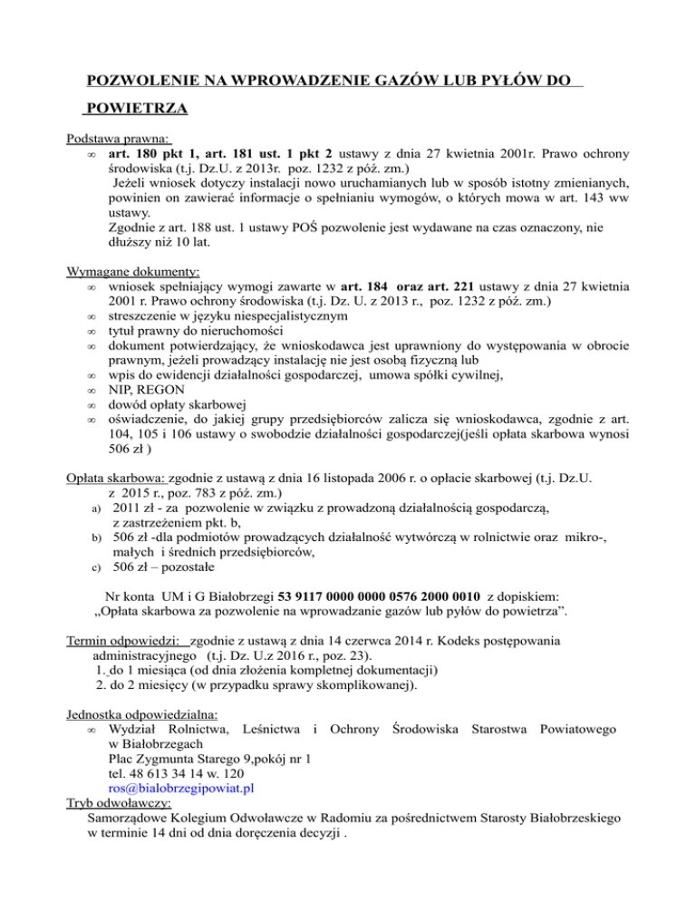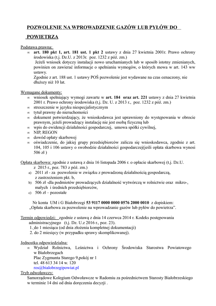 POZWOLENIE NA WPROWADZENIE GAZÓW LUB PYŁÓW DO POWIETRZA Podstawa prawna: • art. 180 pkt 1, art. 181 ust. 1 pkt 2 ustawy z dnia 27 kwietnia 2001r. Prawo ochrony środowiska (t.j. Dz.U. z 2013r. poz. 1232 z póź. zm.) Jeżeli wniosek dotyczy instalacji nowo uruchamianych lub w sposób istotny zmienianych, powinien on zawierać informacje o spełnianiu wymogów, o których mowa w art. 143 ww ustawy. Zgodnie z art. 188 ust. 1 ustawy POŚ pozwolenie jest wydawane na czas oznaczony, nie dłuższy niż 10 lat. Wymagane dokumenty: • wniosek spełniający wymogi zawarte w art. 184 oraz art. 221 ustawy z dnia 27 kwietnia 2001 r. Prawo ochrony środowiska (t.j. Dz. U. z 2013 r., poz. 1232 z póź. zm.) • streszczenie w języku niespecjalistycznym • tytuł prawny do nieruchomości • dokument potwierdzający, że wnioskodawca jest uprawniony do występowania w obrocie prawnym, jeżeli prowadzący instalację nie jest osobą fizyczną lub • wpis do ewidencji działalności gospodarczej, umowa spółki cywilnej, • NIP, REGON • dowód opłaty skarbowej • oświadczenie, do jakiej grupy przedsiębiorców zalicza się wnioskodawca, zgodnie z art. 104, 105 i 106 ustawy o swobodzie działalności gospodarczej(jeśli opłata skarbowa wynosi 506 zł ) Opłata skarbowa: zgodnie z ustawą z dnia 16 listopada 2006 r. o opłacie skarbowej (t.j. Dz.U. z 2015 r., poz. 783 z póź. zm.) a) 2011 zł - za pozwolenie w związku z prowadzoną działalnością gospodarczą, z zastrzeżeniem pkt. b, b) 506 zł -dla podmiotów prowadzących działalność wytwórczą w rolnictwie oraz mikro-, małych i średnich przedsiębiorców, c) 506 zł – pozostałe Nr konta UM i G Białobrzegi 53 9117 0000 0000 0576 2000 0010 z dopiskiem: „Opłata skarbowa za pozwolenie na wprowadzanie gazów lub pyłów do powietrza”. Termin odpowiedzi: zgodnie z ustawą z dnia 14 czerwca 2014 r. Kodeks postępowania administracyjnego (t.j. Dz. U.z 2016 r., poz. 23). 1. do 1 miesiąca (od dnia złożenia kompletnej dokumentacji) 2. do 2 miesięcy (w przypadku sprawy skomplikowanej). Jednostka odpowiedzialna: • Wydział Rolnictwa, Leśnictwa i Ochrony Środowiska Starostwa Powiatowego w Białobrzegach Plac Zygmunta Starego 9,pokój nr 1 tel. 48 613 34 14 w. 120 [email protected] Tryb odwoławczy: Samorządowe Kolegium Odwoławcze w Radomiu za pośrednictwem Starosty Białobrzeskiego w terminie 14 dni od dnia doręczenia decyzji . Wniosek na wprowadzanie gazów lub pyłów do powietrza powinien spełniać wymogi zawarte w art. 184 ust. 2 oraz art. 221 ust. 1 i 2 ustawy z dnia 27 kwietnia 2001 . Prawo ochrony środowiska (t.j. Dz.U. z 2013 r. ,poz. 1232 z póź. zm.): 1) Oznaczenie prowadzącego instalacje, jego adres zamieszkania lub siedziby. 1a) oznaczenie głównego prowadzącego instalację lub określenie zakresu odpowiedzialności poszczególnych prowadzących oznaczone części instalacji za eksploatację instalacji zgodnie z przepisami ochrony środowiska, w przypadku określonym w art. 183b. 2) Adres zakładu, na którego terenie prowadzona jest eksploatacja instalacji. 3) Informacja o tytule prawnym do instalacji. 4) Informacja o rodzaju instalacji, stosowanych urządzeniach i technologiach oraz charakterystykę techniczną źródeł powstania i miejsca emisji. 5) Ocenę stanu technicznego instalacji. 6) Informacje o rodzaju prowadzonej informacji. 7) Opis zakładanych wariantów funkcjonowania instalacji. 8) Blokowy (ogólny) schemat technologiczny wraz z bilansem masowym i rodzajami wykorzystanych materiałów, surowców i paliw, istotnych z punktu widzenia wymagań ochrony środowiska. 9) Informacje o energii wykorzystywanej lub wytwarzanej przez instalacje. 10) Wielkości i źródła powstania albo miejsca emisji – aktualnych lub proponowanych – w trakcje normalnej eksploatacji instalacji oraz w warunkach odbiegających od normalnych, w szczególności takich jak rozruch i wyłączenia( informacje powinny zawierać określenie wielkości emisji w kg/h i Mg/rok, a w przypadku instalacji, dla której są ustalone standardy emisyjne, także w jednostkach, w jakich wyrażone są standardy) 10a) Warunki lub parametry charakteryzujące pracę instalacji, określające moment rozruchu i moment rozpoczęcia wyłączania instalacji. 11) Informacje o planowanych okresach funkcjonowania instalacji w warunkach odbiegających od normalnych. 12) Informacje o istniejącym lub przewidywanym oddziaływaniu emisji na środowisko. 13) Wyniki pomiarów wielkości emisji z instalacji, jeżeli przeprowadzenie pomiarów było wymagane. 14) Zmiany wielkości emisji, jeżeli nastąpiły po uzyskaniu ostatniego pozwolenia dla instalacji. 15) Proponowane działania , w tym wyszczególnienie środków technicznych mających na celu zapobieganie lub ograniczenie emisji, a jeżeli działania mają być realizowane w okresie, na który ma być wydane pozwolenie- również proponowany termin zakończenia tych działań. 16) Proponowane procedury monitorowania procesów technologicznych istotnych z punktu widzenia wymagań ochrony środowiska, w szczególności pomiaru lub ewidencjonowania wielkości emisji (informacje powinny wskazywać także usytuowanie stanowisk do pomiaru wielkości emisji w zakresie gazów lub pyłów wprowadzanych do powietrza oraz proponowany zakres, metodykę i sposób wykonywania tych pomiarów). 17) Deklarowany termin i sposób zakończenia eksploatacji instalacji lub jej oznaczonej części, niestwarzającej zagrożenia dla środowiska, jeżeli zakończenie eksploatacji jest przewidywane w okresie, na który ma być wydane pozwolenie. 17a)deklarowany łączny czas dalszej eksploatacji instalacji, jeżeli ma on w pływ na określenie wymagań ochrony środowiska, oraz deklarowany sposób dokonywania czasu tej eksploatacji, 17b)deklarowany termin oddania instalacji do eksploatacji w przypadku określonym w art. 191a; 18) Czas, na jaki wydane ma być pozwolenie. 19) Czas pracy źródeł powstawania i miejsc wpro