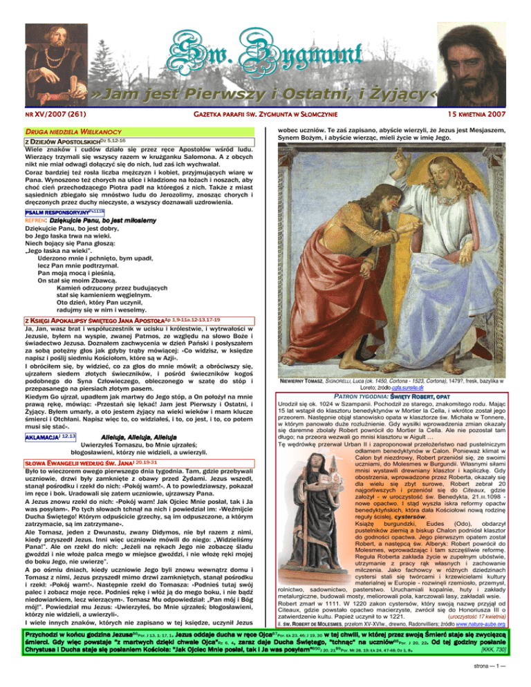 Sw. Zygmunt »Jam jest Pierwszy i Ostatni, i Żyjący« NR XV/2007 /2007 (261 (261) 61) GAZETKA PARAFII ŚW W. ZYGMUNTA W SŁOMCZYNIE DRUGA NIEDZIELA WIELKANOCY Z DZIEJÓW APOSTOLSKICHDz 5,12-16 15 KWIETNIA 2007 2007 wobec uczniów. Te zaś zapisano, abyście wierzyli, że Jezus jest Mesjaszem, Synem Bożym, i abyście wierząc, mieli życie w imię Jego. Wiele znaków i cudów działo się przez ręce Apostołów wśród ludu. Wierzący trzymali się wszyscy razem w krużganku Salomona. A z obcych nikt nie miał odwagi dołączyć się do nich, lud zaś ich wychwalał. Coraz bardziej też rosła liczba mężczyzn i kobiet, przyjmujących wiarę w Pana. Wynoszono też chorych na ulice i kładziono na łożach i noszach, aby choć cień przechodzącego Piotra padł na któregoś z nich. Także z miast sąsiednich zbiegało się mnóstwo ludu do Jerozolimy, znosząc chorych i dręczonych przez duchy nieczyste, a wszyscy doznawali uzdrowienia. PSALM RESPONSORYJNYPs1118 REFREN: Dziękujcie Panu, bo jest miłosierny Dziękujcie Panu, bo jest dobry, bo Jego łaska trwa na wieki. Niech bojący się Pana głoszą: „Jego łaska na wieki”. Uderzono mnie i pchnięto, bym upadł, lecz Pan mnie podtrzymał. Pan moją mocą i pieśnią, On stał się moim Zbawcą. Kamień odrzucony przez budujących stał się kamieniem węgielnym. Oto dzień, który Pan uczynił, radujmy się w nim i weselmy. Z KSIĘGI APOKALIPSY ŚWIĘTEGO JANA APOSTOŁAAp 1,9-11a.12-13.17-19 Ja, Jan, wasz brat i współuczestnik w ucisku i królestwie, i wytrwałości w Jezusie, byłem na wyspie, zwanej Patmos, ze względu na słowo Boże i świadectwo Jezusa. Doznałem zachwycenia w dzień Pański i posłyszałem za sobą potężny głos jak gdyby trąby mówiącej: »Co widzisz, w księdze napisz i poślij siedmiu Kościołom, które są w Azji«. I obróciłem się, by widzieć, co za głos do mnie mówił; a obróciwszy się, ujrzałem siedem złotych świeczników, i pośród świeczników kogoś podobnego do Syna Człowieczego, obleczonego w szatę do stóp i przepasanego na piersiach złotym pasem. Kiedym Go ujrzał, upadłem jak martwy do Jego stóp, a On położył na mnie prawą rękę, mówiąc: »Przestań się lękać! Jam jest Pierwszy i Ostatni, i Żyjący. Byłem umarły, a oto jestem żyjący na wieki wieków i mam klucze śmierci i Otchłani. Napisz więc to, co widziałeś, i to, co jest, i to, co potem musi się stać«. AKLAMACJAJ 12,13 Alleluja, Alleluja, Alleluja Uwierzyłeś Tomaszu, bo Mnie ujrzałeś; błogosławieni, którzy nie widzieli, a uwierzyli. SŁOWA EWANGELII WEDŁUG ŚW. JANAJ 20,19-31 Było to wieczorem owego pierwszego dnia tygodnia. Tam, gdzie przebywali uczniowie, drzwi były zamknięte z obawy przed Żydami. Jezus wszedł, stanął pośrodku i rzekł do nich: »Pokój wam!«. A to powiedziawszy, pokazał im ręce i bok. Uradowali się zatem uczniowie, ujrzawszy Pana. A Jezus znowu rzekł do nich: »Pokój wam! Jak Ojciec Mnie posłał, tak i Ja was posyłam«. Po tych słowach tchnął na nich i powiedział im: »Weźmijcie Ducha Świętego! Którym odpuścicie grzechy, są im odpuszczone, a którym zatrzymacie, są im zatrzymane«. Ale Tomasz, jeden z Dwunastu, zwany Didymos, nie był razem z nimi, kiedy przyszedł Jezus. Inni więc uczniowie mówili do niego: „Widzieliśmy Pana!”. Ale on rzekł do nich: „Jeżeli na rękach Jego nie zobaczę śladu gwoździ i nie włożę palca mego w miejsce gwoździ, i nie włożę ręki mojej do boku Jego, nie uwierzę”. A po ośmiu dniach, kiedy uczniowie Jego byli znowu wewnątrz domu i Tomasz z nimi, Jezus przyszedł mimo drzwi zamkniętych, stanął pośrodku i rzekł: »Pokój wam!«. Następnie rzekł do Tomasza: »Podnieś tutaj swój palec i zobacz moje ręce. Podnieś rękę i włóż ją do mego boku, i nie bądź niedowiarkiem, lecz wierzącym«. Tomasz Mu odpowiedział: „Pan mój i Bóg mój!”. Powiedział mu Jezus: »Uwierzyłeś, bo Mnie ujrzałeś; błogosławieni, którzy nie widzieli, a uwierzyli«. I wiele innych znaków, których nie zapisano w tej księdze, uczynił Jezus NIEWIERNY TOMASZ, SIGNORELLI, Luca (ok. 1450, Cortona - 1523, Cortona), 1479?, fresk, bazylika w Loreto; źródło cgfa.sunsite.dk PATRON TYGODNIA: ŚWIĘTY ROBERT, OPAT Urodził się ok. 1024 w Szampanii. Pochodził ze starego, znakomitego rodu. Mając 15 lat wstąpił do klasztoru benedyktynów w Mortier la Cella, i wkrótce został jego przeorem. Następnie objął stanowisko opata w klasztorze św. Michała w Tonnere, w którym panowało duże rozluźnienie. Gdy wysiłki wprowadzenia zmian okazały się daremne zbolały Robert powrócił do Mortier la Cella. Ale nie pozostał tam długo; na przeora wezwali go mnisi klasztoru w Aigult … Tę wędrówkę przerwał Urban II i zaproponował przełożeństwo nad pustelniczym odłamem benedyktynów w Calon. Ponieważ klimat w Calon był niezdrowy, Robert przeniósł się, ze swoimi uczniami, do Molesmes w Burgundii. Własnymi siłami mnisi wystawili drewniany klasztor i kapliczkę. Gdy obostrzenia, wprowadzone przez Roberta, okazały się dla wielu się zbyt surowe, Robert zebrał 20 najgorliwszych i przeniósł się do Citeaux, gdzie założył - w uroczystość św. Benedykta, 21.III.1098 nowe opactwo. I stąd wyszła iskra reformy opactw benedyktyńskich, która dała Kościołowi nową rodzinę reguły ścisłej, cystersów. Książę burgundzki, Eudes (Odo), obdarzył pustelników ziemią a biskup Chalon podniósł klasztor do godności opactwa. Jego pierwszym opatem został Robert, a następcą św. Alberyk: Robert powrócił do Molesmes, wprowadzając i tam szczęśliwie reformę. Reguła Roberta zakłada życie w zupełnym ubóstwie, utrzymanie z pracy rąk własnych i zachowanie milczenia. Jako fachowcy w różnych dziedzinach cystersi stali się twórcami i krzewicielami kultury materialnej w Europie - rozwinęli rzemiosło, przemysł, rolnictwo, sadownictwo, pasterstwo. Uruchamiali kopalnie