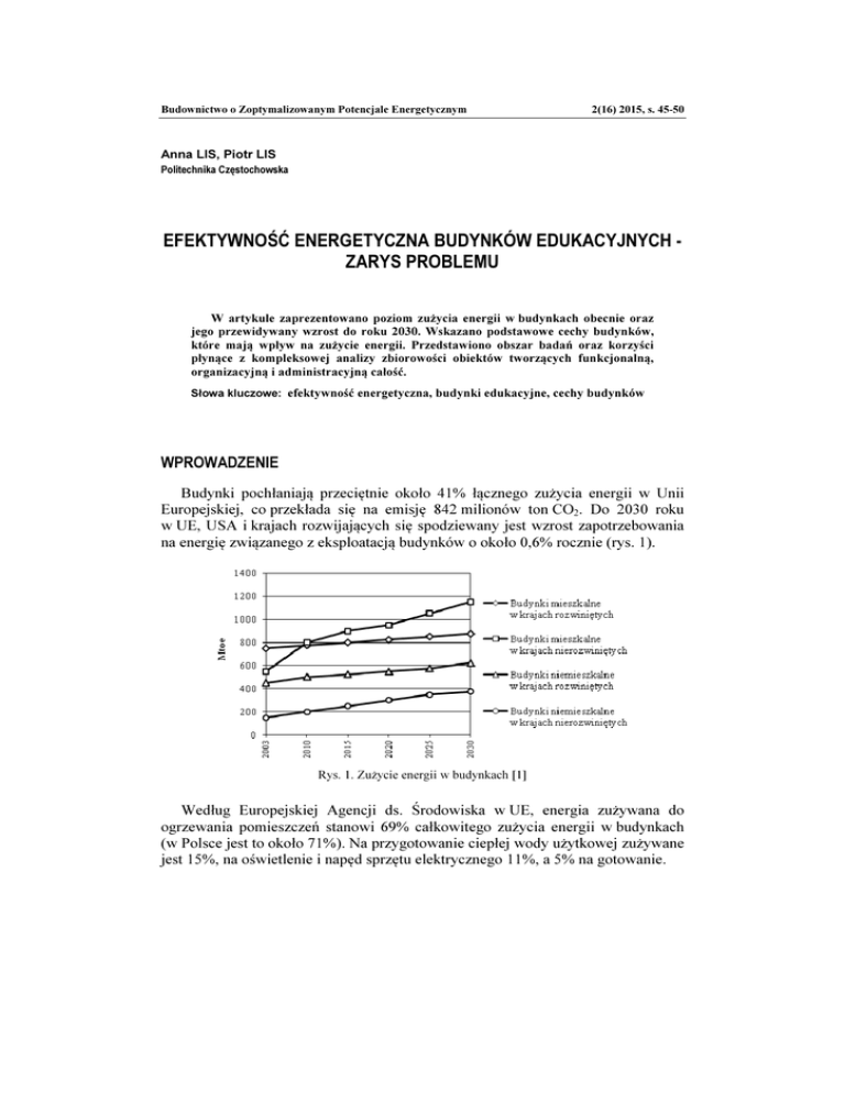 Budownictwo o Zoptymalizowanym Potencjale Energetycznym 2(16) 2015, s. 45-50 Anna LIS, Piotr LIS Politechnika Częstochowska EFEKTYWNOŚĆ ENERGETYCZNA BUDYNKÓW EDUKACYJNYCH ZARYS PROBLEMU W artykule zaprezentowano poziom zużycia energii w budynkach obecnie oraz jego przewidywany wzrost do roku 2030. Wskazano podstawowe cechy budynków, które mają wpływ na zużycie energii. Przedstawiono obszar badań oraz korzyści płynące z kompleksowej analizy zbiorowości obiektów tworzących funkcjonalną, organizacyjną i administracyjną całość. Słowa kluczowe: efektywność energetyczna, budynki edukacyjne, cechy budynków WPROWADZENIE Budynki pochłaniają przeciętnie około 41% łącznego zużycia energii w Unii Europejskiej, co przekłada się na emisję 842 milionów ton CO2. Do 2030 roku w UE, USA i krajach rozwijających się spodziewany jest wzrost zapotrzebowania na energię związanego z eksploatacją budynków o około 0,6% rocznie (rys. 1). Rys. 1. Zużycie energii w budynkach [1] Według Europejskiej Agencji ds. Środowiska w UE, energia zużywana do ogrzewania pomieszczeń stanowi 69% całkowitego zużycia energii w budynkach (w Polsce jest to około 71%). Na przygotowanie ciepłej wody użytkowej zużywane jest 15%, na oświetlenie i napęd sprzętu elektrycznego 11%, a 5% na gotowanie. 46 A. Lis, P. Lis 1. ZUŻYCIE ENERGII W BUDYNKACH O RÓŻNEJ FUNKCJI W krajach UE-15 największym konsumentem energii były budynki administracyjne oraz przemysłowe i handlowe, pochłaniające w sumie około 45% zużywanej energii. Kolejnym użytkownikiem energii były budynki biurowe. Budynki edukacyjne zużywały około 8,3% energii (rys. 2). 25 20 15 10 1999 5 Pozostałe budynki Szpitale, domy opieki społecznej Edukacyjne Hotele i restauracje Biura Przemysłowe i handlowe 2001 Administracyjne 0 Rys. 2. Procentowe zużycie energii w budynkach o różnej funkcji w UE-15 [2] Każda grupa budynków ze względu na specyficzne, odrębne cechy charakteryzowała się odmienną strukturą zużycia energii na poszczególne cele (rys. 3). 100% 90% budynki produkcyjne 80% budynki oświatowe 70% budynki mieszkalne 60% 50% 40% 30% 20% 10% 0% ogrzewanie wentylacja oświetlenie produkcja urz. elektryczne warsztaty szkolne ciepła woda gotowanie Rys. 3. Struktura zużycia energii w różnych grupach budynków [3] 2. CECHY BUDYNKÓW WPŁYWAJĄCE NA ZUŻYCIE CIEPŁA Każdy budynek, ze względu na swoje przeznaczenie oraz istniejące kanony projektowe, posiada określone cechy indywidualne, które decydują o charakterystyce Efektywność energetyczna budynków edukacyjnych - zarys problemu 47 cieplno-energetycznej danego budynku i mają wpływ na zużycie ciepła do jego ogrzewania, które ma największy udział w ogólnym bilansie zużycia energii w budynkach. Budynki produkcyjne oraz edukacyjne charakteryzują się odmiennym kształtem bryły i rozwiązaniem układu funkcjonalnego w stosunku do budynków mieszkalnych. Posiadają one większą wysokość kondygnacji, wyższy procent przeszklenia elewacji oraz dużą powierzchnię przegród, przez które traci się ciepło. W budynkach edukacyjnych największe przeszklenie występuje zazwyczaj na elewacji południowej. W znacznej części tych budynków mamy do czynienia z czasowym użytkowaniem określonych pomieszczeń. Należy się więc spodziewać, że szereg cech budynków ukształtowanych w odmienny sposób z uwagi na różne wymagania użytkowe będzie inaczej wpływać na charakterystykę zużycia energii w tych obiektach. Może to ograniczać lub wręcz uniemożliwiać wzajemne wykorzystanie wyników analiz i doświadczeń zdobytych dla różnych grup funkcjonalnych budynków. Do podstawowych cech, które należałoby uwzględnić przy ocenie energochłonności budynków edukacyjnych, można zaliczyć: 1. Grupa cech organizacyjnych: 1.1. czas trwania zajęć lekcyjnych, 1.2. czas trwania zajęć pozalekcyjnych, 1.3. czas trwania zajęć lekcyjnych i pozalekcyjnych, 2. Grupa cech architektoniczno-budowlanych: 2.1. wielkość i kształt bryły budynku, 2.2. powierzchnia, kształt i usytuowanie okien, 2.3. wykorzystanie powierzchni użytkowej, 2.4. usytuowanie budynku w terenie, 3. Grupa cech materiałowo-konstrukcyjnych: 3.1. własności termoizolacyjne przegród zewnętrznych, 3.2. typizacja projektu architektoniczno-budowlanego, 3.3. technologia realizacji budynku, 3.4. stan techniczny budynku, 4. Grupa cech instalacyjnych: 4.1. wyposażenie systemu c.o. w urządzenia i automatykę regulacyjną, 4.2. eksploatacja instalacji c.o., 4.3. rodzaj źródła zasilania w ciepło, 4.4. charakterystyka i eksploatacja źródła ciepła w kotłowniach własnych, 4.5. system wentylacji w budynku i jego funkcjonowanie. Skuteczna ocena efektywności energetycznej budynków edukacyjnych nie jest w pełni możliwa bez poznania zarówno teoretycznego, jak i rzeczywistego wpływu przedstawionych cech tych budynków na zużycie ciepła do ogrzewania i zachodzących w tym przypadku zależności. 48 A. Lis, P. Lis 3. ANALIZA EFEKTYWNOŚCI ENERGETYCZNEJ BUDYNKÓW EDUKACYJNYCH - OBSZAR BADAŃ W zaakceptowanej przez Radę Europy w dniu 14 kwietnia 2010 roku nowelizacji Dyrektywy 2002/91/WE z dnia 16 grudnia 2002 roku w sprawie charakterystyki energetycznej budynków wskazuje się przede wszystkim na ważną rolę sektora publicznego w utrwalaniu zasad racjonalizacji zużycia energii i efektywności energetycznej [5]. Zawarte są tam m.in. istotne stwierdzenia: „Władze publiczne powinny dawać przykład i dążyć do realizacji zaleceń zawartych w świadectwie charakterystyki energetycznej” oraz „Budynki zajmowane przez władze publiczne i budynki często odwiedzane przez ludność powinny dawać dobry przykład poprzez uwzględnianie rozważań środowiskowych i energetycznych”. Również zgodnie z tą nowelizacją budynki dla potrzeb oceny efektywności energetycznej powinny być odpowiednio sklasyfikowane w kategoriach funkcjonalnych. Warunki techniczne 