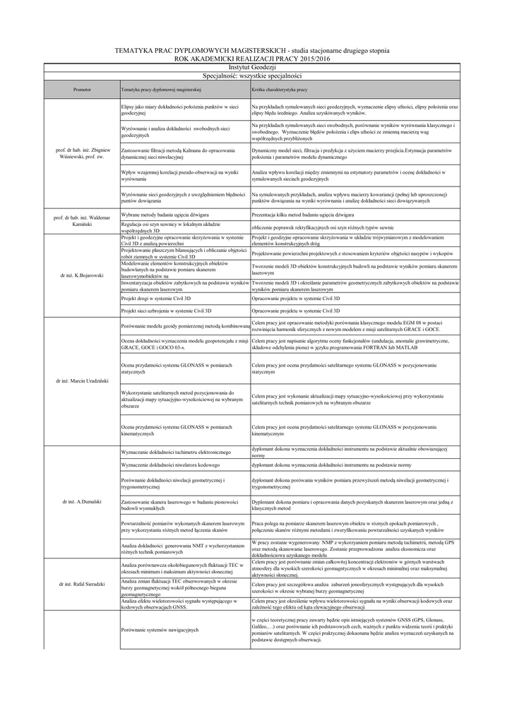 TEMATYKA PRAC DYPLOMOWYCH MAGISTERSKICH - studia stacjonarne drugiego stopnia ROK AKADEMICKI REALIZACJI PRACY 2015/2016 Instytut Geodezji Specjalność: wszystkie specjalności Promotor prof. dr hab. inż. Zbigniew Wiśniewski, prof. zw. prof. dr hab. inż. Waldemar Kamiński dr inż. K.Bojarowski Tematyka pracy dyplomowej magisterskiej Krótka charakterystyka pracy Elipsy jako miary dokładności położenia punktów w sieci geodezyjnej Na przykładach symulowanych sieci geodezyjnych, wyznaczenie elipsy ufności, elipsy położenia oraz elipsy błędu średniego. Analiza uzyskiwanych wyników. Wyrównanie i analiza dokładności swobodnych sieci geodezyjnych Na przykładach symulowanych sieci swobodnych, porównanie wyników wyrównania klasycznego i swobodnego. Wyznaczenie błędów położenia i elips ufności ze zmienną macierzą wag współrzędnych przybliżonych Zastosowanie filtracji metodą Kalmana do opracowania dynamicznej sieci niwelacyjnej Dynamiczny model sieci, filtracja i predykcja z użyciem macierzy przejścia.Estymacja parametrów położenia i parametrów modelu dynamicznego Wpływ wzajemnej korelacji pseudo-obserwacji na wyniki wyrównania Analiza wpływu korelacji między zmiennymi na estymatory parametrów i ocenę dokładności w symulowanych sieciach geodezyjnych Wyrównanie sieci geodezyjnych z uwzględnieniem błędności puntów dowiązania Na symulowanych przykładach, analiza wpływu macierzy kowariancji (pełnej lub uproszczonej) punktów dowiązania na wyniki wyrównania i analizę dokładności sieci dowiązywanych Wybrane metody badania ugięcia dźwigara Prezentacja kilku metod badaniu ugięcia dźwigara Regulacja osi szyn suwnicy w lokalnym układzie współrzędnych 3D Projekt i geodezyjne opracowanie skrzyżowania w systemie Civil 3D z analizą powierzchni Projektowanie płaszczyzn bilansujących i obliczanie objętości robót ziemnych w systemie Civil 3D Modelowanie elementów konstrukcyjnych obiektów budowlanych na podstawie pomiaru skanerem laserowymobiektów na Inwentaryzacja obiektów zabytkowych na podstawie wyników pomiaru skanerem laserowym obliczenie poprawek rektyfikacyjnych osi szyn różnych typów suwnic Projekt i geodzyjne opracowanie skrzyżowania w układzie trójwymiarowym z modelowaniem elementów konstrukcyjnych dróg Projektowanie powierzchni projektowych z stosowaniem kryteriów objętości nasypów i wykopów Tworzenie modeli 3D obiektów konstrukcyjnych budowli na podstawie wyników pomiaru skanerem laserowym Tworzenie modeli 3D i określanie parametrów geometrycznych zabytkowych obiektów na podstawie wyników pomiaru skanerem laserowym Projekt drogi w systemie Civil 3D Opracowanie projektu w systemie Civil 3D Projekt sieci uzbrojenia w systemie Civil 3D Opracowanie projektu w systemie Civil 3D Celem pracy jest opracowanie metodyki porównania klasycznego modelu EGM 08 w postaci Porównanie modelu geoidy pomierzonej metodą kombinowaną EGM-08 z modelem satelitarnym GOCO 03-s. rozwinięcia harmonik sferycznych z nowym modelem z misji satelitarnych GRACE i GOCE. Ocena dokładności wyznaczenia modelu geopotencjału z misji Celem pracy jest napisanie algorytmu oceny funkcjonałów (undulacja, anomalie grawimetryczne, GRACE, GOCE i GOCO 03-s. składowe odchylenia pionu) w języku programowania FORTRAN lub MATLAB Ocena przydatności systemu GLONASS w pomiarach statycznych Celem pracy jest ocena przydatności satelitarnego systemu GLONASS w pozycjonowaniu statycznym Wykorzystanie satelitarnych metod pozycjonowania do aktualizacji mapy sytuacjyjno-wysokościowej na wybranym obszarze Celem pracy jest wykonanie aktualizacji mapy sytuacyjno-wysokościowej przy wykorzystaniu satelitarnych technik pomiarowych na wybranym obszarze Ocena przydatności systemu GLONASS w pomiarach kinematycznych Celem pracy jest ocena przydatności satelitarnego systemu GLONASS w pozycjonowaniu kinematycznym Wyznaczanie dokładności tachimetru elektronicznego dyplomant dokona wyznaczenia dokładności instrumentu na podstawie aktualnie obowiazującej normy Wyznaczenie dokładności niwelatora kodowego dyplomant dokona wyznaczenia dokładności instrumentu na podstawie normy Porównanie dokładności niwelacji geometrycznej i trygonometrycznej dyplomant dokona porówania wyników pomiaru przewyższeń metodą niwelacji geometrycznej i trygonometrycznej Zastosowanie skanera laserowego w badaniu pionowości budowli wysmukłych Dyplomant dokona pomiaru i opracowania danych pozyskanych skanerem laserowym oraz jedną z klasycznych metod Powtarzalność pomiarów wykonanych skanerem laserowym przy wykorzystaniu różnych metod łączenia skanów Praca polega na pomiarze skanerem laserowym obiektu w róznych epokach pomiarowych , połączeniu skanów różnymi metodami i zweryfikowaniu powtarzalności uzyskanych wyników dr inż. Marcin Uradziński dr inż. A.Dumalski Analiza dokładności generowania NMT z wychorzystaniem różnych technik pomiarowych Analiza porównawcza okołobiegunowych fluktuacji TEC w okresach minimum i maksimum aktywności słonecznej dr inż. Rafal Sieradzki Analiza zmian fluktuacji TEC obserwowanych w okresie burzy geomagnetycznej wokół północnego bieguna geomagnetycznego Analiza efektu wielotorowości sygnału występującego w kodowych obserwacjach GNSS. Porównanie systemów nawigacyjnych W pracy zostanie wygenerowany NMP z wykorzyaniem pomiaru metodą tachimetrii, metodą GPS oraz metodą skanowanie laserowego. Zostanie przeprowadzona analiza ekonomicza oraz dokładnościowa uzyskanego modelu Celem pracy jest porównanie zmian całkowitej koncentracji elektronów w górnych warstwach atmosfery dla wysokich szerokości geomagntycznych w okresach minimalnej oraz maksymalnej aktywności słonecznej. Celem pracy jest szczegółowa analiza zaburzeń jonosferycznych występujących dla wysokich szerokości w okresie wybranej burzy geomagnetycznej Celem pracy jest określenie wpływu wielotorowości sygnału na wyniki obserwacji kodo