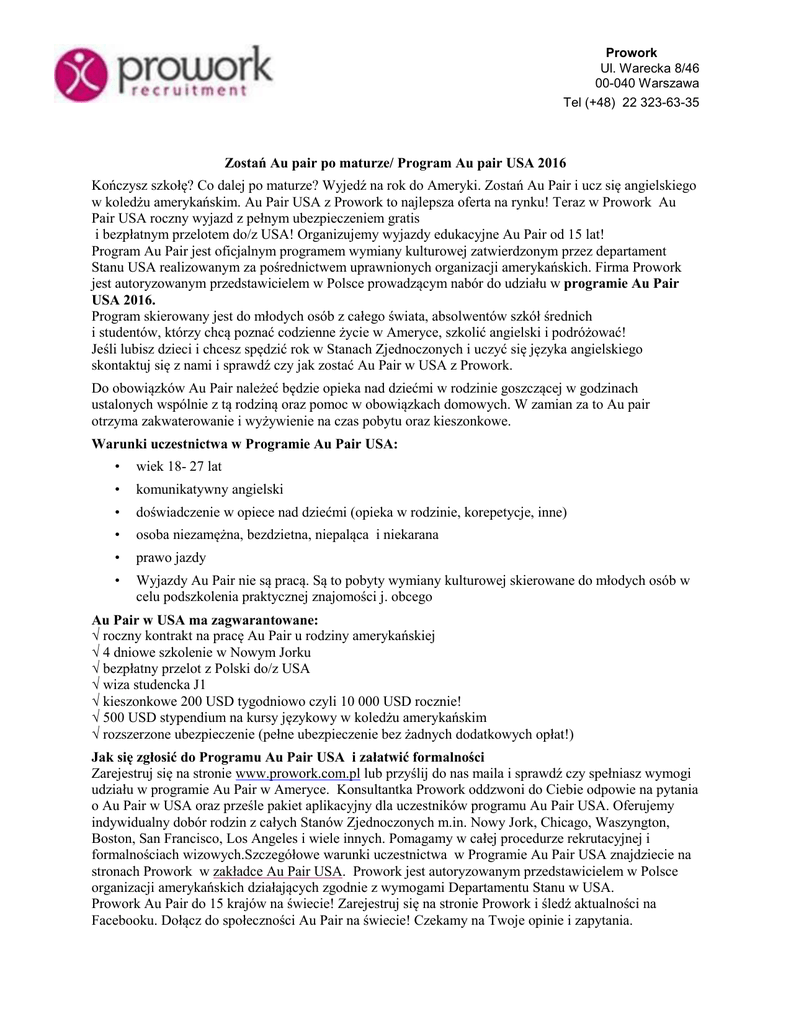 Prowork Ul. Warecka 8/46 00-040 Warszawa Tel (+48) 22 323-63-35 Zostań Au pair po maturze/ Program Au pair USA 2016 Kończysz szkołę? Co dalej po maturze? Wyjedź na rok do Ameryki. Zostań Au Pair i ucz się angielskiego w koledżu amerykańskim. Au Pair USA z Prowork to najlepsza oferta na rynku! Teraz w Prowork Au Pair USA roczny wyjazd z pełnym ubezpieczeniem gratis i bezpłatnym przelotem do/z USA! Organizujemy wyjazdy edukacyjne Au Pair od 15 lat! Program Au Pair jest oficjalnym programem wymiany kulturowej zatwierdzonym przez departament Stanu USA realizowanym za pośrednictwem uprawnionych organizacji amerykańskich. Firma Prowork jest autoryzowanym przedstawicielem w Polsce prowadzącym nabór do udziału w programie Au Pair USA 2016. Program skierowany jest do młodych osób z całego świata, absolwentów szkół średnich i studentów, którzy chcą poznać codzienne życie w Ameryce, szkolić angielski i podróżować! Jeśli lubisz dzieci i chcesz spędzić rok w Stanach Zjednoczonych i uczyć się języka angielskiego skontaktuj się z nami i sprawdź czy jak zostać Au Pair w USA z Prowork. Do obowiązków Au Pair należeć będzie opieka nad dziećmi w rodzinie goszczącej w godzinach ustalonych wspólnie z tą rodziną oraz pomoc w obowiązkach domowych. W zamian za to Au pair otrzyma zakwaterowanie i wyżywienie na czas pobytu oraz kieszonkowe. Warunki uczestnictwa w Programie Au Pair USA: • wiek 18- 27 lat • komunikatywny angielski • doświadczenie w opiece nad dziećmi (opieka w rodzinie, korepetycje, inne) • osoba niezamężna, bezdzietna, niepaląca i niekarana • prawo jazdy • Wyjazdy Au Pair nie są pracą. Są to pobyty wymiany kulturowej skierowane do młodych osób w celu podszkolenia praktycznej znajomości j. obcego Au Pair w USA ma zagwarantowane: √ roczny kontrakt na pracę Au Pair u rodziny amerykańskiej √ 4 dniowe szkolenie w Nowym Jorku √ bezpłatny przelot z Polski do/z USA √ wiza studencka J1 √ kieszonkowe 200 USD tygodniowo czyli 10 000 USD rocznie! √ 500 USD stypendium na kursy językowy w koledżu amerykańskim √ rozszerzone ubezpieczenie (pełne ubezpieczenie bez żadnych dodatkowych opłat!) Jak się zgłosić do Programu Au Pair USA i załatwić formalności Zarejestruj się na stronie www.prowork.com.pl lub przyślij do nas maila i sprawdź czy spełniasz wymogi udziału w programie Au Pair w Ameryce. Konsultantka Prowork oddzwoni do Ciebie odpowie na pytania o Au Pair w USA oraz prześle pakiet aplikacyjny dla uczestników programu Au Pair USA. Oferujemy indywidualny dobór rodzin z całych Stanów Zjednoczonych m.in. Nowy Jork, Chicago, Waszyngton, Boston, San Francisco, Los Angeles i wiele innych. Pomagamy w całej procedurze rekrutacyjnej i formalnościach wizowych.Szczegółowe warunki uczestnictwa w Programie Au Pair USA znajdziecie na stronach Prowork w zakładce Au Pair USA. Prowork jest autoryzowanym przedstawicielem w Polsce organizacji amerykańskich działających zgodnie z wymogami Departamentu Stanu w USA. Prowork Au Pair do 15 krajów na świecie! Zarejestruj się na stronie Prowork i śledź aktualności na Facebooku. Dołącz do społeczności Au Pair na świecie! Czekamy na Twoje opinie i zapytania.