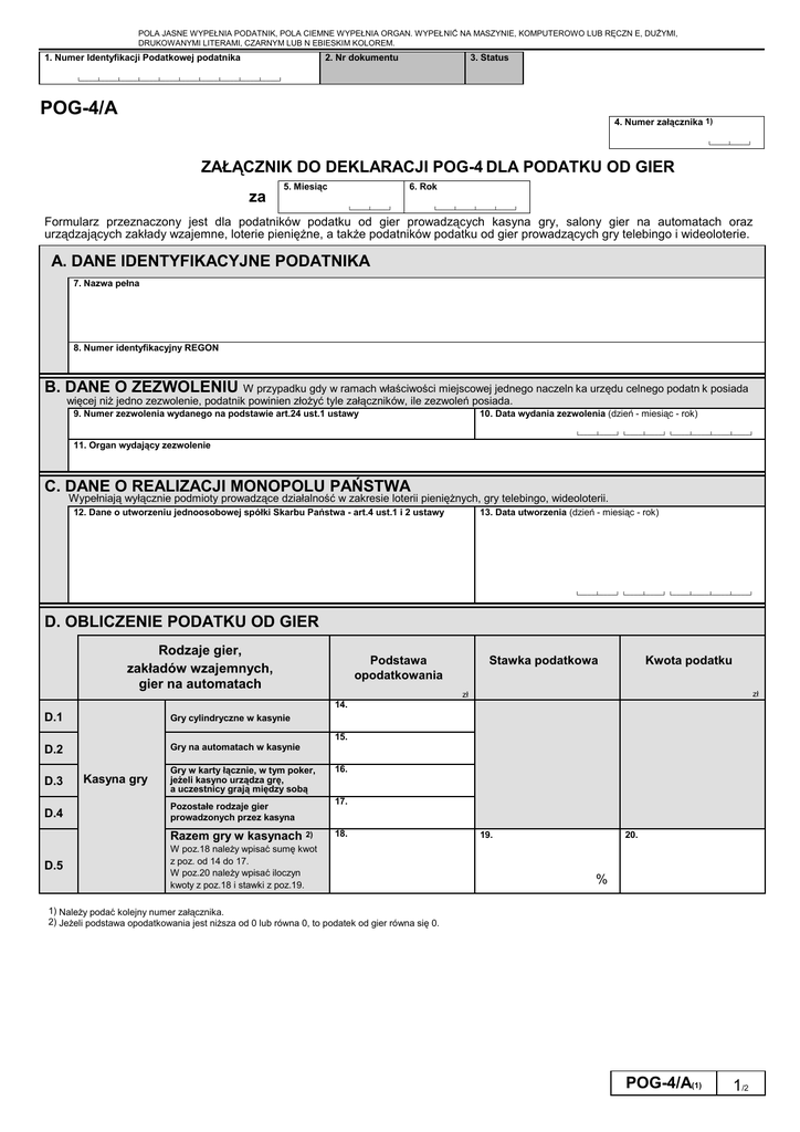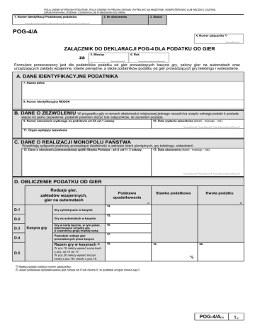 POLA JASNE WYPEŁNIA PODATNIK, POLA CIEMNE WYPEŁNIA ORGAN. WYPEŁNIĆ NA MASZYNIE, KOMPUTEROWO LUB RĘCZN E, DUŻYMI, DRUKOWANYMI LITERAMI, CZARNYM LUB N EBIESKIM KOLOREM. 1. Numer Identyfikacji Podatkowej podatnika 2. Nr dokumentu 3. Status └────┴────┴────┴────┴────┴────┴────┴────┴────┴────┘ POG-4/A 4. Numer załącznika 1) └────┴────┘ ZAŁĄCZNIK DO DEKLARACJI POG-4 DLA PODATKU OD GIER za 5. Miesiąc 6. Rok └────┴────┘ └────┴────┴────┴────┘ Formularz przeznaczony jest dla podatników podatku od gier prowadzących kasyna gry, salony gier na automatach oraz urządzających zakłady wzajemne, loterie pieniężne, a także podatników podatku od gier prowadzących gry telebingo i wideoloterie. A. DANE IDENTYFIKACYJNE PODATNIKA 7. Nazwa pełna 8. Numer identyfikacyjny REGON B. DANE O ZEZWOLENIU W przypadku gdy w ramach właściwości miejscowej jednego naczeln ka urzędu celnego podatn k posiada więcej niż jedno zezwolenie, podatnik powinien złożyć tyle załączników, ile zezwoleń posiada. 9. Numer zezwolenia wydanego na podstawie art.24 ust.1 ustawy 10. Data wydania zezwolenia (dzień - miesiąc - rok) └────┴────┘ └────┴────┘ └────┴────┴────┴────┘ 11. Organ wydający zezwolenie C. DANE O REALIZACJI MONOPOLU PAŃSTWA Wypełniają wyłącznie podmioty prowadzące działalność w zakresie loterii pieniężnych, gry telebingo, wideoloterii. 12. Dane o utworzeniu jednoosobowej spółki Skarbu Państwa - art.4 ust.1 i 2 ustawy 13. Data utworzenia (dzień - miesiąc - rok) └────┴────┘ └────┴────┘ └────┴────┴────┴────┘ D. OBLICZENIE PODATKU OD GIER Rodzaje gier, zakładów wzajemnych, gier na automatach Podstawa opodatkowania 14. D.1 Gry cylindryczne w kasynie D.2 Gry na automatach w kasynie Stawka podatkowa Kwota podatku zł zł 15. D.3 D.4 Kasyna gry Gry w karty łącznie, w tym poker, jeżeli kasyno urządza grę, a uczestnicy grają między sobą Pozostałe rodzaje gier prowadzonych przez kasyna Razem gry w kasynach 2) D.5 16. 17. 18. W poz.18 należy wpisać sumę kwot z poz. od 14 do 17. W poz.20 należy wpisać iloczyn kwoty z poz.18 i stawki z poz.19. 20. 19. % 1) Należy podać kolejny numer załącznika. 2) Jeżeli podstawa opodatkowania jest niższa od 0 lub równa 0, to podatek od gier równa się 0. POG-4/A(1) 1/2 POLA JASNE WYPEŁNIA PODATNIK, POLA C EMNE WYPEŁNIA ORGAN. WYPEŁNIĆ NA MASZYN E, KOMPUTEROWO LUB RĘCZNIE, DUŻYMI, DRUKOWANYMI LITERAMI, CZARNYM LUB NIEBIESK M KOLOREM. D.6 Salony gier na automatach 2) Odgadywanie wyników współzawodnictwa ludzi D.7 D.8 Zakłady wzajemne Odgadywanie wyników współzawodnictwa zwierząt Pozostałe rodzaje zakładów wzajemnych D.9 D.10 Loterie pieniężne D.11 Gry telebingo D.12 Wideoloterie 2) 21. % 24. 26. 25. % 27. 29. 28. % 30. 32. 31. % 33. 35. 34. % 36. 38. 37. % 39. 41. 40. % 42. Razem Suma kwot z wierszy od D 5 do D.12. Kwotę tę należy przenieść do poz 25 deklaracji POG-4. POG-4A(1) 23. 22. 2/2